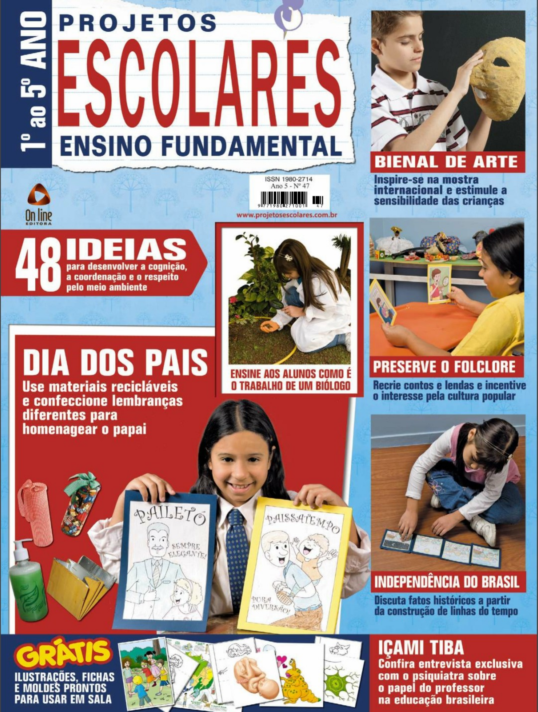 PROJETOS 1° ao 5° ANO ESCOLARES ENSINO FUNDAMENTAL BIENAL DE ARTE ISSN 1980-2714 Inspire-se na mostra Ano 5 47 internacional e estimule a sensibilidade das crianças 9771980271001 On line www.projetosescolares.com.br EDITORA 48 IDEIAS para desenvolver a cognição, a coordenação e respeito pelo meio ambiente DIA DOS PAIS ENSINE AOS ALUNOS COMO É PRESERVE FOLCLORE Use materiais recicláveis TRABALHO DE UM BIÓLOGO Recrie contos e lendas e incentive e confeccione lembranças interesse pela cultura popular diferentes para homenagear papai SEMPRE INDEPENDÊNCIA DO BRASIL Discuta fatos históricos a partir da construção de linhas do tempo GRÁTIS IÇAMI TIBA Confira entrevista exclusiva ILUSTRAÇÕES, FICHAS com psiquiatra sobre E MOLDES PRONTOS papel do professor PARA USAR EM SALA na educação brasileiraPara pensar parte dos Ser alunos, também professor de aquisição educador tudo da uma isso, do direção, que de é profissão o um conhecimento, ofício presenciar de professor mesmo. uma tanto! saber É deve Digo pressão que receber isso está de porque, um contribuindo Nada todos o aluno, merecido pode da muitas os acompanhar por comunidade. lados: ser para valor, insatisfações vezes, melhor por formar tanto o para o educador Mas cidadãos. por processo com um parte é Por da parece o salário, sociedade se pela esquecer como professor ineficiência por do seu ele acaba da papel coordenação, se na acomodando sociedade. pela e Levado falta não de cumpre estrutura mais e sua de interesse função de dos agente Para alunos, transformador. o rotina e fazer você pensar nesta a respeito edição, de uma tudo entrevista isso, a Projetos exclusiva livros oportunidade sempre A leitor, On "estremecer" publicados, Line faz tempo Escolares com parte Editora para o para como psiquiatra dessa ele sua enxergarmos Ensino melhorar está provoca, você história! comemorando Içami pode Fundamental e questiona recomeçar. Tiba. o Por conferir isso, Referência do e nesta critica 15 traz, preparamos educador anos edição com na de área firmeza. de muitas diversos e outra e também com "Ideias forma, É conquistas. mais uma concursos no que excelente afinal, de site 20 E www. há você, Você, enviar um de projeto fora do desenvolvido concurso Conte-nos cultural na sua como escola foi a experiência, e que tenha entre Basta alunos, pais e educadores. serão avaliados, destaque! e o vencedor Além feito seus será sucesso publicado resultados nas e conquistas. revistas para Projetos Todos continuar confira os Escolares aprimorando o regulamento com o merecido seu e aprendizado. inscreva-se! Acesse Faça a diferença! 3SUMÁRIO 05 Presentes criativos Comemore o Dia dos Pais e aproveite para usar materiais recicláveis que auxiliam na preservação ambiental. 08 - Valorize a cultura brasileira! Ajude os alunos a identificar informações folclóricas no cotidiano. 12 - Caminhos da de tempo cronológico e tempo histórico ao falar sobre os movimentos que motivaram a Independência do Brasil. Atividades práticas mostram aos alunos o dia 16 - Estudar a vida a dia da profissão de um biólogo. 23 - Novos olhares Use a Bienal de São Paulo para promover a reflexão sobre o olhar, o eu e o outro, o público e o privado. 26 - Embalagens divertidas coordenação motora e a criatividade das Estimule crianças com a a confeccção de presentes para a figura paterna. 28 - Agenda Confira as últimas novidades em eventos, locais para visitar e publicações voltadas à educação. Acolhimento na reunião de pais 29 Artigo dá dicas para promover um encontro e agradável. 30 Educação e liderança Confira entrevista exclusiva com o psiquiatra da Içami Tiba sobre o papel do professor e os rumos Educação. 34 - Bienal Internacional do Livro mais sobre a origem desse importante evento 2010. e Saiba programe-se para a edição que acontece em 34 Onde encontrar Contatos dos profissionais. e das empresas que colaboraram nesta edição. 4DIA DOS PAIS Presentes criativos Faça com alunos lembranças diferentes e úteis para comemorar o Dia dos Pais Anos: 1° ao 5° @cantinhodoprofessor Disciplinas: Ciências, Artes, Língua Portuguesa e Matemática Objetivos: Conceituais analisar posturas e atitudes; perceber a importância da figura paterna; conhecer receitas; trabalhar com o uso de materiais recicláveis que auxiliam na preservação ambiental Procedimentais - discutir e relacionar ações do cotidiano a posturas paternas; confeccionar presentes para Dia dos Pais Atitudinais - refletir e sensibilizar-se sobre posturas paternas para a diversidade de atitudes; interessar-se pela reutilização de materiais e preservação ambiental Responsável: a pedagoga Cristiane Boneto MEU PAI Molde MODO DE PREPARO Coloque a base do sabonete líquido em uma bacia de Materiais: cartões de Dia dos Pais plástico. Adicione a água aos poucos e mexa até diluir (prontos na folha de moldes); tesoura com bem. Adicione a essência e 0 extrato aos poucos e mis- ponta arredondada. ture. Pingue uma gota de corante para dar uma sua- COLOCANDO EM PRÁTICA ve. Coloque na embalagem. É muito provável que na sua sala de aula existam alunos COLOCANDO EM PRÁTICA com frágeis ou inexistentes vínculos paternos. Para lidar com essa situação, procure desenvolver um olhar refle- Este presente é útil para a maioria dos pais e pode ser xivo sobre a figura paterna, inclusive para que, quando confeccionado pelas próprias crianças. Os ingredientes os meninos crescerem e se tornarem pais, possam ter são de baixo custo e podem ser encontrados em farmá- uma postura mais adequada ou que as meninas possam cias de manipulação ou lojas de produtos de beleza. A cobrar de seus maridos, futuros pais de seus filhos, tal realização da atividade permite que os alunos desenvol- postura. vam as habilidades de medição e a coordenação motora. Para realizar esta reflexão, não evidencie os próprios pais das crianças. Apresente alguns personagens