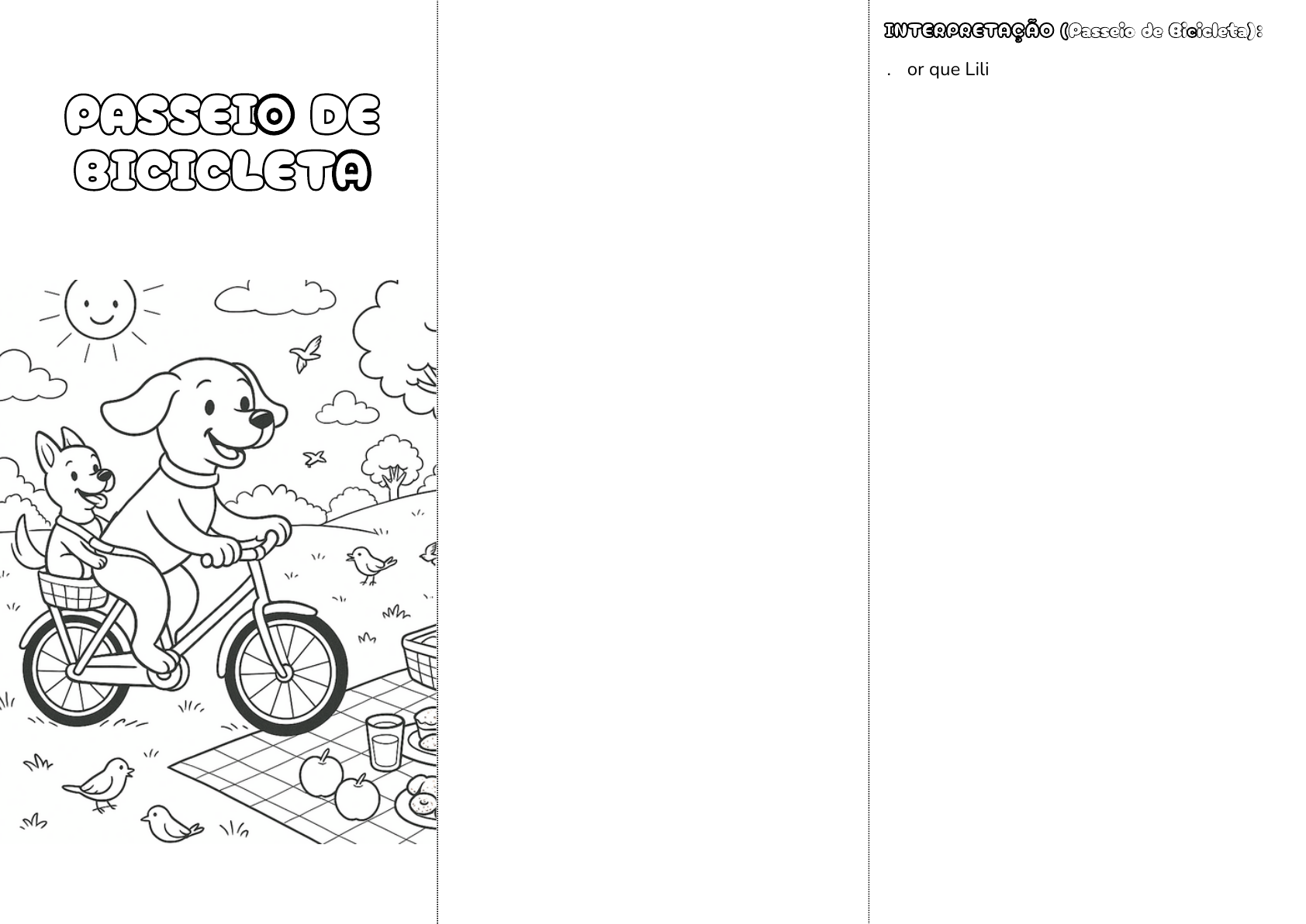 PASSEIO DE BICICLETA Era um lindo dia de sol quando a cadela Lili teve uma ideia divertida. Ela decidiu levar seu irmão, o cão Tadeu, para um passeio de bicicleta pelo bairro. Lili adorava pedalar e achou que seria uma ótima oportunidade para mostrar os lugares bonitos que conhecia. Tadeu ficou muito animado, mas também um pouco preocupado. Nunca tinha andado de bicicleta antes! Lili o tranquilizou e explicou que ele iria na garupa, bem seguro, com um cinto especial para cachorros. Assim, ele podia curtir o passeio sem medo. Eles saíram pedalando pelas ruas do bairro, passando por praças, jardins e até pela padaria da esquina, onde sempre ganhavam um biscoitinho canino. Tadeu olhava tudo com muita curiosidade, balançando o rabinho de felicidade. Depois de passear bastante, Lili levou o irmão até o parque. Lá, eles estenderam uma toalha xadrez de piquenique e tiraram das cestas várias delícias: sanduíches, bolinhos, biscoitos, maçãs e até um potinho de suco para a Lili. Eles passaram um tempo maravilhoso, explorando o parque, brincando e observando os passarinhos. Quando o sol começou a se pôr, Lili e Tadeu voltaram para casa, felizes e cheios de boas lembranças daquele dia tão especial. No dia seguinte, eles contaram a novidade para alguns amigos do bairro e combinaram de fazer outro passeio de bicicleta no próximo final de semana. PASSEIO DE BICICLETA PASSEIO DE BICICLETA INTERPRETAÇÃO (Passeio de Bicicleta):INTERPRETAÇÃO (Passeio de Bicicleta): 1. Por que Lili teve a ideia de fazer um passeio de bicicleta? A) Porque era dia de festa. B) Porque achou que Tadeu ia gostar. C) Porque Tadeu pediu para ela. D) Porque estava chovendo. 2. Onde Tadeu foi durante o passeio de bicicleta? A) Andando ao lado da bicicleta. B) No cesto da frente. C) Na garupa, com cinto de segurança. D) No colo da Lili. 3. O que eles levaram para o piquenique? A) Biscoitos, sanduíches, bolinhos, maçã e suco. B) Apenas um brinquedo. C) Arroz, feijão e carne. D) Bolos e sorvete. 4.Quais ambientes aparecem na história? A) Deserto, florestas e campo. B) Ruas do bairro, padaria e parque. C) Shopping e cinema. D) Biblioteca e mercado. 5. O que os dois fizeram depois do passeio de bicicleta? A) Fizeram uma soneca. B) Foram correr na areia. C) Contaram aos amigos e combinaram outro passeio. D) Foram para escola. 6. Como Tadeu se sentiu no início do passeio? A) Estava com medo. B) Estava muito desanimado. C) Estava dormindo. D) Estava preocupado. 7. O que Lili e Tadeu decidiram fazer no próximo final de semana? A) Estudar para uma prova. B) Fazer outro passeio de bicicleta. C) Visitar a escola. D) Ir ao cinema com amigos. FOLHAS SECAS Era uma tarde de inverno e o vento soprava forte, espalhando folhas secas por todo o quintal. A cadela Lili, muito caprichosa, pegou seu rastelo e começou a juntar todas as folhas que estavam caídas no chão. Ela trabalhou por um bom tempo, fazendo um montinho bonito de folhas no canto do jardim. Mas, de repente, escutou um barulho de passos. Quando olhou para trás, viu seu amigo Bolo, o gato travesso da vizinha, correndo em sua direção. Bolo pulou direto no monte de folhas, espalhando tudo de novo! Lili ficou um pouco brava, mas não resistiu ao ver o amigo tão feliz brincando com as folhas. Ela decidiu entrar na brincadeira também. Os dois correram, pularam e rolaram no meio das folhas secas, rindo muito. Depois de um tempo, cansados, sentaram-se juntos na grama para descansar. O sol estava se pondo e a brisa do fim de tarde deixava tudo ainda mais bonito. FOLHAS SECAS FOLHAS SECAS INTERPRETAÇÃO (FOLHAS SECAS):INTERPRETAÇÃO (FOLHAS SECAS): 1. O que Lili estava fazendo no jardim? A) Plantando flores. B) Var rendo as folhas do quintal. C) Brincando de bola. D) Correndo com Bolo. 2. Quem teve a ideia de brincar com as folhas? A) Lili. B) Bolo. C) A vizinha. D) Um menino. 3. Como Lili percebeu que era apenas uma brincadeira? A) Porque reconheceu que Bolo é brincalhão. B) Porque viu um brinquedo. C) Porque viu outro gato. D) Porque escutou um barulho. 4. O que os dois fizeram depois da brincadeira? A) Foram dormir. B) Foram embora. C) Sentaram-se. D) Juntaram as folhas de novo. 5. Qual era a estação do ano durante essa história? A) Verão. B) Inverno. C) Primavera. D) Outono. 6. Como Lili reagiu ao ver Bolo andando nas folhas? A) Ficou um pouco brava. B) Deu bronca no gato. C) Entrou na brincadeira. D) Se escondeu. 7. Que animal é Bolo, amigo de Lili? A) Raposinha B) Cão C) Urso D) Gato