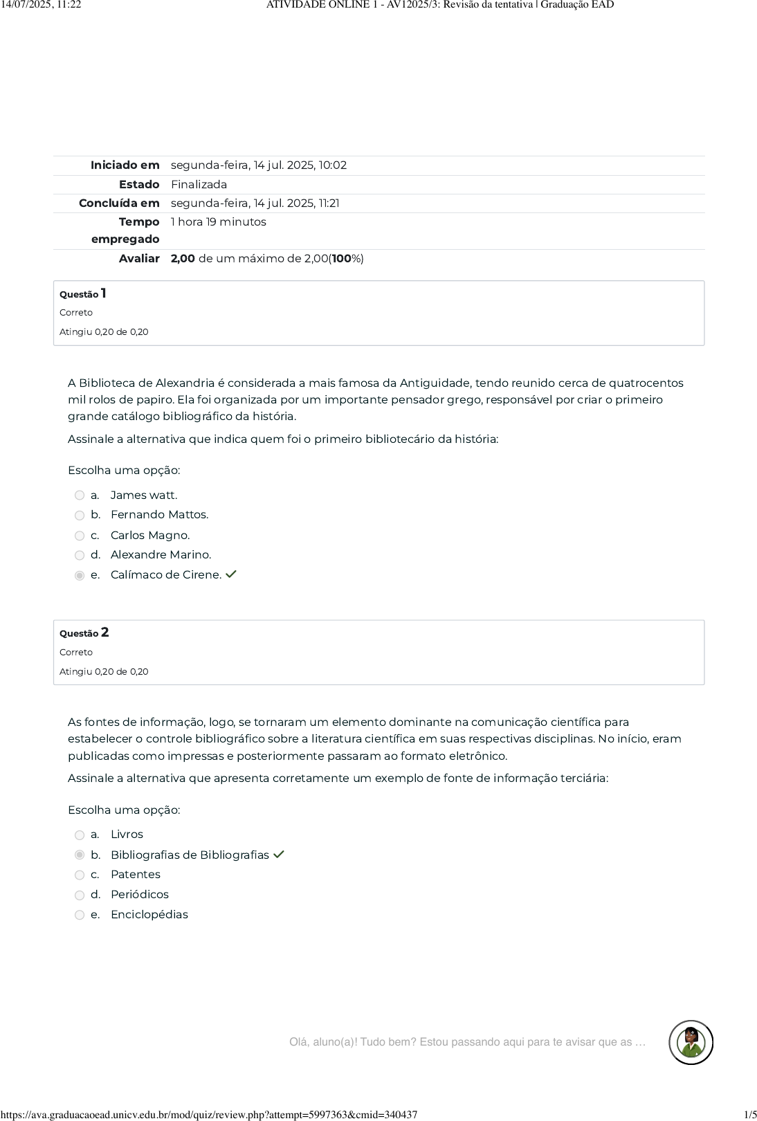 Iniciado em segunda-feira, 14 jul. 2025, 10:02 Estado Finalizada Concluída em segunda-feira, 14 jul. 2025, 11:21 Tempo empregado 1 hora 19 minutos Avaliar 2,00 de um máximo de 2,00(100%) Questão 1 Correto Atingiu 0,20 de 0,20 Questão 2 Correto Atingiu 0,20 de 0,20 A Biblioteca de Alexandria é considerada a mais famosa da Antiguidade, tendo reunido cerca de quatrocentos mil rolos de papiro. Ela foi organizada por um importante pensador grego, responsável por criar o primeiro grande catálogo bibliográfico da história. Assinale a alternativa que indica quem foi o primeiro bibliotecário da história: Escolha uma opção: a. James watt. b. Fernando Mattos. c. Carlos Magno. d. Alexandre Marino. e. Calímaco de Cirene. ✓ As fontes de informação, logo, se tornaram um elemento dominante na comunicação científica para estabelecer o controle bibliográfico sobre a literatura científica em suas respectivas disciplinas. No início, eram publicadas como impressas e posteriormente passaram ao formato eletrônico. Assinale a alternativa que apresenta corretamente um exemplo de fonte de informação terciária: Escolha uma opção: a. Livros b. Bibliografias de Bibliografias ✓ c. Patentes d. Periódicos e. Enciclopédias Olá, aluno(a)! Tudo bem? Estou passando aqui para te avisar que as … 14/07/2025, 11:22 ATIVIDADE ONLINE 1 - AV12025/3: Revisão da tentativa | Graduação EAD https://ava.graduacaoead.unicv.edu.br/mod/quiz/review.php?attempt=5997363&cmid=340437 1/5 Questão 3 Correto Atingiu 0,20 de 0,20 Questão 4 Correto Atingiu 0,20 de 0,20 Questão 5 Correto Atingiu 0,20 de 0,20 A competência informacional pressupõe análise crítica das fontes consultadas..Ao selecionar uma fonte de informação, o bibliotecário ou qualquer outro profissional da informação, deverá antes verificar alguns critérios avaliativos para o resultado da busca da informação. Quais os critérios o profissional da informação utilizará para a avaliação das obras impressas: Escolha uma opção: a. Autoridade, Precisão (acuidade), Imparcialidade (objetividade), Atualidade ✓ b. Precisão, Exatidão, Maleabilidade, Atualidade c. Conformismo, Banalidade, Exaustão, Autoridade d. Benevolência, Exatidão, Clareza, Precisão e. Exatidão, Difusão, Parcialidade, Especificidade Uma obra com autoridade é confiável e respeitada. Serve como referência importante em diversas áreas.Define-se como autor a pessoa física criadora de uma obra, seja ela de literatura, artes ou científica. Diante disso foi criada uma Lei para proteger os direitos autorais. Nesse sentido, assinale a alternativa que indica a Lei que protege os direitos autorais. Escolha uma opção: a. Lei nº14846/2024. b. Lei nº 14318/2022. c. Lei nº 9610/1998. ✓ d. Lei nº 13853/2019. e. Lei nº 13460/2017. A produção de livros em larga escala só foi possível a partir de um importante marco tecnológico no século XV. Essa inovação não apenas transformou o acesso à leitura e ao conhecimento, como também influenciou diretamente o surgimento de sistemas de organização da informação. O impacto foi tão expressivo que estimulou as bibliotecas a repensarem formas de controle e classificação bibliográfica. Assinale a alternativa que apresenta corretamente o nome do inventor da imprensa: Escolha uma opção: a. Gutenberg ✓ b. Napoleon Hill c. James watt d. Gesner e. Santos Dumont Olá, aluno(a)! Tudo bem? Estou passando aqui para te avisar que as … 14/07/2025, 11:22 ATIVIDADE ONLINE 1 - AV12025/3: Revisão da tentativa | Graduação EAD https://ava.graduacaoead.unicv.edu.br/mod/quiz/review.php?attempt=5997363&cmid=340437 2/5 Questão 6 Correto Atingiu 0,20 de 0,20 Questão 7 Correto Atingiu 0,20 de 0,20 Questão 8 Correto Atingiu 0,20 de 0,20 Para o acesso à busca da informação e sua localização correta, precisa-se de instrumentos de recuperação da informação. Esses instrumentos foram usados desde o início do Controle Bibliográfico Universal. Assinale a alternativa que apresenta os instrumentos de recuperação da informação. Escolha uma opção: a. MARC, ISSN, ISBN b. CDU, ISBN, ISSN ✓ c. CDD, MARC, depósito legal d. depósito legal, MARC, ISBN e. ISBN, Doris, MARC As fontes secundárias têm papel fundamental na organização do conhecimento, pois orientam o leitor na localização de informações primárias. Elas não apresentam dados inéditos, mas reúnem, interpretam ou sistematizam o conteúdo original, facilitando a recuperação da informação. Por esse motivo, são amplamente utilizadas por pesquisadores no início de suas buscas. Assinale a alternativa que apresenta corretamente um exemplo de fonte de informação secundária: Escolha uma opção: a. Livros b. Enciclopédias ✓ c. Bibliografias de Bibliografias d. Patentes e. Entrevista As classificações das fontes de informação em primárias, secundárias e terciárias são amplamente aceitas, mas nem sempre há consenso entre os autores quanto à categorização de certos tipos de documentos. Algumas fontes se situam em uma zona de transição, podendo ser classificadas de maneira diferente dependendo do critério adotado. Um exemplo clássico dessa divergência ocorre com determinados instrumentos de referência. Assinale a alternativa que corresponde a um tipo de fonte que, segundo diferentes autores, pode ser classificada como secundária ou terciária: Escolha uma opção: a. Patente b. Bibliografias ✓ c. Livro d. Bibliotecas e. Laboratórios Olá, aluno(a)! Tudo bem? Estou passando aqui para te avisar que as … 14/07/2025, 11:22 ATIVIDADE ONLINE 1 - AV12025/3: Revisão da tentativa | Graduação EAD https://ava.graduacaoead.unicv.edu.br/mod/quiz/review.php?attempt=5997363&cmid=340437 3/5 Questão 9 Correto Atingiu 0,20 de 0,20 As fontes de informação tem suas peculiaridades em relação à classificação, podendo ser fontes primárias, secundárias e terciárias. Podem também dentro desse panorama ser fontes especializad
