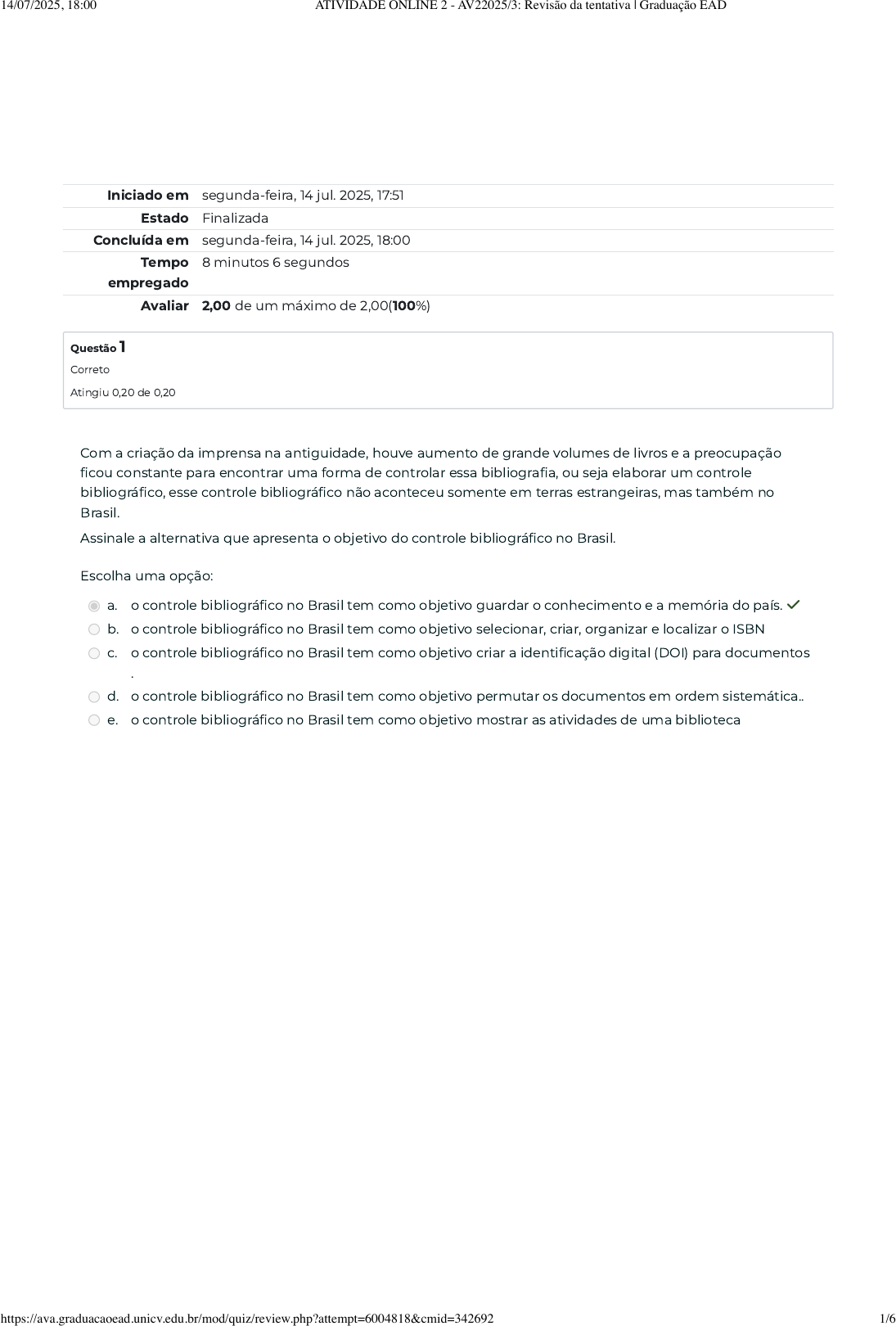 Iniciado em segunda-feira, 14 jul. 2025, 17:51 Estado Finalizada Concluída em segunda-feira, 14 jul. 2025, 18:00 Tempo empregado 8 minutos 6 segundos Avaliar 2,00 de um máximo de 2,00(100%) Questão 1 Correto Atingiu 0,20 de 0,20 Com a criação da imprensa na antiguidade, houve aumento de grande volumes de livros e a preocupação ficou constante para encontrar uma forma de controlar essa bibliografia, ou seja elaborar um controle bibliográfico, esse controle bibliográfico não aconteceu somente em terras estrangeiras, mas também no Brasil. Assinale a alternativa que apresenta o objetivo do controle bibliográfico no Brasil. Escolha uma opção: a. o controle bibliográfico no Brasil tem como objetivo guardar o conhecimento e a memória do país. ✓ b. o controle bibliográfico no Brasil tem como objetivo selecionar, criar, organizar e localizar o ISBN c. o controle bibliográfico no Brasil tem como objetivo criar a identificação digital (DOI) para documentos . d. o controle bibliográfico no Brasil tem como objetivo permutar os documentos em ordem sistemática.. e. o controle bibliográfico no Brasil tem como objetivo mostrar as atividades de uma biblioteca 14/07/2025, 18:00 ATIVIDADE ONLINE 2 - AV22025/3: Revisão da tentativa | Graduação EAD https://ava.graduacaoead.unicv.edu.br/mod/quiz/review.php?attempt=6004818&cmid=342692 1/6 Questão 2 Correto Atingiu 0,20 de 0,20 Questão 3 Correto Atingiu 0,20 de 0,20 O período da antiguidade foi um período de grandes acontecimentos marcantes, como a primeira biblioteca, o primeiro bibliotecário até as tentativas de controle bibliográfico para a organização da informação. De acordo com o que foi estudado desde a Antiguidade, leia as afirmativas abaixo: I. Com a invenção da imprensa ocorreu o crescimento elevado dos acervos das bibliotecas e livrarias, onde houve a necessidade de uma organização mais minuciosa. Começam a se usar títulos para a identificação das obras. II. O naturalista e bibliógrafo suíço Conrad Gessner publicou em 1545 a Bibliotheca Universalis, a primeira bibliografia de todos os livros conhecidos em hebraico, grego e latim após a invenção da imprensa, em ordem alfabética III. Na Antiguidade, foram evidentes as tentativas de organização da informação em bibliotecas, até mesmo em tabletes de argila, onde foram observadas algumas descrições de documentos. IV. Comprar livros nos mercados de livros de Atenas e Rodes era uma forma de aumentar a coleção, mas os Ptolomeus também recorreram a métodos mais extremos. Está correto o que se afirma em: Escolha uma opção: a. I e II, apenas. b. II e III, apenas. c. I, II, III e IV. ✓ d. I, II e III, apenas. e. I, II e IV, apenas. Em resposta à crescente necessidade de proteção contra alegações de violação de direitos autorais, instituições de ensino superior estão contratando especialistas em direitos autorais.Muitos aspectos práticos influenciam a escolha de criar um cargo de bibliotecário especializado em direitos autorais. O bibliotecário é peça fundamental em orientar o usuário a evitar o plágio. Assinale a alternativa que apresenta qual conceito se enquadra no Plágio. Escolha uma opção: a. O plágio é não fazer a cópia ou se apropriar de conteúdos da obra de uma pessoa, não indicando a autoria no trabalho acadêmico ou outro trabalho pesquisado. b. O plágio é fazer a cópia ou se apropriar de conteúdos da obra de uma pessoa, mas somente da obra impressa e não das obras eletrônicas. c. O plágio é fazer a cópia ou se apropriar de conteúdos da obra de uma pessoa, mas somente da obra eletrônica e não das obras impressas. d. O plágio é não fazer a cópia ou se apropriar de conteúdos da obra de uma pessoa, e não há necessidade de mencionar a autoria da obra em um trabalho acadêmico e. O plágio é fazer a cópia ou se apropriar de conteúdos da obra de uma pessoa, não indicando a autoria no trabalho acadêmico ou outro trabalho pesquisado. ✓ 14/07/2025, 18:00 ATIVIDADE ONLINE 2 - AV22025/3: Revisão da tentativa | Graduação EAD https://ava.graduacaoead.unicv.edu.br/mod/quiz/review.php?attempt=6004818&cmid=342692 2/6 Questão 4 Correto Atingiu 0,20 de 0,20 Questão 5 Correto Atingiu 0,20 de 0,20 Durante o Renascimento, a valorização da razão e do saber, aliada à invenção da imprensa por Gutenberg, provocou uma explosão na produção e circulação de livros. Essa nova realidade evidenciou a limitação dos modelos tradicionais de organização do conhecimento utilizados até então. Diante da crescente quantidade de obras e da necessidade de acesso eficiente à informação, estudiosos e instituições passaram a se preocupar com o ordenamento racional dos acervos. Nesse contexto, assinale a alternativa que indica a principal necessidade observada no período da Antiguidade e do Renascimento em relação ao crescimento da produção intelectual. Escolha uma opção: a. Estabelecer critérios de exclusão de obras obsoletas, visando à preservação da memória intelectual. b. Implantar sistemas informatizados para o controle bibliográfico e recuperação documental. c. Desenvolver métodos de organização bibliográfica diante da ampliação dos volumes e da diversidade temática das obras. ✓ d. Criar repositórios digitais para a conservação de manuscritos raros e obras de valor histórico. e. Reduzir a produção editorial por meio da regulamentação da impressão e da reprodução de textos. A revolução que começou com os bancos de dados bibliográficos científicos continua hoje com as tecnologias da Internet. As pesquisas dentro dos bancos de dados com foco na comunicação acadêmica devem utilizar os operadores booleanos. Diante disso, assinale a alternativa correta que indica a função dos operadores booleanos. Escolha uma opção: a. objetivo de recuperar os documentos, pois visam combinar e excluir termos de assuntos a serem pesquisados. ✓ b. definir e diferenciar o 