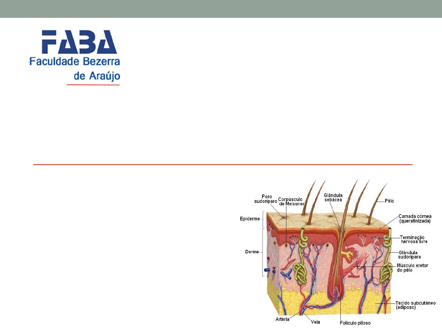 HISTOLOGIA Prof.ª Dr.ª Géssica Rocha email: gessi_ar@yahoo.com.br Pele Pele É um órgão formado por duas camadas fortemente aderidas: 1) Epiderme (Tecido epitelial pavimentoso estratificado queratinizado) 2) Derme (Tecido conjuntivo propriamente dito) Epiderme (Tecido epitelial) • É dividida em 5 camadas/estratos: 1. Córnea 2. Lúcida 3. Granulosa 4. Espinhosa 5. Basal Epiderme (Tecido epitelial) • É dividida em 5 camadas/estratos: 1. Córnea 2. Lúcida 3. Granulosa 4. Espinhosa 5. Basal Epiderme (Tecido epitelial) Queratinócito • Célula predominante nas 5 camadas da epiderme. *Só que em diferentes estágios de diferenciação. • Função: produção de queratina. Queratina: • Principal proteína estrutural da epiderme; • Impermeável à água→ ajuda no controle hídrico do corpo. Epiderme (Tecido epitelial) Camada basal: • Rica em células tronco de queratinócitos. * Nessa camada há intensa divisão celular contribuindo ativamente para a renovação da epiderme. A Epiderme possui grande renovação celular. Epiderme (Tecido epitelial) Camada espinhosa: • Constituída por queratinócitos com expansões citoplasmáticas contendo filamentos de queratina (aspecto espinhoso). *Gera coesão entre as células vizinhas → resistência ao atrito. Epiderme (Tecido epitelial) Camada espinhosa: • Constituída por queratinócitos com expansões citoplasmáticas contendo filamentos de queratina (aspecto espinhoso). *Gera coesão entre as células vizinhas → resistência ao atrito. Epiderme (Tecido epitelial) Camada granulosa: • Constituída por queratinócitos com o citoplasma carregado de grânulos. Epiderme (Tecido epitelial) Camada lúcida: • É uma camada delgada de queratinócitos com núcleo parcialmente digerido e poucas organelas (translúcidos no microscópio). Epiderme (Tecido epitelial) Camada lúcida: • É uma camada delgada de queratinócitos com núcleo parcialmente digerido e poucas organelas (translúcidos no microscópio). Epiderme (Tecido epitelial) Camada córnea: • Constituída por queratinócitos mortos e com citoplasma repleto de queratina. Epiderme (Tecido epitelial) Camada córnea: • É uma camada que descama continuamente; • A quantidade de queratina desta camada ajuda a proteger a pele. Epiderme (Tecido epitelial) - Pele espessa: Epiderme possui todas as camadas; A camada córnea é mais grossa. Ex.: Palma das mãos, planta dos pés e articulações. - Pele fina: Epiderme não possui a camada lúcida; A camada córnea é mais fina. Ex.: Restante do corpo. Epiderme (Tecido epitelial) • Células: Queratinócitos Melanócitos Células de Langerhans Células de Merkel Epiderme (Tecido epitelial) Melanócito • Célula dotada de prolongamentos. • Localizada na camada basal. Epiderme (Tecido epitelial) Melanócito • Função: produção de melanina. Melanina: • Pigmento marrom escuro (confere cor a pele). • Protege contras os raios ultravioleta. Epiderme (Tecido epitelial) Albinismo • Incapacidade hereditária dos melanócitos produzirem melanina. • Pela falta de melanina, a pele não tem proteção contra os raios solares, e os tumores de pele são mais frequentes. Epiderme (Tecido epitelial) Vitiligo • Degeneração e desaparecimento de melanócitos em certas áreas da pele, levando a despigmentação local da pele. Epiderme (Tecido epitelial) Célula de Langerhans • Presente em todas as camadas da epiderme. • Função: capturar antígenos e os apresentar as células de defesa. Epiderme (Tecido epitelial) Célula de Langerhans • Presente em todas as camadas da epiderme. • Função: capturar antígenos e os apresentar as células de defesa. Epiderme (Tecido epitelial) Célula de Merkel • Presente na camada basal da epiderme. • Função: captar estímulos mecânicos e transferir para nervos sensoriais (mecanoreceptora). Derme (Tecido conjuntivo propriamente dito) Possui duas camadas: - Papilar: mais superficial e mais fina (TCPD frouxo). presença das papilas dérmicas. * Saliências que aumentam o contato com a epiderme → maior coesão. - Reticular: mais profunda e mais espessa (TCPD denso não modelado). Slide 1: histologia Slide 2: Pele Slide 3: Epiderme (Tecido epitelial) Slide 4: Epiderme (Tecido epitelial) Slide 5: Epiderme (Tecido epitelial) Slide 6: Epiderme (Tecido epitelial) Slide 7: Epiderme (Tecido epitelial) Slide 8: Epiderme (Tecido epitelial) Slide 9: Epiderme (Tecido epitelial) Slide 10: Epiderme (Tecido epitelial) Slide 11: Epiderme (Tecido epitelial) Slide 12: Epiderme (Tecido epitelial) Slide 13: Epiderme (Tecido epitelial) Slide 14: Epiderme (Tecido epitelial) Slide 15: Epiderme (Tecido epitelial) Slide 16: Epiderme (Tecido epitelial) Slide 17: Epiderme (Tecido epitelial) Slide 18: Epiderme (Tecido epitelial) Slide 19: Epiderme (Tecido epitelial) Slide 20: Epiderme (Tecido epitelial) Slide 21: Epiderme (Tecido epitelial) Slide 22: Epiderme (Tecido epitelial) Slide 23: Derme (Tecido conjuntivo propriamente dito)