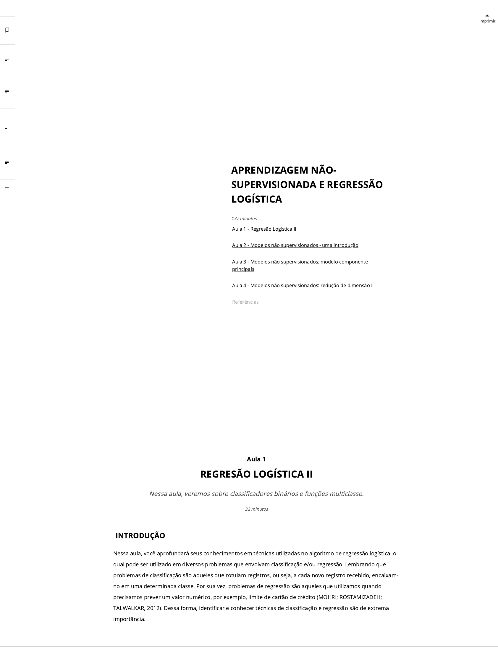 02/09/23, 22:58 wlldd_222_u2_mac_lea_ii https://www.colaboraread.com.br/integracaoAlgetec/index?usuarioEmail=frederico.sousa%40outlook.com&usuarioNome=FREDERICO+EMANUEL+GUIMARÃES+DE+SOUSA&disciplinaDescricao=&atividadeId=3… 1/21 Imprimir INTRODUÇÃO Nessa aula, você aprofundará seus conhecimentos em técnicas utilizadas no algoritmo de regressão logística, o qual pode ser utilizado em diversos problemas que envolvam classi�cação e/ou regressão. Lembrando que problemas de classi�cação são aqueles que rotulam registros, ou seja, a cada novo registro recebido, encaixam- no em uma determinada classe. Por sua vez, problemas de regressão são aqueles que utilizamos quando precisamos prever um valor numérico, por exemplo, limite de cartão de crédito (MOHRI; ROSTAMIZADEH; TALWALKAR, 2012). Dessa forma, identi�car e conhecer técnicas de classi�cação e regressão são de extrema importância. Aula 1 REGRESÃO LOGÍSTICA II Nessa aula, veremos sobre classi�cadores binários e funções multiclasse. 32 minutos APRENDIZAGEM NÃO- SUPERVISIONADA E REGRESSÃO LOGÍSTICA 137 minutos Aula 1 - Regresão Logística II Aula 2 - Modelos não supervisionados - uma introdução Aula 3 - Modelos não supervisionados: modelo componente principais Aula 4 - Modelos não supervisionados: redução de dimensão II Referências 02/09/23, 22:58 wlldd_222_u2_mac_lea_ii https://www.colaboraread.com.br/integracaoAlgetec/index?usuarioEmail=frederico.sousa%40outlook.com&usuarioNome=FREDERICO+EMANUEL+GUIMARÃES+DE+SOUSA&disciplinaDescricao=&atividadeId=3… 2/21 Nessa aula, você verá temas, como classi�cação multiclasse, classi�cação linear e não linear, um problema de classi�cação utilizando regressão logística e, claro, um estudo de caso para pôr em prática os conhecimentos adquiridos. CLASSIFICAÇÃO MULTICLASSE Ao se falar em classi�cação de dados, temos que ter em mente que existem inúmeras formas de ela ocorrer. Nessa aula, veremos sobre classi�cadores binários e funções multiclasse. Os classi�cadores binários conseguem classi�car bases de dados em duas classes, enquanto as funções multiclasse, encontradas também na literatura como classi�cadores multinomiais, têm a capacidade de identi�car mais de duas classes (GÉRON, 2019). Certos algoritmos utilizados para a classi�cação e regressão, como Random Forest, Naive-Bayes e Redes Neurais Convulsionais, são capazes de realizar classi�cações de múltiplas classes. Por outro lado, alguns algoritmos de classi�cação, como Máquinas de Vetores de Suporte (SVM), Classi�cação Lineares e Regressão Logística, suportam apenas classi�cações binárias. No entanto, é possível a utilização de técnicas com classi�cadores binários múltiplos, para realizar a classi�cação de múltiplas classes. Imagine um cenário em que é necessário criar um sistema que seja possível classi�car dez imagens numéricas, e ele possui apenas um algoritmo que se utiliza da estratégia de classi�cação binária. Uma maneira de solucionar a classi�cação dessas imagens seria a One-Versus-The-Rest (OvA), que tem a tradução literal de Um Contra Todos. Essa técnica funciona da seguinte maneira: treina-se dez classi�cadores binários, um para cada dígito, enumerados de 0 a 9. Para classi�car uma imagem, calcula-se a pontuação de decisão de cada classi�cador para a imagem. Para saber a qual classe a imagem pertence, basta selecionar qual classi�cador obteve a maior pontuação. Por sua vez, a estratégia One-versus-One (OvO), cuja tradução é Um Contra Um, treina um classi�cador binário para cada par de dígitos, ou seja, diferenciando 0s e 1s, 0s e 2s, 1s e 2s, e sucessivamente, até chegar ao número de classes do problema. Dessa maneira, se existem N classes, o algoritmo treinará classi�cadores. Com isso, o problema de classi�cação de imagem possuiria o seguinte número de classi�cadores , ou seja, 45 classi�cadores binários, sendo assim, a imagem que desejamos classi�car precisa passar pelos 45 classi�cadores e, a partir disso, analisar qual deles vence mais duelos. O classi�cador vencedor será a classe a que essa imagem pertence. A estratégia OvO tem sua vantagem principal na lógica de que cada classi�cador precisa apenas ser treinado para duas classes que deve distinguir na parte do conjunto de treinamento. Ao se utilizar de algoritmos de classi�cação binária, é importante veri�car o desempenho das duas estratégias (OvA e OvO), de forma que alguns algoritmos, ao se utilizarem da estratégia OvA, transpõem mal o tamanho do conjunto de treinamento. Dessa maneira, o OvO tem melhor desempenho, que é o caso do algoritmo SVM, pois é menos custoso falando em processamento, visto que é mais rápido treinar pequenos conjuntos de classi�cadores do que treinar grandes conjuntos em classi�cadores. Mas, como a�rma Géron (2019), a estratégia OvA é melhor para a maioria dos algoritmos de classi�cação binária. Para exempli�car um caso cotidiano do uso de funções multiclasse em algoritmos de Machine Learning, suponha que você é responsável por desenvolver um sistema de análise de risco de crédito para um banco. Esse sistema analisará o histórico de crédito do cliente, sua renda e o histórico de dívidas e pagamentos. Assim, após fazer a análise do cliente, o classi�cará em três classes de pagadores: bom, regular e ruim. Esse é um sistema multiclasse, pois pode classi�car um cliente em três classes possíveis de pagador. Caso o mesmo sistema, possuindo os mesmos atributos, classi�casse o cliente apenas como bom ou mal pagador, se basearia em uma técnica de classi�cação binária. VIDEOAULA: CLASSIFICAÇÃO MULTICLASSE O vídeo abordará conceitos de classi�cação, analogia das funções com a teoria de conjuntos e exemplo de classi�cação com uma base de dados para análise de risco de crédito. CLASSIFICA