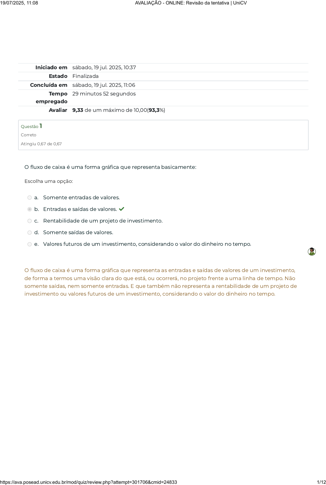 Iniciado em sábado, 19 jul. 2025, 10:37 Estado Finalizada Concluída em sábado, 19 jul. 2025, 11:06 Tempo empregado 29 minutos 52 segundos Avaliar 9,33 de um máximo de 10,00(93,3%) Questão 1 Correto Atingiu 0,67 de 0,67 Escolha uma opção: O fluxo de caixa é uma forma gráfica que representa basicamente: a. Somente entradas de valores. b. Entradas e saídas de valores. c. Rentabilidade de um projeto de investimento. d. Somente saídas de valores. e. Valores futuros de um investimento, considerando o valor do dinheiro no tempo. O fluxo de caixa é uma forma gráfica que representa as entradas e saídas de valores de um investimento, de forma a termos uma visão clara do que está, ou ocorrerá, no projeto frente a uma linha de tempo. Não somente saídas, nem somente entradas. E que também não representa a rentabilidade de um projeto de investimento ou valores futuros de um investimento, considerando o valor do dinheiro no tempo. 19/07/2025, 11:08 AVALIAÇÃO - ONLINE: Revisão da tentativa | UniCV https://ava.posead.unicv.edu.br/mod/quiz/review.php?attempt=301706&cmid=24833 1/12 Questão 2 Correto Atingiu 0,67 de 0,67 Escolha uma opção: As decisões tomadas pela empresa, sendo elas com base nos investimentos ou não, ocasionam resultados. Pode haver situações em que a empresa pretende realizar investimentos, no entanto, às vezes, é preciso fazer escolhas. A prática de análise de investimentos deve ser realizada: a. Quando a organização tiver mais projetos do que recursos disponíveis. Ela deve pedir empréstimos para instituições financeiras, para fazer todos os investimentos que pretende. b. Para decidir sobre um projeto de investimento. O melhor é verificar qual dos projetos tem o menor VPL. c. A análise de investimentos deve ser realizada de modo cauteloso e detalhado, com intuito de conhecer a saúde financeira da empresa, evitando prejuízos diante de aplicações de investimentos mal processadas. d. Na existência de recursos financeiros adicionais, pois a melhor decisão é não aprovar nenhum dos projetos de investimento. e. Na existência de projetos de investimentos aprovados e que têm vida útil diferente, pois a decisão sobre o projeto deve ser feita desconsiderando o cálculo do VPL. A análise de investimentos feita de forma rígida e detalhada busca conhecer a saúde financeira da empresa, prevenindo prejuízos diante de aplicações de investimentos malsucedidos. Se a organização tiver mais projetos de investimentos do que capital para investir, é preciso decidir entre um dos projetos. Na escolha pelo melhor projeto de investimento, o indicado é analisar qual deles apresenta um maior resultado relativo ao valor presente líquido. Na ocorrência de existirem recursos financeiros extras, é mais viável aprovar o projeto de investimento que demonstre o segundo maior VPL, e assim sucessivamente. Se existirem projetos de investimentos autorizados e com vida útil distinta, a decisão precisa estar fundamentada novamente no cálculo do VPL. 19/07/2025, 11:08 AVALIAÇÃO - ONLINE: Revisão da tentativa | UniCV https://ava.posead.unicv.edu.br/mod/quiz/review.php?attempt=301706&cmid=24833 2/12 Questão 3 Correto Atingiu 0,67 de 0,67 Escolha uma opção: Atualmente, direcionar recursos a qualquer área das empresas é uma tarefa que requer estudo e análises para que se encontre a melhor alternativa. Assim, quando se fala em investimento de capital, estamos nos referindo a: a. Um investimento que criará uma expectativa de gerar benefícios que não ultrapassem um ano, sendo assim considerado de longo prazo. b. Um investimento que criará uma expectativa de gerar benefícios que ultrapassem um ano, sendo assim considerado de longo prazo. c. Um investimento que criará uma expectativa de não gerar benefícios no período. d. Um investimento que criará uma expectativa de gerar benefícios que ultrapassem um ano, sendo assim considerado de curto prazo. e. Um investimento que criará uma expectativa de não gerar benefícios que não ultrapassem um ano, sendo assim considerado de curto prazo. O investimento de capital deve criar uma expectativa em longo prazo, ou seja, seus benefícios irão extrapolar o período de um ano. 19/07/2025, 11:08 AVALIAÇÃO - ONLINE: Revisão da tentativa | UniCV https://ava.posead.unicv.edu.br/mod/quiz/review.php?attempt=301706&cmid=24833 3/12 Questão 4 Correto Atingiu 0,66 de 0,66 Escolha uma opção: A árvore de decisão busca auxiliar as organizações diante de escolhas de quais projetos são viáveis aos seus investimentos. Sobre o processo de análise de investimentos mediante árvore de decisão, é correto afirmar que: a. O processo de árvore de decisão possibilita que uma empresa antecipe as dificuldades que encontrará, podendo, assim, organizar seus planejamentos já estabelecidos. b. Por meio da árvore de decisão, as decisões só podem ser tomadas depois de terem sido efetuados os investimentos. c. Posterior ao desenvolvimento da árvore de decisão, é impossível realizar o cálculo do payback e da taxa interna de retorno. d. Logo após elaborar a árvore de decisão, fica impossível realizar o cálculo do valor presente líquido (VPL). e. O processo da árvore de decisão impossibilita realinhar alterações nos investimentos. Posterior ao desenvolvimento da árvore de decisão, é possível efetuar o cálculo do VPL, do mesmo modo que os cálculos de taxa de retorno interno e payback. Por meio da árvore de decisão, é permitido à empresa antecipar suas dificuldades e, desse modo, ordenar seu planejamento já definido. Ainda, as análises sobre investimentos podem ser realizadas inclusive no momento de investir. O método de árvore de decisão auxilia no delineamento das mudanças nos investimentos. 19/07/2025, 11:08 AVALIAÇÃO - ONLINE: Revisão da tentativa | UniCV https://ava.posead.unicv.edu.br/mod/quiz/review.php?attempt=301706&cmid=24833 4/12 Questão 5 Correto Atingiu 0,66 de 0,66 Escolha u
