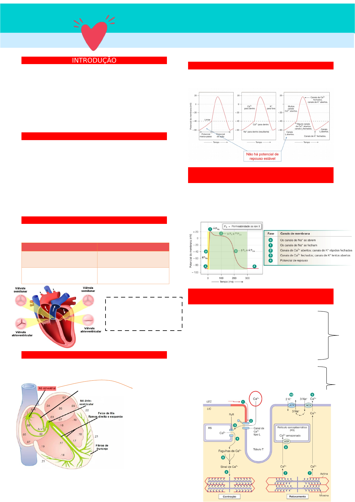 SISTEMA CARDIOVASCULAR - CORAÇÃO [Fisiologia humana] INTRODUÇÃO Coração = bomba pulsátil de duas câmaras (A e V) Localização: Mediastino médio Circulação: · Bomba D → C. Pulmonar (PQ) – Troca gasosa · Bomba E → C. Sistêmica (GC) – Corpo Todo ANATOMIA FISIOLÓGICA DO CORAÇÃO M. Cardíaco → Estriado e Involuntário Discos Intercalares (coordenação da contração) → Junções comunicantes (transferência rápida de sinais) Sincício (massa muscular interconectada) cardíaco → Sincício Atrial e Sincício Ventricular Movimentos: Sístole (contração) e diástole (relax.). APARELHOS VALVARES Direcionamento do fluxo sanguíneo – UNIDIRECIONAL Valvas Atrioventriculares Valvas Semilunares Atrioventricular direita (tricúspide) Semilunar direita (Válvula Pulmonar) Atrioventricular esquerda (mitral) Semilunar esquerda (Válvula Aórtica) Sons Cardíacos: · 1° Bulha: S. Atrioventricular · 2° Bulha: S. Semilunar E D (Bicúspide) (Tricúspide) EXCITAÇÃO RÍTMICA DO CORAÇÃO Excitação coordenada por um sistema especializado de condução elétrica. (Sistema de Purkinje)Vias intermodais Marca-Passo (Estabelece o ritmo cardíaco basal) EXCITAÇÃO RÍTMICA DO CORAÇÃO Potencial de ação do nó sinoatrial POTENCIAIS DE AÇÃO NO MÚSCULO CARDÍACO · Prolongado e com platô (despolarização prolongada) - evita tetania · Condução rápida Repolarização Despolarização BIOQUÍMICA DA CONTRAÇÃO E RELAXAMENTO CARDÍACO 1. Potencial de Membrana 2. Abertura dos VOC de Ca+ e seu influxo 3. Ca+ estimula liberação de Ca+ pelos RyRContração 4. Liberação local de Ca+ gera fagulhas 5. Soma das fagulhas gera um sinal 6. Ca+ se liga a troponina p/ gerar contração 7. Ca+ se desliga da troponina 8. Ca+ bombeado de volta para o RS Relaxamento 9. Ca+ trocado por Na+ pelo antiporte NCX 10. Gradiente de Na+ mantido pela ATPase ACOPLAMENTO EXCITAÇÃO – CONTRAÇÃO MUSCULAR CONDUÇÃO DA DESPOLARIZAÇÃO: Retardo Atrioventricular ELETROCARDIOGRAMA Registro dos eventos elétricos cardíacos Correlação entre um ECG e os eventos do coração: SÍSTOLES E DIÁSTOLES NO CICLO CARDÍACO DÉBITO CARDÍACO Quantidade de sangue bombeado pelo coração por unidade de tempo · FC = Frequência Cardíaca · VES = Volume de Ejeção Sistólico Debito cardíaco em repouso 5 litros / minuto Exercício intenso 25-35 litros / minuto (atletas) Retorno venoso: taxa de fluxo sanguíneo de volta ao coração REGULAÇÃO DO BOMBEAMENTO CARDÍACO Coração bombeia todo o sangue do retorno venoso. ↑ Enchimento ↑ Contração ↑ DC Modulação (Inervação) pelo SNA: · Simpático: ↑ Frequência e força contrátil · Parassimpático: ↓ Frequência Regulação da pressão arterial: · Pressão Diastólica: Arteríolas · Pressão Sistólica: Débito Cardíaco Hipertensão Arterial: Alta pressão sanguínea nas Aa. Obs: Diferença de pressão que gera fluxo IRRIGAÇÃO DO CORAÇÃO Artérias Coronárias direita e esquerda Isquemia: Infarto image5.png image6.png image7.png image8.png image9.png image10.png image11.png image1.png image2.jpeg image3.png image4.png