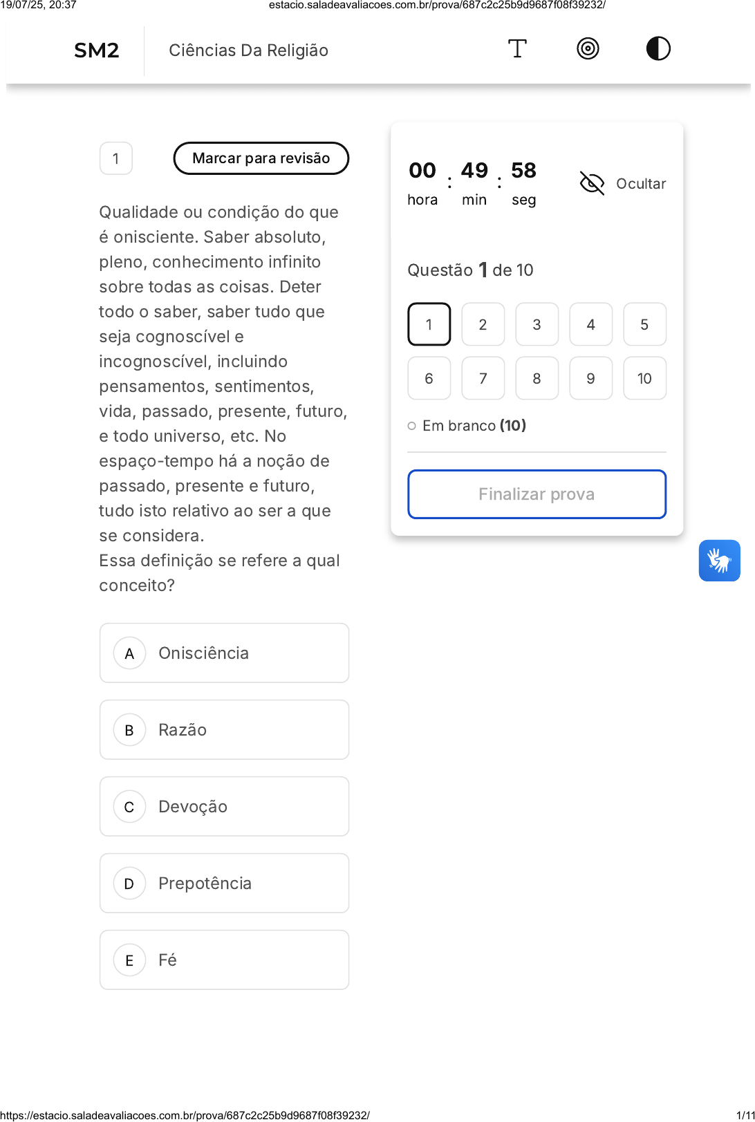 A B C D E 1 Marcar para revisão Qualidade ou condição do que é onisciente. Saber absoluto, pleno, conhecimento infinito sobre todas as coisas. Deter todo o saber, saber tudo que seja cognoscível e incognoscível, incluindo pensamentos, sentimentos, vida, passado, presente, futuro, e todo universo, etc. No espaço-tempo há a noção de passado, presente e futuro, tudo isto relativo ao ser a que se considera. Essa definição se refere a qual conceito? Onisciência Razão Devoção Prepotência Fé 00 hora : 49 min : 58 seg Ocultar Questão 1 de 10 Em branco (10) Finalizar prova 1 2 3 4 5 6 7 8 9 10 SM2 Ciências Da Religião 19/07/25, 20:37 estacio.saladeavaliacoes.com.br/prova/687c2c25b9d9687f08f39232/ https://estacio.saladeavaliacoes.com.br/prova/687c2c25b9d9687f08f39232/ 1/11 A B C D E 2 Marcar para revisão Busca explicar empiricamente as relações mútuas entre religião e sociedade. Os estudos fundamentam-se na dimensão social da religião e na dimensão religiosa da sociedade. Essa definição se atribui à: Sociologia da Religião Consciência Sociológica Mitologia Religiosa Existencialismo Social Antropologia da Religião 3 Marcar para revisão Questão 5 - Leia o pequeno trecho a seguir: "Quando a umbanda, o espiritismo, o pentecostalismo, o candomblé curam, suprimindo o mal físico ou a loucura, aplainando a crise existencial, repondo a certeza na ação, ainda que a ciência possa constatar tal mudança, 19/07/25, 20:37 estacio.saladeavaliacoes.com.br/prova/687c2c25b9d9687f08f39232/ https://estacio.saladeavaliacoes.com.br/prova/687c2c25b9d9687f08f39232/ 2/11 A B podendo até comprovar a eficácia terapêutica, não pode essa ciência interromper o sentido da experiência religiosa da cura. Estas religiões que curam são plurais e estão em constante transformação, manipulando símbolos culturais de uma espantosa diversidade. E essa diversidade mais se alarga e se alastra quanto mais se ampliam as distâncias sociais, econômicas e culturais no interior da sociedade brasileira." (Fonte: PIERUCCI, Antônio F.; PRANDI, Reginaldo. Assim como não era no princípio: Religião e ruptura na obra de Procópio Camargo. Novos Estudos, CEBRAP, São Paulo, n. 17, maio de 1987.).Sobre a relação entre religião e sociedade, é possível afirmar: Que as religiões curam e que o divino tem existência verdadeiramente social. Que as religiões não curam e que o divino tem existência social falsa. 19/07/25, 20:37 estacio.saladeavaliacoes.com.br/prova/687c2c25b9d9687f08f39232/ https://estacio.saladeavaliacoes.com.br/prova/687c2c25b9d9687f08f39232/ 3/11 C D E A B Que as religiões que buscam a cura, sendo plurais, estão em constante transformação. Que as religiões curam e que o divino tem existência verdadeira na sociedade. Que as religiões não curam e que o divino não tem existência social verdadeira. 4 Marcar para revisão Abaixo estão listadas três obras de um Antropólogo Funcionalista que liderou um movimento de crítica aos evolucionistas. Quem é esse Antropólogo? Argonautas do Pacífico Ocidental, de 1922 Uma teoria científica da cultura, de 1944 Uma teoria científica da cultura, de 1944 Bronislaw Malinowski James George Frazer 19/07/25, 20:37 estacio.saladeavaliacoes.com.br/prova/687c2c25b9d9687f08f39232/ https://estacio.saladeavaliacoes.com.br/prova/687c2c25b9d9687f08f39232/ 4/11 C D E A B C D E Marvin Harris Lewis Henry Morgan William Halse Rivers Rivers 5 Marcar para revisão método é característico da Antropologia e pode ser aplicado à religião. Consiste em um estudo de longo prazo a partir da convivência profunda com um grupo, uma tribo, etnia, sociedade, e do qual aprende a língua, os modos, costumes. Que método antropológico é esse? Etnográfico Literário Mítico Tecnicista Perceptivo 19/07/25, 20:37 estacio.saladeavaliacoes.com.br/prova/687c2c25b9d9687f08f39232/ https://estacio.saladeavaliacoes.com.br/prova/687c2c25b9d9687f08f39232/ 5/11 A B C D E 6 Marcar para revisão No livro O sagrado e o Profano o autor reflete que: ...Para o homem religioso, o espaço não é homogêneo, ou seja, o espaço apresenta rupturas e quebras; há porções de espaço qualitativamente diferentes das outras. Quem é o autor dessa obra? Mircea Eliade Martinho Lutero Santo Agostinho John Bunyan Thomas Merton 7 Marcar para revisão A palavra hierofania vem de duas palavras gregas: hierós e fanein (manifestar). Hierofania é então toda e qualquer manifestação do: 19/07/25, 20:37 estacio.saladeavaliacoes.com.br/prova/687c2c25b9d9687f08f39232/ https://estacio.saladeavaliacoes.com.br/prova/687c2c25b9d9687f08f39232/ 6/11 A B C D E Sagrado Político Econômico Técnico Artístico 8 Marcar para revisão Questão 2 - Leia este pequeno texto: Podemos retornar ainda mais no tempo, pois há evidências ainda mais antigas sobre o interesse de pensadores pelo estudo da religião, que rementem ao Séc. V a.C. Os filósofos pré-socráticos, na Grécia, denunciavam uma forte curiosidade pela religião. Parmênides (530-460 a. C.) e Empédocles (495-435 a.C.) teceram reflexões racionais sobre os deuses e mitos gregos; Demócrito (460-370 a. C.) interessou-se pelas religiões estrangeiras, especialmente as da babilônia; Heródoto (484-425 a. C.) descreveu religiões do Egito, Pérsia, Trácia e Cítia; Platão (429-347 a. C), estudou as 19/07/25, 20:37 estacio.saladeavaliacoes.com.br/prova/687c2c25b9d9687f08f39232/ https://estacio.saladeavaliacoes.com.br/prova/687c2c25b9d9687f08f39232/ 7/11 religiões bárbaras; Aristóteles (384-322 a. C) a degenerescência da religião; Teofrasto (372-287 a.C.), foi considerado o primeiro historiador grego das religiões, produzindo textos sobre a temática, divididos em 6 volumes. (Fonte: PRADO, André Pires do; SILVA JÚNIOR, Alfredo Moreira da. História das religiões, história religiosa e ciência da religião em perspectiva: trajetórias, métodos e distinções. Religare, João Pessoa, v.11, n.1, março de 2014, p.04-31, p. 4). 