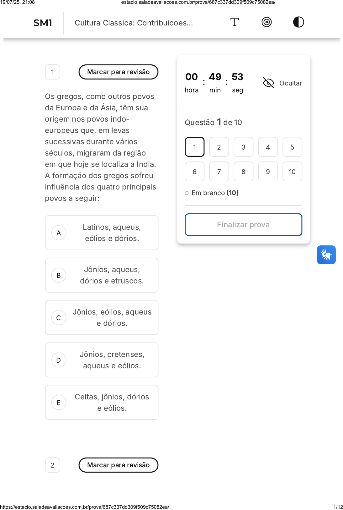 A B C D E 1 Marcar para revisão Os gregos, como outros povos da Europa e da Ásia, têm sua origem nos povos indo- europeus que, em levas sucessivas durante vários séculos, migraram da região em que hoje se localiza a Índia. A formação dos gregos sofreu influência dos quatro principais povos a seguir: Latinos, aqueus, eólios e dórios. Jônios, aqueus, dórios e etruscos. Jônios, eólios, aqueus e dórios. Jônios, cretenses, aqueus e eólios. Celtas, jônios, dórios e eólios. 2 Marcar para revisão 00 hora : 49 min : 53 seg Ocultar Questão 1 de 10 Em branco (10) Finalizar prova 1 2 3 4 5 6 7 8 9 10 SM1 Cultura Classica: Contribuicoes… 19/07/25, 21:08 estacio.saladeavaliacoes.com.br/prova/687c337dd309f509c75082ea/ https://estacio.saladeavaliacoes.com.br/prova/687c337dd309f509c75082ea/ 1/12 A B C D E As primeiras tentativas do homem de explicar a origem do mundo foram os mitos. Sabemos que os protagonistas dos mitos são os deuses, pois cabe a eles a criação ou a destruição. Nas lendas, por outro lado, temos: Narrativas de aventuras. Narrativas dos feitos dos heróis. Narrativas dos reis. Narrativas das deusas. Narrativas de atividades agrícolas. 3 Marcar para revisão A História da humanidade está marcada por muitos fatos, histórias, lendas, mitos e demais manifestações. Entre os variados fatos reais ou lendários, muitos foram os embates, conflitos e combates. A respeito da Guerra de Troia, podemos afirmar que 19/07/25, 21:08 estacio.saladeavaliacoes.com.br/prova/687c337dd309f509c75082ea/ https://estacio.saladeavaliacoes.com.br/prova/687c337dd309f509c75082ea/ 2/12 A B C D E É totalmente lendária. Troia e os heróis cantados por Homero jamais existiram. Teve como motivo mítico o rapto de Helena, esposa de Menelau, por Páris. É um fato histórico comprovado pelos poemas homéricos. Representa os heróis da Civilização Minóica. Simboliza a soberania de Atenas na Grécia clássica. 4 Marcar para revisão As filosofias helenísticas surgiram na Grécia como consequência de eventos históricos. O domínio macedônico faz com que os gregos passassem a duvidar de sua grandeza e de suas divindades. Tanto nas Artes como na Filosofia, este período é marcado por um certo intimismo, em que o homem grego deixa de pensar sobre a 19/07/25, 21:08 estacio.saladeavaliacoes.com.br/prova/687c337dd309f509c75082ea/ https://estacio.saladeavaliacoes.com.br/prova/687c337dd309f509c75082ea/ 3/12 A B C pólis e se volta para sua vida, sua família, seus amigos. Marque a alternativa em que podemos ver esse processo nas filosofias helenísticas. As correntes filosóficas do período helenístico buscam meios práticos para o homem viver feliz. As filosofias helenísticas trazem questionamentos sobre a origem do homem e de seu meio. As filosofias helenísticas traduzem as angústias dos homens gregos em busca de uma política mais igualitária. 19/07/25, 21:08 estacio.saladeavaliacoes.com.br/prova/687c337dd309f509c75082ea/ https://estacio.saladeavaliacoes.com.br/prova/687c337dd309f509c75082ea/ 4/12 D E As correntes filosóficas helenísticas trazem de volta a crença nos deuses e nos heróis do passado como incentivo para lutar contra a Macedônia. As filosofias helenísticas preocupam-se em buscar respostas sobre as questões da vida pós-morte. 5 Marcar para revisão Em torno da figura de Homero gira a composição dos dois grandes poemas épicos que possuem como temática a Guerra de Troia e o regresso dos heróis. A Ilíada e a Odisseia apresentam, contudo, diferenças bastante acentuadas. Marque a alternativa que identifique a oposição entre os poemas. 19/07/25, 21:08 estacio.saladeavaliacoes.com.br/prova/687c337dd309f509c75082ea/ https://estacio.saladeavaliacoes.com.br/prova/687c337dd309f509c75082ea/ 5/12 A B C D E A Ilíada narra os acontecimentos do primeiro ano da guerra de Tróia. A Ilíada apresenta os heróis da realeza micênica e a Odisseia heróis da realeza minoica. A Ilíada narra os heróis em um absoluto estado de guerra e a Odisseia traz os heróis em sua vida cotidiana. Na Ilíada Ulisses não aparece e na Odisseia ele é a personagem principal. Os deuses estão presentes apenas na Ilíada. 6 Marcar para revisão Na arquitetura da Antiguidade Clássica, três são os estilos originários da cultura grega: o estilo dórico, jônico e coríntio. Já entre os romanos, 19/07/25, 21:08 estacio.saladeavaliacoes.com.br/prova/687c337dd309f509c75082ea/ https://estacio.saladeavaliacoes.com.br/prova/687c337dd309f509c75082ea/ 6/12 A B C D E encontramos quais estilos ou ordens? Toscana e compósita. Toscana e italiana. Florentina e latina. Composta e italiana. Compósita e latina. 7 Marcar para revisão Como a matriz da cultura ocidental é a Antiguidade Clássica greco-romana, é importante se analisar duas grandes expressões da literatura latina: a Eneida (19 a.C.) e as Metamorfoses (8 d.C.). Analise as afirmativas a seguir: I. Em Metamorfoses, de Ovídio, encontram-se centenas de mutações que ocorrem tanto por vontade própria do transmutado como também por causas externas a ele; II. Uma das metamorfoses na obra de Ovídio é a conhecida transformação de Narciso em flor; 19/07/25, 21:08 estacio.saladeavaliacoes.com.br/prova/687c337dd309f509c75082ea/ https://estacio.saladeavaliacoes.com.br/prova/687c337dd309f509c75082ea/ 7/12 A B C D E III. Por ser muito antigo, o tema da metamorfose não resistiu ao tempo, ficando restrito a obras da Antiguidade Clássica. Está correto apenas o que se afirma em: I. II. III. I e II. II e III. 8 Marcar para revisão As Metamorfoses de Ovídio é uma obra com muitas narrativas míticas. Os diversos episódios se sucedem com um encadeamento narrativo. Além disso, o tema da transformação já constitui um elo entre elas, mas Ovídio mostra o seu engenho com mais refinamento ainda pelo fato de 19/07/25, 21:08 estacio.saladeavaliacoes.com.br/prova/687c337dd309f509c75082ea/ https://estacio.saladeavaliacoes.com.br/prova/687c337dd309f509