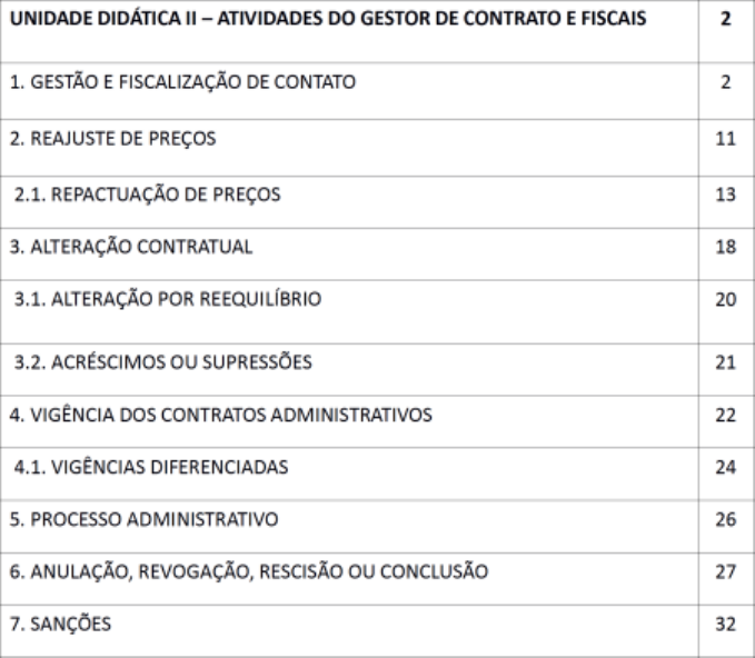SUMÁRIO UNIDADE DIDÁTICA II – ATIVIDADE DO GESTOR DE CONTRATO E FISCAIS OBJETIVOS: Conhecer as principais atividades pelo Gestor de Contrato e seus assessores, os Fiscais de contratos 1. GESTÃO E FISCALIZAÇÃO DE CONTATO As atividades de gestão e fiscalização da execução contratual estão previstas no art. 67 da LLC e art. 39 a 50 da IN 05/2017-PDG/MinEcon. São o conjunto de ações que tem por objetivo aferir o cumprimento dos resultados previstos pela Administração para os serviços contratados, verificar a regularidade das obrigações previdenciárias, fiscais e trabalhistas, bem como prestar apoio à instrução processual e o encaminhamento da documentação pertinente ao setor de contratos para a formalização dos procedimentos relativos a repactuação, alteração, reequilíbrio, prorrogação, pagamento, eventual aplicação de sanções, extinção dos contratos, dentre outras, com vista a assegurar o cumprimento das cláusulas avençadas e a solução de problemas relativos ao objeto. IN 05/2017-PDG/MinEcon Art. 40. O conjunto de atividades de que trata o artigo anterior compete ao gestor da execução dos contratos, auxiliado pela fiscalização técnica, administrativa, setorial e pelo público usuário, conforme o caso, de acordo com as seguintes disposições: I - Gestão da Execução do Contrato: é a coordenação das atividades relacionadas à fiscalização técnica, administrativa, setorial e pelo público usuário, bem como dos atos preparatórios à instrução processual e ao encaminhamento da documentação pertinente ao setor de contratos para formalização dos procedimentos quanto aos aspectos que envolvam a prorrogação, alteração, reequilíbrio, pagamento, eventual aplicação de sanções, extinção dos contratos, dentre outros; Art. 40. O conjunto de atividades de que trata o artigo anterior compete ao gestor da execução dos contratos, auxiliado pela fiscalização técnica, administrativa, setorial e pelo público usuário, conforme o caso, de acordo com as seguintes disposições: II - Fiscalização Técnica: é o acompanhamento com o objetivo de avaliar a execução do objeto nos moldes contratados e, se for o caso, aferir se a quantidade, qualidade, tempo e modo da prestação dos serviços estão compatíveis com os indicadores de níveis mínimos de desempenho estipulados no ato convocatório, para efeito de pagamento conforme o resultado, podendo ser auxiliado pela fiscalização de que trata o inciso V deste artigo; Portaria 37/2020 - SEF Art. 16. Ao Fiscal Técnico do Contrato incumbe: I - comparecer ao local da prestação do serviço, da realização da obra ou da entrega do material, confrontando a execução com as condições avençadas, como, por exemplo, especificação do objeto, forma de execução dos serviços e prazos; II - ler minuciosamente o contrato, conhecer o objeto e todos os serviços descritos no Projeto Básico/Termo de Referência e seus apensos; III - comunicar formalmente ao Gestor do Contrato as ocorrências, faltas ou defeitos observados, sugerindo, de forma clara e objetiva, as medidas necessárias para o fiel cumprimento do objeto; IV - conferir, nos aspectos quantitativo e qualitativo, o objeto contratual, avaliando o atendimento dos seguintes aspectos, quando for o caso: a. os resultados alcançados em relação ao contratado, com a verificação dos prazos de execução e da qualidade demandada; b. os materiais empregados; c. a adequação dos serviços prestados à rotina de execução estabelecida; d. o cumprimento das demais obrigações executivas decorrentes do contrato; e VI - conferir a relação de materiais, máquinas e equipamentos, conforme previsto em contrato; e. a satisfação do público usuário. V - rejeitar bens e serviços que estejam em desacordo com as especificações do objeto, conforme constante do contrato e do Projeto Básico/Termo de Referência, devendo atentar, também, para os prazos contratuais estabelecidos; VI - conferir a relação de materiais, máquinas e equipamentos, conforme previsto em contrato; VII - atestar, quando do recebimento provisório, as faturas/notas fiscais correspondentes às etapas executadas do contrato, após a verificação da conformidade dos serviços/obras, em coordenação, quando for o caso, com a Comissão de Recebimento e Exame, instituída conforme o disposto no Regulamento de Administração do Exército (RAE); VIII - confeccionar o Termo de Recebimento Provisório, quando da entrega do objeto, resultante de cada Ordem de Serviço ou de Fornecimento de Bens; IX - certificar-se se o número de empregados alocados ao serviço pela empresa contratada, para cada função em particular, está de acordo com o contrato firmado, mantendo sempre atualizada a respectiva relação nominal; X - manter, em formulário próprio (diário de obras/livro de fiscalização ou instrumento equivalente), o registro de todas as ocorrências relacionadas à execução contratual; XI - verificar se o contratado respeita as normas de segurança do trabalho, quando for o caso; e XII - Receber, ao término do contrato, o termo de quitação do contrato, assinado pela contratada, encaminhando-o ao Fiscal Administrativo, para posterior autuação nos autos do processo licitatório. X - manter, em formulário próprio (diário de obras/livro de fiscalização ou instrumento equivalente), o registro de todas as ocorrências relacionadas à execução contratual; III - Fiscalização Administrativa: é o acompanhamento dos aspectos administrativos da execução dos serviços nos contratos com regime de dedicação exclusiva de mão de obra quanto às obrigações previdenciárias, fiscais e trabalhistas, bem como quanto às providências tempestivas nos casos de inadimplemento; Portaria 37/2020 - SEF: Art. 18. Ao Fiscal Administrativo do Contrato incumbe: I - para os contratos com dedicação exclusiva de mão de obra, exigir do contratado os comprovantes de p