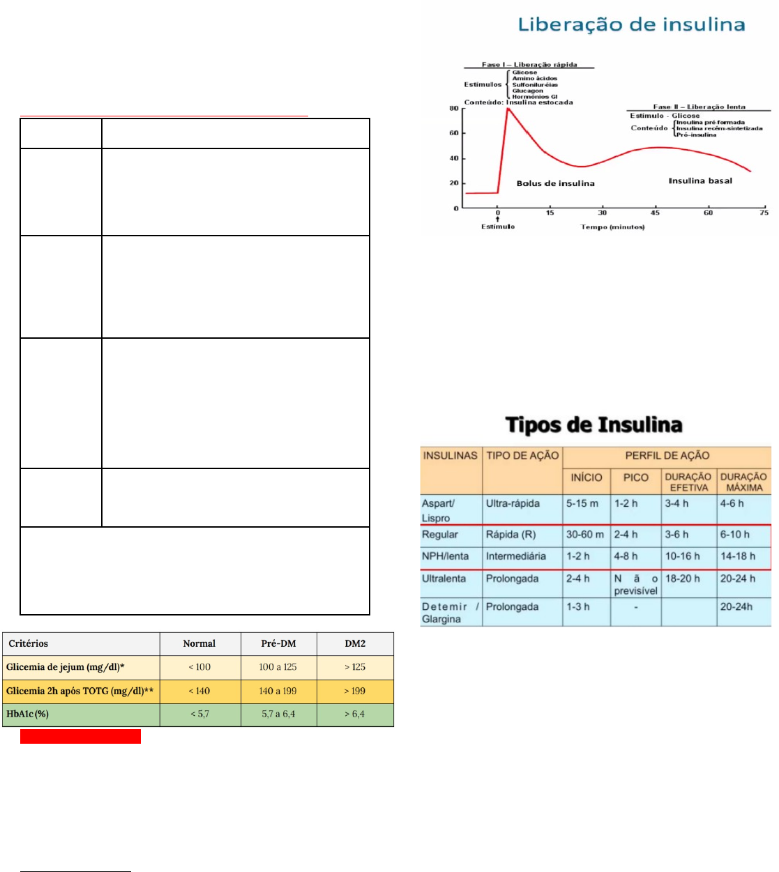 Farmacologia do diabetes insulinoterapia → Tratamento do diabetes tipo 1 - tipo 2 pode evoluir para insuficiência total da célula beta. -A insulinoterapia pode ser plena ou não. No início pode manter metformina, que é uma biguanida, sensibilizadora, associada a insulina. Os critérios diagnósticos para diabetes propostos pela american Diabetes Association, para 2017, estão resumidos na tabela 1: CRITÉRIOS DIAGNÓSTICOS PARA O DIABETES: Critérios Comentários A1C ≥6,5% = ou = O teste deve ser realizado através de método rastreável ao método do DCCT e devidamente certificado pelo National Glycohemoglobin Standardization Program (NGSP)(http://www.ngsp.org/certified.asp). glicemia de jejum ≥126 mg/dL = ou = O período de jejum deve ser definido como ausência de ingestão calórica por pelo menos 8 horas. Na ausência de hiperglicemia comprovada, os resultados devem ser confirmados com a repetição dos testes. glicemia 2 h após sobrecarga com 75 g de glicose: ≥200 mg/dL = ou = Em teste oral de tolerância à glicose. Esse teste deverá ser conduzido com a ingestão de uma sobrecarga de 75 g de glicose anidra, dissolvida em água, em todos os indivíduos com glicemia de jejum entre 100 mg/dL e 125 mg/dL. glicemia ao acaso ≥200 mg/dL Em pacientes com sintomas clássicos de hiperglicemia, ou em crise hiperglicêmica. Importante: a positividade de qualquer um dos parâmetros diagnósticos descritos confirma o diagnóstico de diabetes. Na ausência de hiperglicemia comprovada, os resultados devem ser confirmados com a repetição dos testes, exceto no TTG e na hiperglicemia comprovada. Quando insulinizar? → Diabetes -Insulinizar DM2 sempre que: -Insulinopênico: taxa de glicose muito elevada + os polis→ polidipsia, polifagia, emagrecimento exuberante, desidratação - já tem que ser iniciada a insulina. -HbA1C > 10% -Glicose >300 mg/ dL Quando insulinizar? -Diante dos sintomas de hiperglicemia no diagnostico ou em uso de ADO (anti diabético oral): · Poliúria · Polidipsia · Perda de peso -Em uso ADO (anti diabético oral) na melhor dose e mantendo hemoglobina glicada HbA1C > 7,5% · Descompensação · Cirurgia · Gestação · Doença renal ou hepática · Impossibilidade de utilizar os ADO → Liberação de insulina - como ocorre fisiologicamente falando: → Quando tem o estímulo inicial, no T0, onde tem a presença de glicose, aminoácidos e outros, tem-se a liberação da insulina estocada, um exemplo é quando acaba de almoçar, a insulina armazenada nos grânulos é liberada imediatamente, então vai fazer um pico de ação da insulina,denominado pós-prandial. Depois desse evento começa a fazer a liberação de insulinas pré-formadas que ainda nãos estão prontas ou recém-sintetizadas, a ideia é manter a insulina basal, manter a glicose entrando na célula. Então tem-se a insulina prandial e basal. → Com a insulinização busca-se imitar o que o corpo já faz *Insulina: Faz hipopotassemia (diminui potássio) → A NPH e a regular são as mais importantes, porque são essas que o SUS oferece; → A detemir e glargina, para os pacientes que podem pagar, faz uma insulina basal muito boa, não deixa fazer hipoglicemia e o efeito dura 24 h. → Para hoje, aprender que pode fazer uma insulina que dura 12 horas e pode fazer 2 vezes ao dia, para manter a insulina basal (NPH); → E outra chamada basal bolus, ou regular - rápida, para reduzir a glicemia do almoço e jantar, a duração dela é em torno de 3 a 6 horas . → A NPH vai tentar imitar o que a glargina e detemir faz em dose única, tenta fazer a basal. → Regular perto das refeições para combater o pico glicêmico e a NPH de forma contínua, para manter uma insulina basal no paciente ( o efeito da NPH é em torno de 12 h). → Regular= rápida; NPH= lenta Perfis de ação das insulinas → Regular: que tem ação de 3 a 4 horas e precisa ser usada perto das refeições, 20 minutos antes das refeições, para combater a hiperglicemia da comida. → NPH: a meta é fazer uma insulina basal. → As ultra rápidas→ tem que tomar antes de comer, mais tem que comer → Detemir e glargina fazem a insulina basal. Ajuste da dose da insulina Pode ser feito (pelo próprio paciente), em aumentos de 2, 4 ou 6 U (dependendo do valor das glicemias capilares do jejum, se consistentemente maiores do que 120, 140 ou 160 mg/ dL, respectivamente) a cada 3 dias até atingir o alvo de glicemico desde que não ocorra hipoglicemia noturna . → Se o paciente não for capaz de aferir a HGT, nem fazer insulina, aciona o serviço social que o técnico vai todo dia fazer insulina no paciente. → A ideia aqui é que o próprio paciente vá aumentado a insulina de forma gradual, de 2 em 2, dependendo das glicemias capilares. (lembrando que HGT não faz diagnóstico é a glicemia plasmática que faz). INICIANDO O TRATAMENTO Insulinoterapia -Os esquemas devem ser adaptados à vida do paciente, e não o oposto!!! Fase inicial do DM: (ainda há reserva pancreática para produção de insulina - “lua de mel” nessa fase entra com dose pequena, pois ainda tem as células beta funcionantes): os esquemas de uma única administração desse hormônios ao dia podem funcionar, mas isso pode acelerar a exaustão das ilhotas (desde o início, pelo menos duas administrações de insulina ao dia são recomendáveis). INSULINOTERAPIA NO DM2 - COMO INICIAR? → Insulinização basal (NPH antes de dormir - 10 a 12 horas de ação) · Antes de dormir: 10 Ul ou 0,2 Ul/Kg/dia. ( pode começar com 15 a 20 unidades de NPH, à noite. Também, um exemplo, paciente com 70 Kg → 70 X 0,2= 14 Ul) · Aumentar 2 Ul a cada 3 dias até glicemia de jejum 1,0 Ul/Kg/dia (pelo risco de hipoglicemia) · Associar insulina regular 0,1 Ul/Kg/dia fracionada antes das refeições (subtrair a dose de insulina regular do esquema basal) e mantemos ⅔ de insulina basal e ⅓ de insulina prandial. · Individualizar para cada paciente · Suspender secretagogo