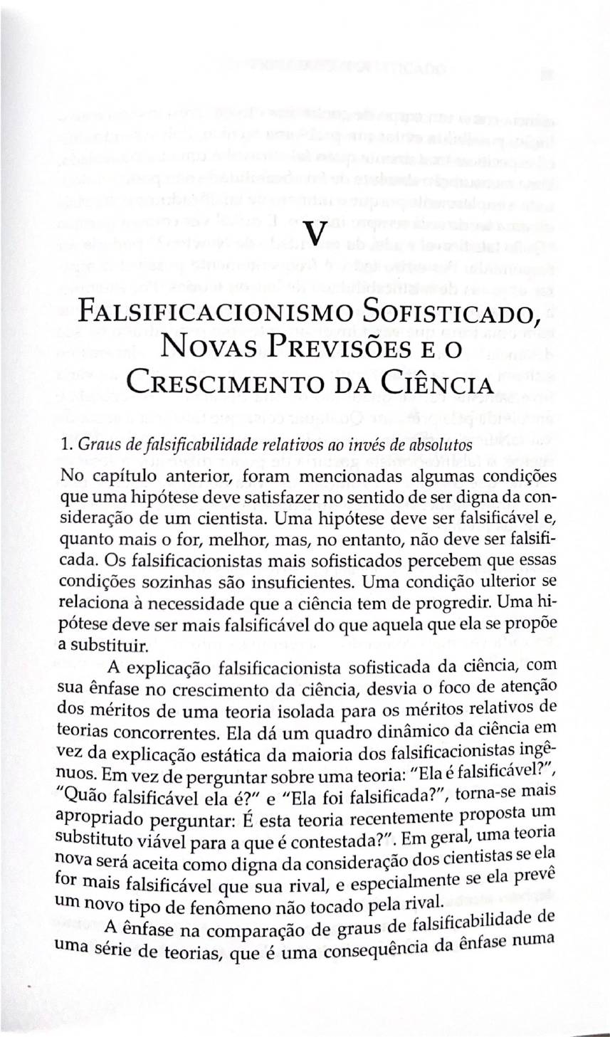 V FALSIFICACIONISMO SOFISTICADO, NOVAS PREVISÕES E CRESCIMENTO DA CIÊNCIA 1. Graus de falsificabilidade relativos ao invés de absolutos No capítulo anterior, foram mencionadas algumas condições que uma hipótese deve satisfazer no sentido de ser digna da con- sideração de um cientista. Uma hipótese deve ser falsificável e, quanto mais o for, melhor, mas, no entanto, não deve ser falsifi- cada. Os falsificacionistas mais sofisticados percebem que essas condições sozinhas são insuficientes. Uma condição ulterior se relaciona à necessidade que a ciência tem de progredir. Uma hi- pótese deve ser mais falsificável do que aquela que ela se propõe a substituir. A explicação falsificacionista sofisticada da ciência, com sua ênfase no crescimento da ciência, desvia o foco de atenção dos méritos de uma teoria isolada para os méritos relativos de teorias concorrentes. Ela dá um quadro dinâmico da ciência em vez da explicação estática da maioria dos falsificacionistas ingê- nuos. Em vez de perguntar sobre uma teoria: "Ela é falsificável?", "Quão falsificável ela é?" e "Ela foi falsificada?", torna-se mais apropriado perguntar: É esta teoria recentemente proposta um substituto viável para a que é contestada?". Em geral, uma teoria nova será aceita como digna da consideração dos cientistas se ela for mais falsificável que sua rival, e especialmente se ela prevê um novo tipo de fenômeno não tocado pela rival. A ênfase na comparação de graus de falsificabilidade de uma série de teorias, que é uma consequência da ênfase numaA. F. CHALMERS 78 como um corpo de conhecimento em crescimento e evo- ciência possibilita evitar um problema técnico. Pois é muito difí- cil mensuração absoluta de falsificabilidade não pode ser defi- lução, especificar exatamente quão falsificável é uma teoria Uma simplesmente porque o número de falsificadores potenciais nida, uma teoria será sempre infinito. É difícil ver como a questão "Quão de falsificável é a lei da gravidade de Newton?" poderia ser respondida. Por outro lado, é frequentemente possível compa- rar os graus de falsificabilidade de leis ou teorias. Por exemplo, a afirmação "Todos os pares de corpos se atraem mutuamente com uma força que varia inversamente com o quadrado de sua distância" é mais falsificável que a afirmação "Os planetas no sistema solar se atraem mutuamente com uma força que varia inversamente com o quadrado de sua distância". A segunda é envolvida pela primeira. Qualquer coisa que falsificar a segunda vai falsificar a primeira, mas o inverso não é verdadeiro. Ideal- mente, o falsificacionista gostaria de poder dizer que a série de teorias que constitui a evolução histórica de uma ciência é feita de teorias falsificáveis, cada uma da série sendo mais falsificável que sua predecessora. 2. Aumentando a falsificabilidade e modificações ad hoc A exigência de que, conforme a ciência progride, suas teorias de- vem se tornar cada vez mais falsificáveis, e, consequentemente, ter cada vez mais conteúdo e serem mais informativas, elimina as modificações nas teorias que são meramente projetadas para proteger uma teoria de uma falsificação que a ameaça. Uma mo- dificação numa teoria, tal como o acréscimo de um postulado extra ou uma mudança em algum postulado existente, que não ad tenha testáveis hoc. consequências O da teoria não-modificada testáveis, e que será já não chamada fossem de consequências modificação restante desta seção consistirá em exemplos designados para esclarecer a noção de uma modificação ad hoc. Primeiro considerar algumas modificações ad hoc o falsificacionista rejeitaria e, em seguida, estas serão contrastadas que com algumas modificações te, bem que não são ad hoc e consequentemen- a generalização Começo recebidas com pelo um falsificacionista. exemplo que seriam, trivial. Consideremos "O pão um Essa tanto teoria de nível baixo,FALSIFICACIONISMO SOFISTICADO 79 analisada mais detalhadamente, significa que, se o trigo cresce de maneira normal, é convertido em pão de maneira normal e é comido por humanos de maneira normal, então esses huma- nos estarão alimentados. Essa teoria, aparentemente inócua, teve problemas numa aldeia francesa numa ocasião em que o trigo havia crescido de maneira normal, convertido em pão de ma- neira normal e, no entanto, a maioria das pessoas que comeu o pão ficou gravemente enferma e morreu. A teoria "(Todo) o pão alimenta" foi falsificada. A teoria pode ser modificada para evi- tar esta falsificação, ajustando-se o seguinte: "(Todo) o pão, com a exceção daquela partida específica de pão produzida na aldeia francesa em questão, alimenta". Essa é uma modificação ad hoc. A teoria modificada não pode ser testada de nenhuma maneira que não seja também um teste da teoria original. consumo de qualquer pão por qualquer humano constitui um teste da teoria original, enquanto os testes da teoria modificada estão restritos ao consumo de um pão que não seja a partida de pão que levou a resultados tão desastrosos na França. A hipótese modificada é menos falsificável que a versão original. falsificacionista rejeita tais ações de resguardo. exemplo seguinte é menos horripilante e mais divertido. É um exemplo baseado num intercâmbio que realmente ocorreu no século XVII entre Galileu e um adversário aristotélico. Ten- do observado cuidadosamente a Lua através de seu telescópio recém-inventado, Galileu pôde registrar que a Lua não era uma esfera homogênea, mas que sua superfície abundava de monta- nhas e crateras. Seu adversário aristotélico teve de admitir que era realmente assim ao repetir a observação. Mas as observações ameaçavam uma noção fundamental para muitos aristotélicos, a saber, de que todos os corpos celestes são esferas perfeitas. rival de Galileu defendeu sua teoria diante da aparente falsifica- ção de uma m
