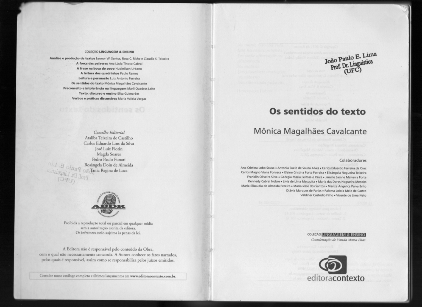 COLEÇÃO LINGUAGEM & ENSINO Análise e produção de textos Leonor W. Santos, Rosa C. Riche e Claudia Teixeira A força das palavras Ana Lúcia Tinoco Cabral A frase na boca do povo Hudinilson Urbano (UFC) A leitura dos quadrinhos Paulo Ramos Leitura e persuasão Luiz Antonio Ferreira Os sentidos do texto Mônica Magalhães Cavalcante Preconceito intolerância na linguagem Marli Quadros Leite Texto, discurso e ensino Elisa Guimarães Verbos e práticas discursivas Maria Valiria Vargas Os sentidos do texto Conselho Editorial Mônica Magalhães Cavalcante Ataliba Teixeira de Castilho Carlos Eduardo Lins da Silva José Luiz Fiorin Magda Soares Pedro Paulo Funari Colaboradores Rosângela Doin de Almeida Ana Cristina Lobo Sousa Antonia Suele de Souza Alves Carlos Eduardo Ferreira da Cruz Regina de Luca Carlos Magno Viana Fonseca Elaine Cristina Forte Ferreira Nogueira Teixeira Franklin Oliveira Silva Geórgia Maria Feitosa e Paiva Jamille Sainne Malveira Forte Kennedy Cabral Nobre Livia de Lima Mesquita Maria das Dores Nogueira Mendes Maria Elisaudia de Almeida Pereira Maria lesse dos Santos Mariza Angélica Paiva Brito Otávia Marques de Farias Paloma Loiola Melo de Castro Valdinar Custódio Filho Vicente de Lima Neto Proibida a reprodução total ou parcial em qualquer mídia sem a autorização escrita da editora. Os infratores estão sujeitos às penas da lei. COLEÇÃO LINGUAGEM & ENSINO Coordenação de Vanda Maria Elias A Editora não é responsável pelo conteúdo da Obra, com qual não necessariamente concorda. A Autora conhece os fatos narrados, pelos quais é responsável, assim como se responsabiliza pelos juízos emitidos. Consulte nosso catálogo completo e últimos lançamentos em www.editoracontexto.com.br editoracontextoCopyright © 2011 da Autora Na morte, não. Na vida. smil Todos os direitos desta edição reservados à Está na vida mistério. Editora Contexto (Editora Pinsky Ltda.) Em cada afirmação ou Abstinência. Na malícia Foto de capa Claude Monet, Le printemps (óleo sobre tela) Das plausíveis revelações, No suborno Montagem de capa Gustavo S. Vilas Boas Das silenciosas palavras. Diagramação Henriqueta Lisboa Claudio Filizzola Preparação de textos Lilian Aquino Revisão Rinaldo Milesi Dados Internacionais de Catalogação na Publicação (CIP) (Câmara Brasileira do Livro, SP, Brasil) Cavalcante, Mônica Magalhães Os sentidos do texto / Mônica Magalhães Cavalcante. São Paulo Contexto, 2012. Bibliografia. ISBN 978-85-7244-716-4 1. Análise de textos 2. Análise do discurso 3. Escrita 4. Redação 5. Textos I. Título. 12-02351 CDD-401.41 para catálogo sistemático: 1. Análise de textos Linguística 401.41 2. Textos Análise Linguística 401.41 2012 EDITORA CONTEXTO Diretor editorial: Jaime Pinsky Rua Dr. José Elias, 520 Alto da Lapa 05083-030 São Paulo SP PABX: (11) 3832 5838 Esta obra é dedicada à professora contexto@editoracontexto.com.br Vanda Maria Elias à sua inquietação com www.editoracontexto.com.br ensino da leitura e da escrita, à sua simplicidade generosa em dobrar mistérios da vida.000 Sumário Apresentação 11 Texto, contexto e coerência 15 1. Concepções de texto 16 2. Tipos de conhecimento e contextos 21 2.1. Tipos de contexto 27 3. Coerência textual 28 4. Os fatores de textualidade 33 Faça com seus alunos 40 Gêneros discursivos 43 1. Sobre interação, propósitos comunicativos e gêneros discursivos 442. A relação entre suporte e gênero do discurso 52 2. Anáforas 123 3. Gêneros digitais e hipertextualidade 54 3. Dêixis 127 Faça com seus alunos 56 3.1. Dêixis pessoal 130 3.2. Dêixis espacial 130 Sequências textuais 61 3.3. Dêixis temporal 132 1. A heterogeneidade composicional 4. Anáfora e dêixis 132 das sequências textuais 61 5. As funções textual-discursivas das 2. Classificação e caracterização expressões referenciais 133 das sequências textuais 64 Faça com seus alunos 142 Faça com seus alunos 77 145 Tópico discursivo 79 1. Conceituação 145 1. Conceituação 79 2. Copresença 147 2. Características do tópico discursivo 86 2.1. Citação 147 Faça com seus alunos 91 2.2. Plágio 149 2.3. Referência 150 Referenciação e compreensão de textos 95 2.4. Alusão 152 1. Conceitos básicos: referenciação, referente 3. Derivação 155 e expressão referencial 96 3.1. Paródia 155 2. Características da referenciação 102 3.2. Um tipo especial de paródia: 2.1. A atividade de referenciação é uma détournement 159 elaboração da realidade 103 3.3. Travestimento burlesco 161 2.2. A atividade de referenciação é uma negociação entre interlocutores 108 3.4. Pastiche 165 2.3. A atividade de referenciação é um 3.5. Paráfrase 167 trabalho sociocognitivo 111 Faça com seus alunos 168 Faça com seus alunos 114 Bibliografia 171 Expressões referenciais e suas funções no texto 121 1. Introdução referencial 121 A autora 175Apresentação Deste livro, participaram muitas mãos. Juntas, buscaram levar aos professores do ensino médio um artefato simples de consulta e um respaldo objetivo para as difíceis explicações que lhes são exigidas nas raladuras cotidianas da sala de aula. A temática da obra está centrada na compreensão e na pro- dução de textos, e para esse eixo convergem todos conceitos, cuidadosamente explicitados, que nos pareceram fundamentais para uma análise de textos de gêneros variados. propósito é (re)apresentar aos professores, em especial do ensino médio, um conjunto de parâmetros com quais eles poderão ajudar aluno a tecer OS sentidos e referentes dos textos que irão utilizar nas aulas de língua portuguesa. Elegemos sete parâmetros para essa empreitada, a cada um dos quais dedicamos um capítulo: a noção de texto e de12 13 contexto; gêneros textuais (ou discursivos); as sequências capítulo "Referenciação e compreensão de textos" nomeia e textuais; tópico textual-discursivo; as relações entre a refe- caracteriza um processo usado diariamente na