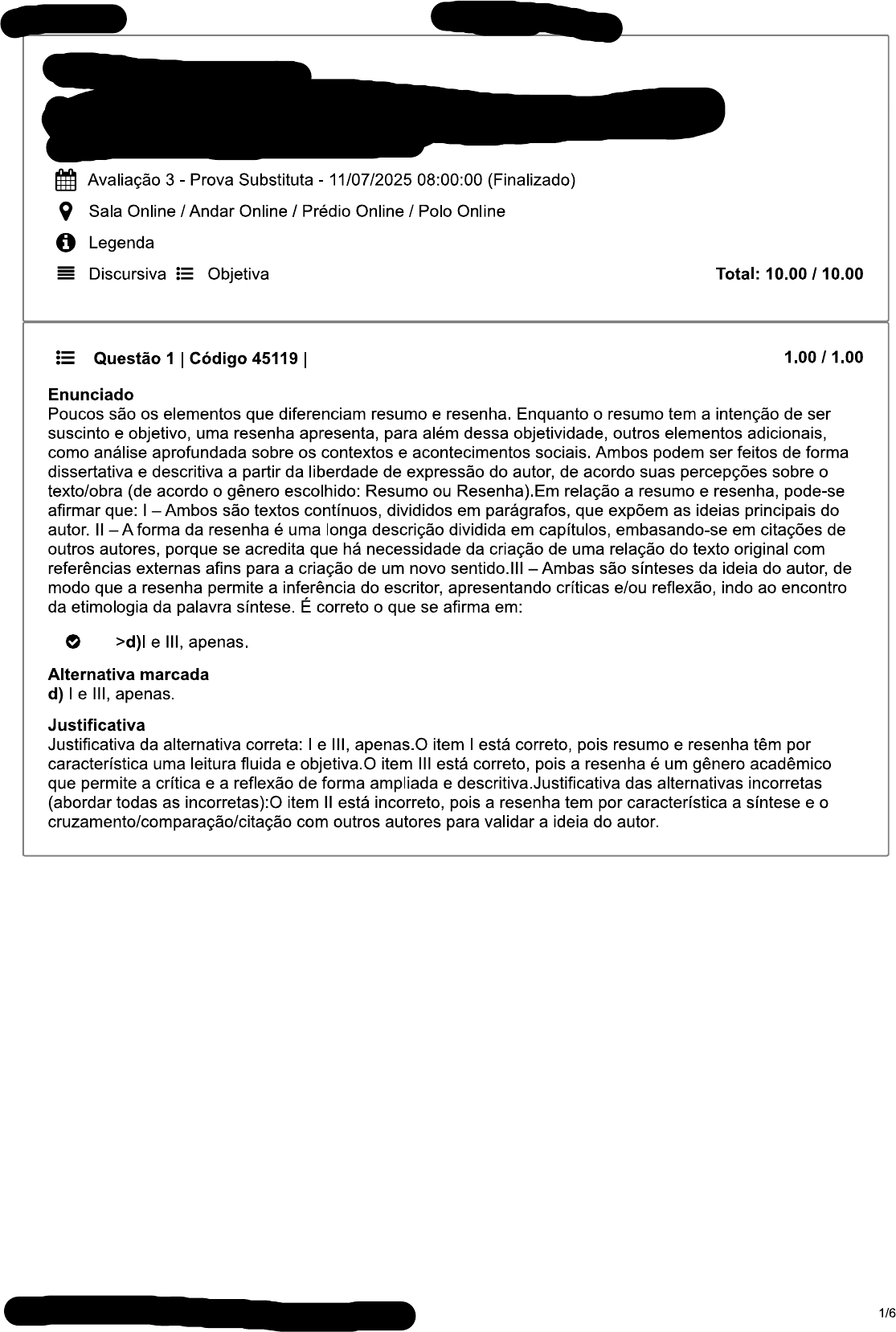 Avaliação 3 Prova Substituta 11/07/2025 08:00:00 (Finalizado) Sala Online / Andar Online / Prédio Online / Polo Online i Legenda Discursiva Objetiva Total: 10.00 10.00 Questão 1 Código 45119 1.00 1.00 Enunciado Poucos são os elementos que diferenciam resumo e resenha. Enquanto resumo tem a intenção de ser suscinto e objetivo, uma resenha apresenta, para além dessa objetividade, outros elementos adicionais, como análise aprofundada sobre os contextos e acontecimentos sociais. Ambos podem ser feitos de forma dissertativa e descritiva a partir da liberdade de expressão do autor, de acordo suas percepções sobre o texto/obra (de acordo o gênero escolhido: Resumo ou Resenha). Em relação a resumo e resenha, pode-se afirmar que: Ambos são textos contínuos, divididos em parágrafos, que expõem as ideias principais do autor. A forma da resenha é uma longa descrição dividida em capítulos, embasando-se em citações de outros autores, porque se acredita que há necessidade da criação de uma relação do texto original com referências externas afins para a criação de um novo sentido.III Ambas são sínteses da ideia do autor, de modo que a resenha permite a inferência do escritor, apresentando críticas e/ou reflexão, indo ao encontro da etimologia da palavra síntese. É correto que se afirma em: >d)I e III, apenas. Alternativa marcada d) e III, apenas. Justificativa Justificativa da alternativa correta: I e III, apenas.O item I está correto, pois resumo e resenha têm por característica uma leitura fluida e objetiva.O item III está correto, pois a resenha é um gênero acadêmico que permite a crítica e a reflexão de forma ampliada e descritiva. Justificativa das alternativas incorretas (abordar todas as item está incorreto, pois a resenha tem por característica a síntese e o cruzamento/comparação/citação com outros autores para validar a ideia do autor. 1/6Impressão da prova Questão 2 Código 42172 1.00 1.00 Enunciado A coesão e a coerência auxiliam na composição de um texto legível e compreensível, articulando ideias e permitindo o entendimento por parte do leitor quando ele identifica os significados e respostas das indagações no próprio texto, de acordo com os contextos das situações Considerando a usabilidade da coerência textual, identifique seus elementos: >c)Sequência, Constância, Concordância e Articulações. Alternativa marcada c) Sequência, Constância, Concordância e Articulações. Justificativa Justificativa da alternativa correta: Sequência, Constância, Concordância e Articulações. Sequência: pautada no desenvolvimento homogêneo e contínuo, sem quebra de pensamento; Constância: manter continuidade do conteúdo, evitando variações que permitam ambiguidade no texto; Concordância: afirmações contínuas sem caracterizar preposições contraditórias; Articulação: relação entre as partes, os fatos e suas representações, criando diálogo, conexão, Justificativa das alternativas incorretas (abordar todas as incorretas): Sistematização: apesar de um texto ser uma síntese, a sistematização atrapalha o desenvolvimento da ideia, sendo necessário cumprir a estruturas do resumo, no qual se pretende recortar as principais ideias, criando assim conectivos coerentes e coesos;Incoerências: o texto precisa ter coerência, fazer sentido, é um erro a composição e um texto sem conexão, sem responder a uma questão e/ou não possuir lógica; Discordância: um texto é composto por parágrafos e estes tem que ser concordantes, sem divergência entre si, que compõem a estruturação coesa e coerente; Dubiedade: o texto coerente e coeso busca a objetivação da ideia, não constituir duvidas, incertezas, possibilitando as desconfianças sobre a natureza textual. Questão 3 Código 51492 1.00 / 1.00 Enunciado Flamengo começou a partida no ataque, enquanto o Botafogo procurava fazer uma forte marcação no meio campo e tentar lançamentos para Victor Simões, isolado entre os zagueiros rubro-negros. Mesmo com mais posse de bola, o time dirigido por Cuca tinha grande dificuldade de chegar à área alvinegra por causa do bloqueio montado pelo Botafogo na frente de sua área. No entanto, na primeira chance rubro-negra, saiu o gol. Após cruzamento da direita de Ibson, a zaga alvinegra rabateu a bola de cabeça para o meio da área. Kléberson apareceu na jogada e cabeceou por cima do goleiro Renan. Ronaldo Angelim apareceu nas costas da defesa e empurrou para o fundo da rede Quase que em cima da linha: Flamengo 1 a Futebol.blogspot.com 20100 texto, que narra uma parte do jogo final do Campeonato Carioca de futebol, realizado em 2009, contém vários conectivos, sendo que: >d)mesmo traz ideia de concessão, já que com mais posse de bola", ter dificuldade não é algo naturalmente esperado. Alternativa marcada d) mesmo traz ideia de concessão, já que com mais posse de bola", ter dificuldade não é algo naturalmente esperado. Justificativa 2/6Impressão da prova Questão 4 Código 51493 1.00 / 1.00 Enunciado Identifique e relacione corretamente as partes de uma resenha:(1) Identificação(2) resumo(3) apreciação crítica Levantamento de questões acerca da leitura do documento, tais como: foi válida a leitura do livro? Por quê? Quais as principais contribuições? Quais as principais falhas?( ) referência bibliográfica completa do texto (conforme ABNT NBR apresentação das ideias principais e das secundárias que sustentam o pensamento de quem escreveu a obra. >c)3/1/2 Alternativa marcada c) 3/1/2 Justificativa Questão 5 Código 51499 1.00 1.00 Enunciado Assinale a opção que completa corretamente as lacunas da seguinte frase:\"O controle biológico de pragas, o texto faz referência, é certamente o mais eficiente e adequado recurso ... os lavradores dispõem para proteger a lavoura sem prejudicar o solo\". >b)a que, de que Alternativa marcada b) a que, de que Justificativa 3/6Impressão da prova Questão 6 