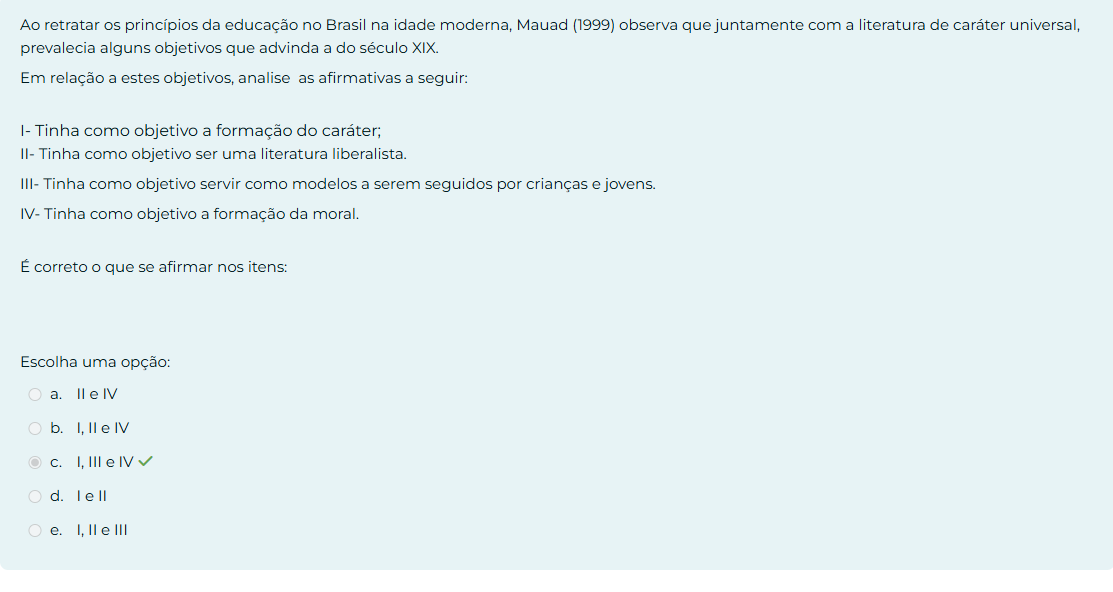 Ao retratar princípios da educação no Brasil na idade moderna, Mauad (1999) observa que juntamente com a literatura de caráter universal, prevalecia alguns objetivos que advinda a do século XIX. Em relação a estes objetivos, analise as afirmativas a seguir: Tinha como objetivo a formação do caráter; II- Tinha como objetivo ser uma literatura liberalista. III- Tinha como objetivo servir como modelos a serem seguidos por crianças e jovens. IV- Tinha como objetivo a formação da moral. correto O que se afirmar nos itens: Escolha uma opção: a. II e IV b. e IV C. e IV d. e II e. II e III