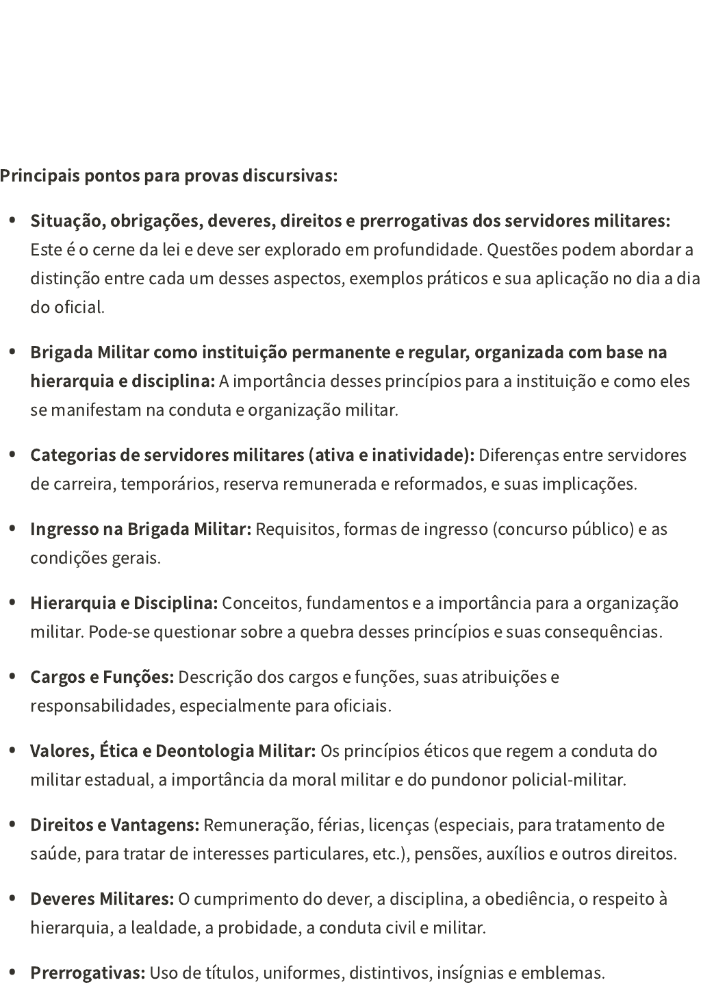 Lei Complementar Estadual nº 10.990/97 - Estatuto dos Militares Estaduais da Brigada Militar Principais pontos para provas discursivas: • Situação, obrigações, deveres, direitos e prerrogativas dos servidores militares: Este é o cerne da lei e deve ser explorado em profundidade. Questões podem abordar a distinção entre cada um desses aspectos, exemplos práticos e sua aplicação no dia a dia do oficial. • Brigada Militar como instituição permanente e regular, organizada com base na hierarquia e disciplina: A importância desses princípios para a instituição e como eles se manifestam na conduta e organização militar. • Categorias de servidores militares (ativa e inatividade): Diferenças entre servidores de carreira, temporários, reserva remunerada e reformados, e suas implicações. • Ingresso na Brigada Militar: Requisitos, formas de ingresso (concurso público) e as condições gerais. • Hierarquia e Disciplina: Conceitos, fundamentos e a importância para a organização militar. Pode-se questionar sobre a quebra desses princípios e suas consequências. • Cargos e Funções: Descrição dos cargos e funções, suas atribuições e responsabilidades, especialmente para oficiais. • Valores, Ética e Deontologia Militar: Os princípios éticos que regem a conduta do militar estadual, a importância da moral militar e do pundonor policial-militar. • Direitos e Vantagens: Remuneração, férias, licenças (especiais, para tratamento de saúde, para tratar de interesses particulares, etc.), pensões, auxílios e outros direitos. • Deveres Militares: O cumprimento do dever, a disciplina, a obediência, o respeito à hierarquia, a lealdade, a probidade, a conduta civil e militar. • Prerrogativas: Uso de títulos, uniformes, distintivos, insígnias e emblemas. • Violação das Obrigações e Deveres: As infrações disciplinares, as transgressões e as sanções correspondentes. (Embora o Regulamento Disciplinar seja mais específico, o Estatuto estabelece as bases). • Conselhos de Justificação e Disciplina: Finalidade, composição e procedimentos desses conselhos para apuração de transgressões disciplinares graves ou incapacidade moral/profissional. • Disposições sobre a agregação, reversão, reforma e demissão: As condições e procedimentos para cada uma dessas situações. • Disposições transitórias e finais: Qualquer regra específica que possa ter impacto na carreira do oficial. Possíveis perguntas discursivas: 1. Discorra sobre os princípios da hierarquia e disciplina na Brigada Militar do Rio Grande do Sul, conforme a Lei Complementar Estadual nº 10.990/97, e explique como a manutenção desses princípios é fundamental para a eficácia da instituição. Apresente exemplos de situações em que a quebra desses princípios pode comprometer a ordem pública. 2. Analise os direitos e deveres dos servidores militares estaduais da Brigada Militar, conforme o Estatuto dos Militares Estaduais (Lei Complementar Estadual nº 10.990/97). Destaque a importância da conduta ética e do pundonor policial-militar para a imagem da corporação e para a confiança da sociedade. 3. Explique as diferentes situações em que um servidor militar estadual pode se encontrar (ativa e inatividade), detalhando as características de cada uma e as implicações para a prestação do serviço militar. Aborde, especificamente, a situação dos servidores militares de carreira e dos temporários. 4. Descreva o processo de ingresso na Brigada Militar do Rio Grande do Sul para o cargo de Oficial, conforme a Lei Complementar Estadual nº 10.990/97, e discorra sobre os requisitos e etapas envolvidas. Qual a importância do concurso público para a seleção dos futuros oficiais? 5. Aborde as prerrogativas dos servidores militares estaduais e como elas se relacionam com as obrigações e deveres previstos na Lei Complementar Estadual nº 10.990/97. Discuta a responsabilidade inerente ao uso dessas prerrogativas. Lei Complementar Estadual nº 10.991/97 - Lei de Organização Básica da Brigada Militar Principais pontos para provas discursivas: • Organização Básica da Brigada Militar: A estrutura organizacional da corporação, incluindo os órgãos de direção, execução e apoio. Questões podem abordar a hierarquia organizacional e as competências de cada órgão. • Comando-Geral: Atribuições e competências do Comandante-Geral da Brigada Militar, sua posição na hierarquia e responsabilidades administrativas e operacionais. • Estado-Maior: Função, composição e atribuições do Estado-Maior da Brigada Militar como órgão de assessoramento do Comando-Geral. • Órgãos de Execução: Estrutura e funcionamento dos Comandos Regionais de Policiamento Ostensivo (CRPOs), Batalhões de Polícia Militar (BPMs) e outras unidades operacionais. • Órgãos de Apoio: Departamentos e seções que prestam apoio administrativo, logístico e técnico à corporação. • Corregedoria-Geral: Competências e atribuições da Corregedoria-Geral da Brigada Militar no controle interno e disciplinar da corporação. • Competências da Brigada Militar: As atribuições constitucionais e legais da corporação, incluindo policiamento ostensivo, preservação da ordem pública, policiamento de trânsito, entre outras. • Subordinação e Vinculação: A subordinação da Brigada Militar ao Governador do Estado e sua vinculação à Secretaria da Segurança Pública. • Planejamento e Coordenação: Como se dá o planejamento das atividades policiais e a coordenação entre os diversos órgãos da corporação. • Distribuição Territorial: A organização territorial da Brigada Militar e a distribuição das unidades pelo Estado do Rio Grande do Sul. Possíveis perguntas discursivas: 1. Analise a estrutura organizacional da Brigada Militar do Rio Grande do Sul conforme a Lei Complementar Estadual nº 10.991/97. Discorra sobre a importância da organiza