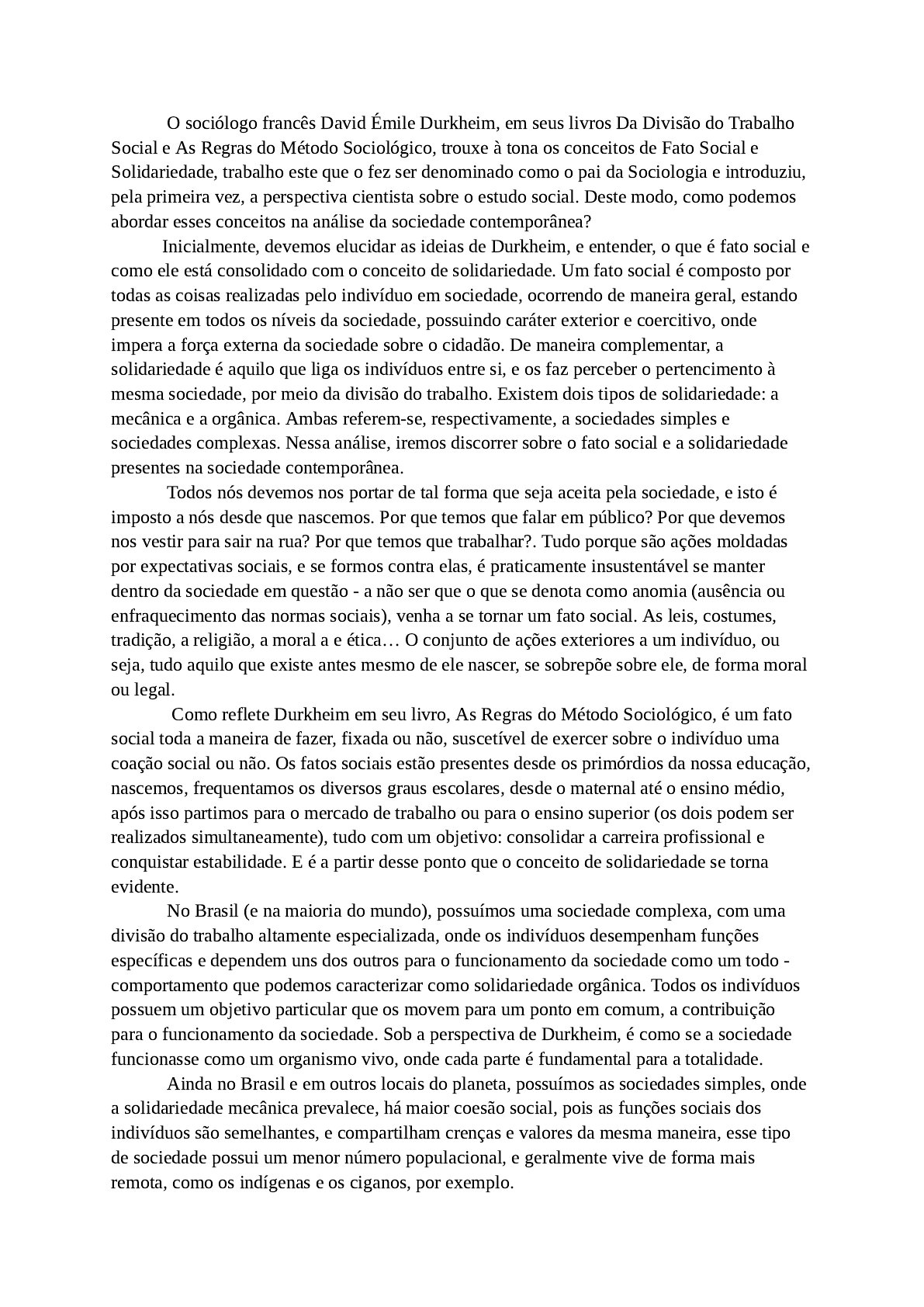 O sociólogo francês David Émile Durkheim, em seus livros Da Divisão do Trabalho Social e As Regras do Método Sociológico, trouxe à tona os conceitos de Fato Social e Solidariedade, trabalho este que o fez ser denominado como o pai da Sociologia e introduziu, pela primeira vez, a perspectiva cientista sobre o estudo social. Deste modo, como podemos abordar esses conceitos na análise da sociedade contemporânea? Inicialmente, devemos elucidar as ideias de Durkheim, e entender, o que é fato social e como ele está consolidado com o conceito de solidariedade. Um fato social é composto por todas as coisas realizadas pelo indivíduo em sociedade, ocorrendo de maneira geral, estando presente em todos os níveis da sociedade, possuindo caráter exterior e coercitivo, onde impera a força externa da sociedade sobre o cidadão. De maneira complementar, a solidariedade é aquilo que liga os indivíduos entre si, e os faz perceber o pertencimento à mesma sociedade, por meio da divisão do trabalho. Existem dois tipos de solidariedade: a mecânica e a orgânica. Ambas referem-se, respectivamente, a sociedades simples e sociedades complexas. Nessa análise, iremos discorrer sobre o fato social e a solidariedade presentes na sociedade contemporânea. Todos nós devemos nos portar de tal forma que seja aceita pela sociedade, e isto é imposto a nós desde que nascemos. Por que temos que falar em público? Por que devemos nos vestir para sair na rua? Por que temos que trabalhar?. Tudo porque são ações moldadas por expectativas sociais, e se formos contra elas, é praticamente insustentável se manter dentro da sociedade em questão - a não ser que o que se denota como anomia (ausência ou enfraquecimento das normas sociais), venha a se tornar um fato social. As leis, costumes, tradição, a religião, a moral a e ética… O conjunto de ações exteriores a um indivíduo, ou seja, tudo aquilo que existe antes mesmo de ele nascer, se sobrepõe sobre ele, de forma moral ou legal. Como reflete Durkheim em seu livro, As Regras do Método Sociológico, é um fato social toda a maneira de fazer, fixada ou não, suscetível de exercer sobre o indivíduo uma coação social ou não. Os fatos sociais estão presentes desde os primórdios da nossa educação, nascemos, frequentamos os diversos graus escolares, desde o maternal até o ensino médio, após isso partimos para o mercado de trabalho ou para o ensino superior (os dois podem ser realizados simultaneamente), tudo com um objetivo: consolidar a carreira profissional e conquistar estabilidade. E é a partir desse ponto que o conceito de solidariedade se torna evidente. No Brasil (e na maioria do mundo), possuímos uma sociedade complexa, com uma divisão do trabalho altamente especializada, onde os indivíduos desempenham funções específicas e dependem uns dos outros para o funcionamento da sociedade como um todo - comportamento que podemos caracterizar como solidariedade orgânica. Todos os indivíduos possuem um objetivo particular que os movem para um ponto em comum, a contribuição para o funcionamento da sociedade. Sob a perspectiva de Durkheim, é como se a sociedade funcionasse como um organismo vivo, onde cada parte é fundamental para a totalidade. Ainda no Brasil e em outros locais do planeta, possuímos as sociedades simples, onde a solidariedade mecânica prevalece, há maior coesão social, pois as funções sociais dos indivíduos são semelhantes, e compartilham crenças e valores da mesma maneira, esse tipo de sociedade possui um menor número populacional, e geralmente vive de forma mais remota, como os indígenas e os ciganos, por exemplo. Os conceitos de Durkheim, apesar de estabelecidos no século XIX - período em que a Revolução Industrial se tornou um dos maiores fatores para o surgimento da Sociologia -, ainda são representados pelas sociedades atuais. Naturalmente, muitos costumes, ideias, conceitos e preconceitos se modificam ao longo dos anos. Práticas consideradas criminosas são descriminalizadas, comportamentos incomuns se tornam comuns, e a via legal trata de se adaptar às mudanças da sociedade. É importante ressaltar que cada sociedade possui normas distintas umas das outras, em alguns países do oriente médio, as mulheres são obrigadas a usarem burca e se manterem completamente cobertas em público; já no Brasil, tal prática seria completamente rejeitada. Existem diversos casos como esse ao redor do mundo, já que cada grupo social se distingue um do outro. Como o próprio pai da Sociologia designou, o poder de expansão de um fato social não é a causa, mas sim a consequência do seu caráter sociológico. Sob essa observação, é possível concluir que as obras de Émile Durkheim se mantêm pertinentes diante das sociedades atuais, os dois conceitos citados são totalmente aplicáveis às amostras sociais que possuímos hoje em dia, e, ainda são muito úteis ao serem usados como metodologia para o estudo social - apesar apresentarem limitações. A exemplo do conceito de solidariedade orgânica, que apesar de se aplicar às sociedades complexas, é pouco discutida a disparidade social dentro dessas sociedades, fato esse que contribuiu e contribui com muitas tensões presentes em diversas sociedades. Portanto, podemos concluir que suas obras e conceitos podem ajudar a complementar os estudos sobre a desafiadora compreensão da sociedade.
