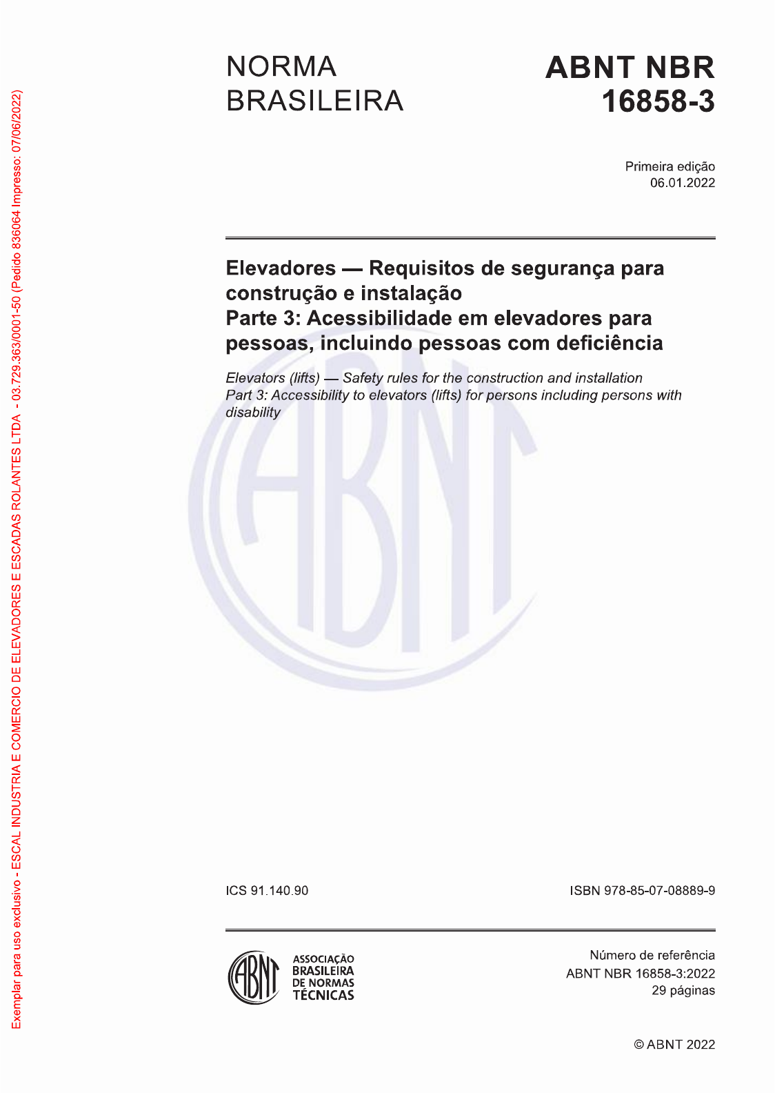 NORMA ABNT NBR BRASILEIRA 16858-3 Primeira edição 06.01.2022 Elevadores Requisitos de segurança para Exemplar para uso exclusivo ESCAL INDUSTRIA E COMERCIO DE ELEVADORES E ESCADAS ROLANTES LTDA 03.729.363/0001-50 (Pedido 836064 Impresso: 07/06/2022) construção e instalação Parte 3: Acessibilidade em elevadores para pessoas, incluindo pessoas com deficiência Elevators (lifts) Safety rules for the construction and installation Part 3: Accessibility to elevators (lifts) for persons including persons with disability ICS ISBN 978-85-07-08889-9 ASSOCIAÇÃO Número de referência BRASILEIRA ABNT NBR 16858-3:2022 DE NORMAS TÉCNICAS 29 páginas © ABNT 2022ABNT NBR 16858-3:2022 Exemplar para uso exclusivo ESCAL INDUSTRIA E COMERCIO DE ELEVADORES E ESCADAS ROLANTES LTDA (Pedido 836064 Impresso: 07/06/2022) © ABNT 2022 Todos os direitos reservados. A menos que especificado de outro modo, nenhuma parte desta publicação pode ser reproduzida ou utilizada por qualquer meio, eletrônico ou mecânico, incluindo fotocópia e microfilme, sem permissão por escrito da ABNT. ABNT Av. Treze de Maio, 13 28° andar 20031-901 Rio de Janeiro RJ Tel.: + 55 21 3974-2300 Fax: + 55 21 3974-2346 abnt@abnt.org.br www.abnt.org.br ii © ABNT 2022 Todos direitos reservadosABNT NBR 16858-3:2022 Sumário Página Prefácio V Introdução vii 1 Escopo 1 2 Referências normativas 1 3 Termos e definições 2 4 Perigos significativos e barreiras à acessibilidade 2 Exemplar para uso exclusivo ESCAL INDUSTRIA E COMERCIO DE ELEVADORES E ESCADAS ROLANTES LTDA 03.729.363/0001-50 (Pedido 836064 Impresso: 07/06/2022) 5 Requisitos de segurança e/ou medidas de proteção 3 5.1 Disposições gerais 3 5.2 Entradas - Aberturas de porta 3 5.3 Dimensões da cabina e equipamento na cabina 4 5.3.1 Dimensões da cabina 4 5.3.2 Equipamento na cabina 8 5.4 Dispositivos de controle e sinais 9 5.4.1 Disposições gerais 9 5.4.2 Dispositivos de controle e sinais para sistemas de controle coletivo 10 5.4.3 Dispositivos de controle e sinais para sistemas de controle de destino 15 6 Verificação dos requisitos de segurança e/ou medidas de proteção 17 7 Informações para uso 20 Anexo A (informativo) Categorias de deficiências consideradas 21 Anexo (normativo) Dispositivos de controle extragrandes 23 B.1 Introdução 23 B.2 Dispositivos de controle de pavimento 23 Dispositivos de controle da cabina 23 Anexo c (normativo) Dispositivos de tela sensível ao toque para sistemas de controle de destino 25 Anexo D (informativo) Orientações para melhoria de acessibilidade e usabilidade 26 Anexo E (informativo) Dimensões da cadeira de rodas manual e da cadeira de rodas motorizada 27 E.1 Introdução 27 E.2 Classes de cadeiras de rodas motorizadas 27 Dimensões referenciais máximas recomendadas para a cadeira de rodas manual 27 E.4 Dimensões referenciais máximas recomendadas para a cadeira de rodas motorizada 28 E.5 Parâmetros antropométricos 28 Bibliografia 29 Figuras Figura 1 Cabinas com portas em paredes adjacentes da cabina 7 Figura 2 Dimensões da seção transversal dos corrimãos 9 Figura 3 Disposição dos botões do pavimento 12 Figura 4 Teclado 16 © ABNT 2022 Todos os direitos reservados iiiABNT NBR 16858-3:2022 Figura B.1 - Exemplo de painel de operação da cabina - Vista lateral 24 Figura B.2 Exemplo de disposição de uma única fileira de botões de pressão 24 Figura Exemplo de disposição de duas fileiras de botões de pressão 24 Tabelas Tabela 1 - Lista de perigos significativos 2 Tabela 2 - Diferença mínima do valor de reflectância da luz (LRV) 3 Tabela 3 - Dimensões mínimas da cabina - com uma única entrada ou com duas entradas 5 Exemplar para uso exclusivo ESCAL INDUSTRIA E COMERCIO DE ELEVADORES E ESCADAS ROLANTES LTDA 03.729.363/0001-50 (Pedido 836064 Impresso: 07/06/2022) Tabela 4 - Dispositivos de controle Requisitos para projeto 11 Tabela 5 - Dispositivos de controle - Requisitos para os arranjos 12 Tabela 6 - Dispositivos de controle Requisitos para disposição 13 Tabela 7 Meios de verificação dos requisitos de segurança e/ou medidas de proteção 18 Tabela A.1 Categorias abrangidas nesta Parte da ABNT NBR 16858 21 Tabela A.2 - Categorias não abrangidas nesta Parte da ABNT NBR 16858 22 Tabela E.1 Dimensões e espaço de manobra da cadeira de rodas manual 28 Tabela E.2 Dimensões e espaço de manobra da cadeira de rodas motorizada elétrica 28 iv © ABNT 2022 Todos direitos reservadosABNT NBR 16858-3:2022 Prefácio A Associação Brasileira de Normas Técnicas (ABNT) é o Foro Nacional de Normalização. As Normas Brasileiras, cujo conteúdo é de responsabilidade dos Comitês Brasileiros (ABNT/CB), dos Organismos de Normalização Setorial (ABNT/ONS) e das Comissões de Estudo Especiais (ABNT/CEE), são elaboradas por Comissões de Estudo (CE), formadas pelas partes interessadas no tema objeto da normalização. Os Documentos Técnicos ABNT são elaborados conforme as regras da ABNT Diretiva 2. Exemplar para uso exclusivo ESCAL INDUSTRIA E COMERCIO DE ELEVADORES E ESCADAS ROLANTES LTDA 03.729.363/0001-50 (Pedido 836064 Impresso: 07/06/2022) A fim de permitir aos usuários da ABNT NBR 16858-3 um prazo para adequação e atendimento aos seus requisitos, é previsto que estes não sejam exigidos antes de 30 meses da publicação desta Norma. Isto não significa, entretanto, impedimento à adequação e ao atendimento a esta Norma na sua íntegra por quaisquer partes interessadas que se sintam aptas a utilizá-la a qualquer momento durante este período. Neste ínterim, a ABNT NBR NM 313:2007 continua sendo aplicável pelo prazo de 30 meses a partir da data de publicação desta Norma, sendo cancelada após este período. AABNT chama a atenção para que, apesar de ter sido solicitada manifestação sobre eventuais direitos de patentes durante a Consulta Nacional, estes podem ocorrer e devem ser comunicados à ABNT a qualquer momento (Lei n° 9.279, de 14 de maio de 1996). Os Documentos Técnicos ABN