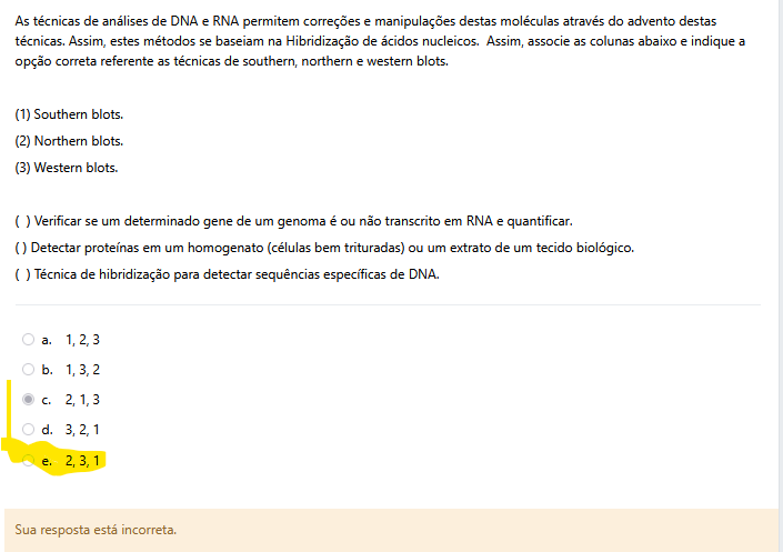 As técnicas de de DNA e RNA permitem correções e manipulações destas através do advento destas técnicas. Assim, estes métodos se baseiam na Hibridização de ácidos nucleicos. Assim, associe as colunas abaixo e indique a opção correta referente as técnicas de southern, northern e western blots. (1) Southern blots. (2) Northern blots. (3) Western blots. Verificar se um determinado gene de um genoma é ou não transcrito em RNA e quantificar. () Detectar proteínas em um homogenato (células bem trituradas) ou um extrato de um tecido () Técnica de hibridização para detectar sequências específicas de DNA. a. 1,2,3 b. 1,3,2 2,1,3 d. 3,2,1 e. 2,3,1 Sua resposta está incorreta.