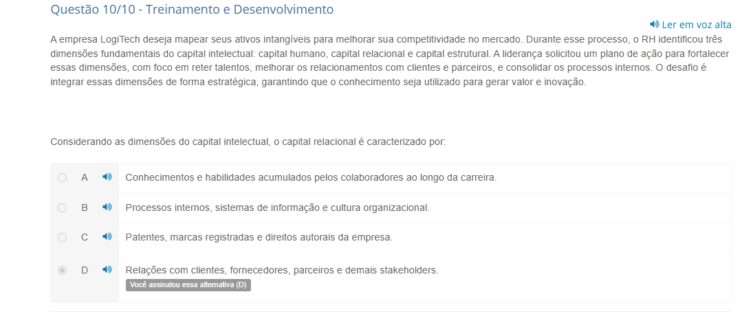 Questão 10/10 Treinamento e Desenvolvimento Ler em voz alta A empresa LogiTech deseja mapear seus ativos intangíveis para melhorar sua competitividade no mercado. Durante esse processo, 0 RH identificou três dimensões fundamentais do capital intelectual: capital humano, capital relacional e capital estrutural. A liderança solicitou um plano de ação para fortalecer essas dimensões, com foco em reter talentos, melhorar relacionamentos com clientes e parceiros, e consolidar processos internos. desafio é integrar essas dimensões de forma estratégica, garantindo que 0 conhecimento seja utilizado para gerar valor e inovação. Considerando as dimensões do capital intelectual, 0 capital relacional é caracterizado por: A Conhecimentos e habilidades acumulados pelos colaboradores ao longo da carreira. B Processos internos, sistemas de informação e cultura organizacional. C Patentes, marcas registradas e direitos autorais da empresa. D Relações com clientes, fornecedores, parceiros e demais stakeholders. Você assinalou essa alternativa (D)