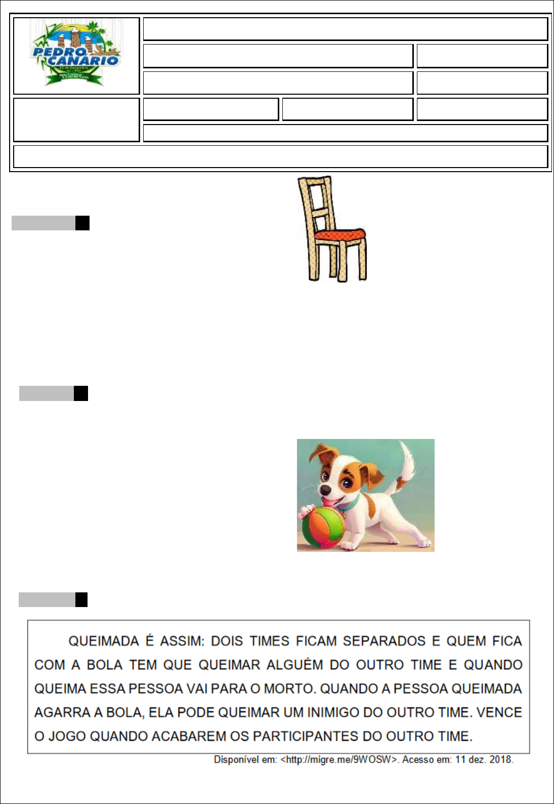 LÍNGUA PORTUGUESA Questão 2A02 1 OBSERVE A IMAGEM AO LADO: FAÇA UM X NO QUADRADINHO ONDE ESTÁ ESCRITO O NOME DA FIGURA. A) ( ) BANCO B) ( ) CADEIRA C) ( ) MESA D) ( ) SOFÁ Questão 2L1 2 OBSERVE A IMAGEM ABAIXO: AGORA FAÇA UM X NA FRASE QUE CONTA O QUE ACONTECE NESSA CENA. A) ( ) O CACHORRO BRINCA COM SEU DONO. B) ( ) O CACHORRO BRINCA COM UMA VELA. C) ( ) O CACHORRO BRINCA COM UMA BOLA. D) ( ) O CACHORRO BRINCA COM UMA PENA. Questão 2L7 3 OUÇA O TEXTO: EMEF PROFESSOR GUEDES ALCOFORADO Disciplinas: Língua Portuguesa e Matemática Acertos: Professora: Zaira Greis Erros: SIMULADO N° 02 2° ano: 2ª Semana Data: 24/04/2024 Aluno (a): O ASSUNTO DESSE TEXTO É A) ( ) AS REGRAS DA AMARELINHA. B) ( ) AS REGRAS DA QUEIMADA. C) ( ) AS REGRAS DO BASQUETE. D) ( ) AS REGRAS DO JOGO DE BOLA. Questão 2L6 4 LEIA O TEXTO ABAIXO COM AJUDA DA PROFESSORA. O CACHORRO E SUA SOMBRA UM CÃO QUE CARREGAVA UM PEDAÇO DE CARNE ROUBADA NA BOCA ESTAVA ATRAVESSANDO UM RIO QUANDO VIU SUA IMAGEM REFLETIDA NA ÁGUA. ENTÃO, PENSANDO QUE ESTAVA VENDO OUTRO CACHORRO, ELE TENTOU ABOCANHAR O REFLEXO PARA ROUBAR A CARNE DELE, MAS, QUANDO ABRIU A BOCA, DEIXOU CAIR NO RIO O PEDAÇO QUE TINHA ROUBADO [...] DISPONÍVEL EM:HTTP://PARAISODOSPROFESSORES.BLOGSPOT.COM.BR/2015/09/INTERPRETACAO-DE-TEXTOS-E-SUAS ACESSO EM: 26 ABR. 2019. NESSE TEXTO, O CACHORRO DEMONSTROU SER A) ( ) AMBICIOSO. B) ( ) CURIOSO. C) ( ) ESPERTO. D) ( ) MALVADO. Questão D2L5 5 LEIA O TEXTO ABAIXO COM AJUDA DA PROFESSORA. DE ACORDO COM O TEXTO, MAGALI A) ( ) CANTA BEM. B) ( ) CANTA MAL. C) ( ) NÃO TEM NENHUM AMIGO. D) ( ) TEM UM MILHÃO DE AMIGOS. MATEMÁTICA Questão D2A1.4 1 OBSERVE AS IMAGENS: ISABEL MUDOU PARA UMA VILA CHAMADA MONTE BELO E SUA CASA ESTÁ ENTRE A CASA 14 E 28, SABENDO QUE AS CASAS SEGUEM UMA SEQUÊNCIA PADRÃO DIFERENTE. DESCUBRA QUAL É O NÚMERO DA CASA DE ISABEL: DESCUBRA O SEGREDO DA SEQUÊNCIA USADA AQUI. E ASSINALE A ALTERNATIVA QUE MOSTRA QUAL É ESSE NÚMERO: A) ( ) 21 B) ( ) 24 C) ( ) 34 D) ( ) 7 Questão 2M1.1 2 OBSERVE A IMAGEM ABAIXO. NA FIGURA, TEMOS VÁRIOS COPOS DE SORVETES. QUAL COPO COMPORTA MAIOR QUANTIDADE DE SORVETE. A) ( ) 1 B) ( ) 2 C) ( ) 3 D) ( ) 4 Questão 2M1.7 3 JULIANA COMPROU ALGUMAS JUJUBAS E PAGOU COM ALGUMAS NOTAS. https://www.tudogostoso.com.br/noticias/como-fazer-jujubas-em-casa-a1014.htm QUANTO ELE PAGOU PELAS JUJUBAS? A) VINTE REAIS B) VINTE E CINCO REAIS C) QUINZE REAIS D) CINCO REAIS Questão 2N1.2 4 A FIGURA REPRESENTA A ORDEM DE CHEGADA DA CORRIDA NA ESCOLA NA HORA DO RECREIO. QUEM CHEGOU EM PRIMEIRO LUGAR? A) ( ) TIAGO B) ( ) NINO C) ( ) CAIO D) ( ) LUCAS Questão 2G1.3 5 OBSERVE UMA RÉGUA ESCOLAR A SEGUIR. QUAL É A FIGURA GEOMÉTRICA QUE SE PARECE COM ESSE OBJETO? A) ( ) TRIÂNGULO B) ( ) CÍRCULO C) ( ) QUADRADO D) ( ) RETÂNGULO Questão 2N1.5 6 A PROFESSORA BIA CONFECCIONOU ALGUMAS FICHAS COM CARTOLINA E NUMEROU. ELA PRECISA ORGANIZAR AS FICHAS NA ORDEM DO MAIOR PARA O MENOR. MARQUE UM X NA OPÇÃO QUE BIA ORGANIZOU CORRETAMENTE: A) 66 – 92 – 41 – 24 – 87 – 35 B) 24 – 35 – 41 – 66 – 87 – 92 C) 92 – 87 – 66 – 41 – 35 – 24 D) 66 – 35 – 92 – 41 – 87 – 24 BOM SIMULADO! TORÇO POR VOCÊ!