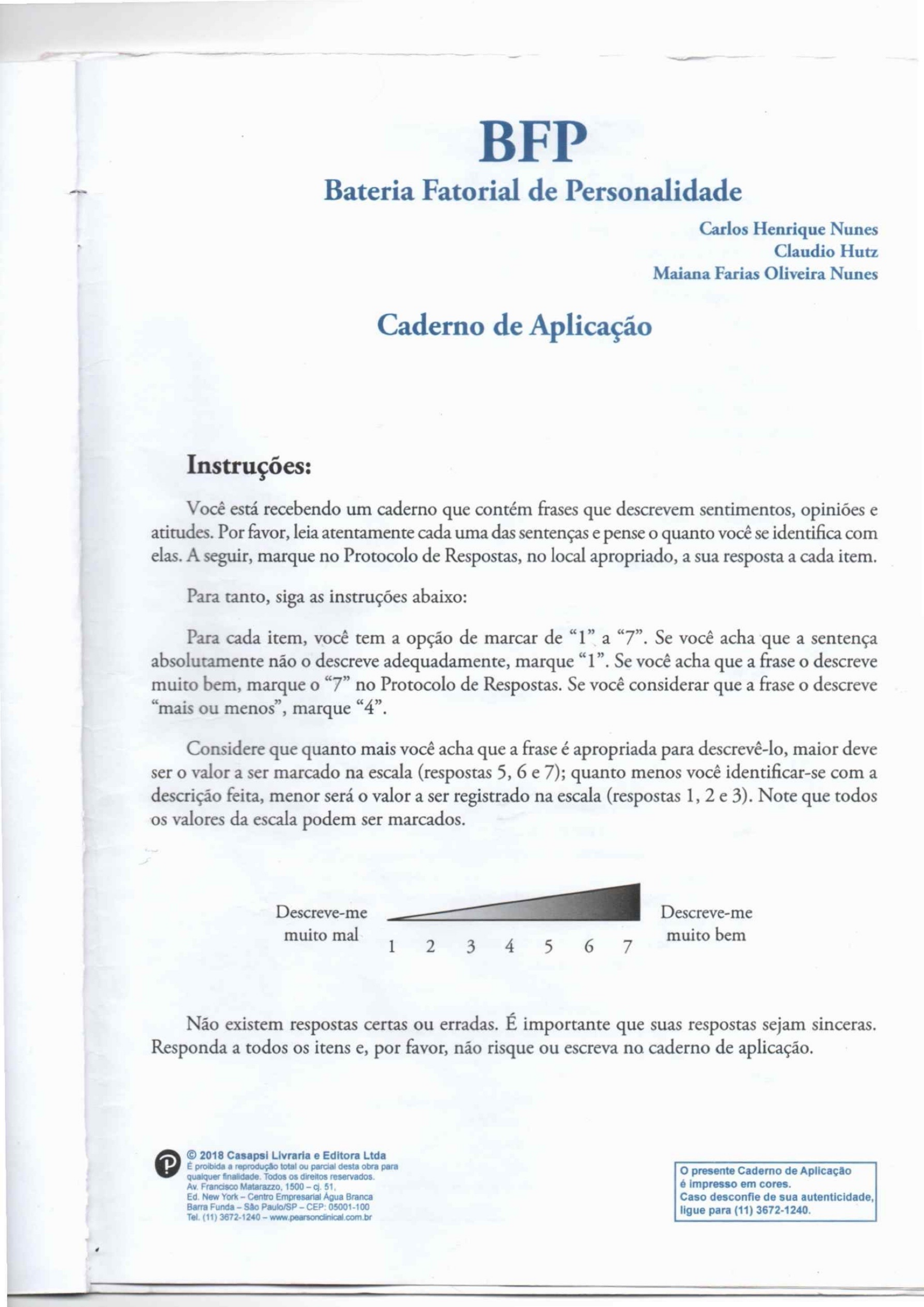 BFP Bateria Fatorial de Personalidade Carlos Henrique Nunes Claudio Hutz Maiana Farias Oliveira Nunes Caderno de Aplicação Instruções: Você está recebendo um caderno que contém frases que descrevem sentimentos, e atitudes. Por favor, leia atentamente cada uma das sentenças e pense o quanto você se identifica com elas. A seguir, marque no Protocolo de Respostas, no local apropriado, a sua resposta a cada item. Para tanto, siga as instruções abaixo: Para cada item, você tem a opção de marcar de "1" a "7". Se você acha que a sentença absolutamente não o descreve adequadamente, marque "1". Se você acha que a frase o descreve muito bem, marque o "7" no Protocolo de Respostas. Se você considerar que a frase o descreve "mais ou menos", marque "4". Considere que quanto mais você acha que a frase é apropriada para descrevê-lo, maior deve ser o valor a ser marcado na escala (respostas 5,6 e 7); quanto menos você identificar-se com a descrição feita, menor será o valor a ser registrado na escala (respostas 1, 2 e 3). Note que todos os valores da escala podem ser marcados. Descreve-me Descreve-me muito mal muito bem 1 2 3 4 5 6 7 Não existem respostas certas ou erradas. É importante que suas respostas sejam sinceras. Responda a todos os itens e, por favor, não risque ou escreva no caderno de aplicação. © 2018 Casapsi Livraria e Editora Ltda P É proibida a reprodução total ou parcial desta obra para presente Caderno de Aplicação qualquer finalidade. Todos os direitos Av. Francisco Matarazzo, 1500 51, é impresso em cores. Ed. New York Centro Empresarial Agua Branca Caso desconfie de sua autenticidade, Barra Funda São Paulo/SP CEP: 05001-100 ligue para (11) 3672-1240. Tel. (11) 3672-1240 - www.pearsonclinical.com.brDescreve-me Descreve-me muito mal muito bem 1234567 1. Procuro seguir as regras sociais sem questioná-las. 2. Tento fazer com que as pessoas se sintam bem. 3. Gosto de falar sobre mim. 4. Tenho um "coração mole". 5. Falo tudo o que penso. 6. Gosto de fazer coisas que nunca fiz antes. 7. Acredito que as pessoas têm boas intenções. 8. Sou divertido. 9. Tomo cuidado com o que falo. 10. Dificilmente perdoo. 11. Divirto-me quando estou entre muitas pessoas. 12. Respeito os sentimentos alheios. 13. Mesmo quando preciso resolver alguma coisa para mim, costumo adiar até o último momento. 14. Tento influenciar os outros. 15. Sou generoso(a). 16. Estou satisfeito comigo mesmo(a). 17. Não falo muito. 18. Posso agredir fisicamente as pessoas quando fico muito irritado. 19. Resolvo meus problemas sem pensar muito. 20. Preocupo-me com todos. 21. Geralmente me sinto feliz. 22. Preciso de estímulo para começar a fazer as coisas. 23. Tenho pouco interesse por exposições de arte. 24. Divirto-me contrariando as pessoas. 25. Com frequência tomo decisões precipitadas. 26. Facilmente coloco as minhas ideias em prática. 27. Uso as pessoas para conseguir o que desejo. 28. Posso lidar com muitas tarefas ao mesmo tempo. 29. Quase sempre me sinto desanimado. 30. Suspeito das intenções das pessoas. 31. Atualmente, defendo ideias diferentes daquelas que defendia antigamente. 32. Consigo que eu quero. 33. Tenho pouca curiosidade para conhecer novos estilos musicais. 34. Dedico-me muito para fazer bem as coisas. 35. Espero pela decisão dos outros. 36. Interesso-me por teorias que tentam explicar o universo. 37. Tenho pouca paciência para terminar tarefas muito longas ou difíceis. 38. Sou uma pessoa tímida. 39. Tenho alguns inimigos. 40. Acho que a minha vida é vazia e sem emoção. 41. Começo rapidamente as tarefas que tenho para fazer. 42. Acho pouco interessantes exposições fotográficas. 43. Respeito o ponto de vista dos outros. 44. Tenho dificuldade para me adaptar a trabalhos que envolvam uma rotina fixa. 45. Antes de agir, penso no que pode acontecer.Descreve-me Descreve-me muito mal muito bem 1 2 3 4 5 6 7 46. Sinto-me mal se não cumpro algo que prometi. 47. Adoro atividades em grupo. 48. Tudo o que posso ver a minha frente é mais desprazer do que prazer. 49. Gosto de ir a lugares que não conheço. 50. Converso com muitas pessoas diferentes quando vou a festas. 51. Ajo impulsivamente quando alguma coisa está me aborrecendo. 52. Gosto de ter uma vida social agitada. 53. Participar de atividades que envolvam criatividade e/ou fantasia me empolga. 54. Me esforço para ter destaque na escola ou no trabalho. 55. Geralmente faço o que os meus amigos e parentes querem, embora não concorde com eles, com medo de que se afastem de mim. 56. Tenho pouco interesse por ideias abstratas. 57. Acho que os outros zombam de mim. 58. Costumo fazer sacrifícios para conseguir o que quero. 59. Acho natural que os valores morais mudem ao longo do tempo. 60. Tenho muito medo de que os meus amigos deixem de gostar de mim. 61. Tento incentivar as pessoas. 62. Sou uma pessoa com pouca imaginação. 63. Faço coisas consideradas perigosas. 64. Penso sobre o que preciso fazer para alcançar meus objetivos. 65. Sou uma pessoa nervosa. 66. Costumo ficar calado quando estou entre estranhos. 67. Resolvo meus problemas com rapidez. 68. Confio no que as pessoas dizem. 69. Acho que não existe uma verdade absoluta. 70. Por mais que me esforce, sei que não sou capaz de superar os obstáculos que tenho que enfrentar no dia a dia. 71. Envolvo-me rapidamente com os outros. 72. Gosto de pensar sobre soluções diferentes para problemas complexos. 73. Deixo de fazer as coisas que desejo por medo de ser criticado pelos outros. 74. Acredito que a maioria dos valores morais são dependentes da época e do lugar. 75. Fico muito tímido quando estou entre desconhecidos. 76. Preocupo-me em agir segundo as leis. 77. Meu humor varia constantemente. 78. Necessito estar no centro das atenções. 79. Sinto-me muito inseguro quando tenho que fazer coisas que nunca fiz antes. 80. As pessoas dizem que sou muito detalhista. 81. Evito discussões filosóficas. 82. Não gosto de expressar as minhas ide