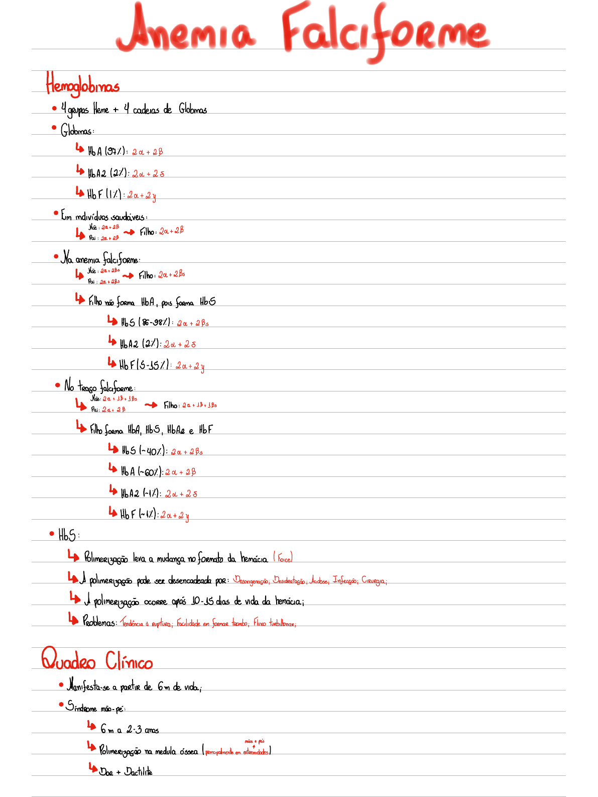 Anemia Falciforme Hemoglobinas 4 grupos Heme + 4 cadeias de Globmas Globmas: Em Filho: Na anemia falciforme: Filho: Filho não forma HbA, pois forma HbS No falciforme: Filho forma HbA, HbS, HbA2 e HbF HbS: Polimerização leva a mudança no formato da hemácia (Foice) pode desencadeada I OCORRE 10-15 dias de vida da Facilidade em formar Fluxo Clínico Manifesta-se a partir de 6m de vida; 6m a 2-3 anos pes na medula óssea em Dor + DactiliteCrise 3 anas na medula óssea lossos Dor sem Dactilite Esplênico