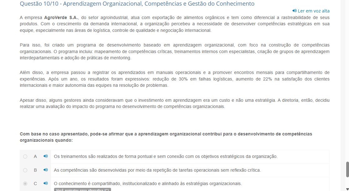 Questão 10/10 Aprendizagem Organizacional, Competências e Gestão do Conhecimento Ler em voz alta A empresa AgroVerde S.A., do setor agroindustrial, com exportação de alimentos orgânicos e tem como diferencial a rastreabilidade de seus produtos. Com 0 crescimento da demanda internacional, a organização percebeu a necessidade de desenvolver competências estratégicas em sua equipe, especialmente nas áreas de logística, controle de qualidade e negociação internacional. Para isso, foi criado um programa de desenvolvimento baseado em aprendizagem organizacional, com foco na construção de competências organizacionais. programa incluiu: mapeamento de competências treinamentos internos com especialistas, criação de grupos de aprendizagem interdepartamentais e adoção de práticas de mentoring. Além disso, a empresa passou a registrar aprendizados em manuais operacionais e a promover encontros mensais para compartilhamento de experiências. Após um ano, resultados foram expressivos: redução de 30% em falhas logísticas, aumento de 22% na satisfação dos clientes internacionais e maior autonomia das equipes na resolução de problemas. Apesar disso, alguns gestores ainda consideravam que investimento em aprendizagem era um custo e não uma estratégia. A diretoria, então, decidiu realizar uma avaliação do impacto do programa no desenvolvimento de competências organizacionais. Com base no caso apresentado, pode-se afirmar que a aprendizagem organizacional contribui para O desenvolvimento de competências organizacionais quando: A Os treinamentos são realizados de forma pontual e sem conexão com objetivos estratégicos da organização. B As competências são desenvolvidas por meio da repetição de tarefas operacionais sem reflexão C conhecimento é compartilhado, institucionalizado e alinhado às estratégias organizacionais. Você