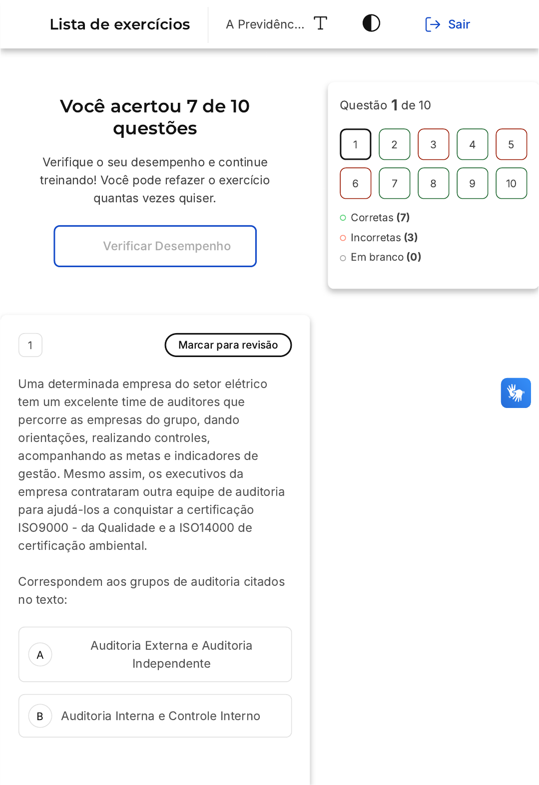 Você acertou 7 de 10 questões Verifique o seu desempenho e continue treinando! Você pode refazer o exercício quantas vezes quiser. Verificar Desempenho A B 1 Marcar para revisão Uma determinada empresa do setor elétrico tem um excelente time de auditores que percorre as empresas do grupo, dando orientações, realizando controles, acompanhando as metas e indicadores de gestão. Mesmo assim, os executivos da empresa contrataram outra equipe de auditoria para ajudá-los a conquistar a certificação ISO9000 - da Qualidade e a ISO14000 de certificação ambiental. Correspondem aos grupos de auditoria citados no texto: Auditoria Externa e Auditoria Independente Auditoria Interna e Controle Interno Questão 1 de 10 Corretas (7) Incorretas (3) Em branco (0) 1 2 3 4 5 6 7 8 9 10 Lista de exercícios A Previdênc… Sair C D E Risco de Auditoria e Evidência de Auditoria Auditoria Interna e Auditoria Externa Laudo e Relatório Resposta correta Parabéns, você selecionou a alternativa correta. Confira o gabarito comentado! Gabarito Comentado A alternativa "Auditoria Externa e Auditoria Independente" é incorreta, pois ambas são denominações que, na prática, possuem as características de serem pontuais e sem vínculo de emprego. "Controle Interno" não é um tipo de auditoria, mas sim um meio de controle que não se confunde com um trabalho de auditoria. "Risco de Auditoria e Evidência de Auditoria" é uma alternativa incorreta, pois o risco de auditoria e suas evidências são elementos que fazem parte do processo de auditoria, seja na fase de planejamento e/ou na fase de execução. A alternativa "Auditoria Interna e Auditoria Externa" é a correta. A empresa mencionada no enunciado possui um time de auditores internos que percorre as empresas do grupo, realizando controles e acompanhando as metas. Além disso, os executivos da empresa contrataram uma equipe externa para auxiliar na obtenção das certificações ISO9000 e ISO14000. A B C D E "Laudo e Relatório" é uma alternativa incorreta, pois são meios de emitir a opinião profissional. Se for perito nomeado pelo Juiz, emite-se Laudo, se for auditor, emite-se relatório. 2 Marcar para revisão Após a realização de uma auditoria independente na Cia de Resseguros "Maresias S/A", o auditor concluiu que as evidências de auditoria sobre os saldos contábeis da conta de "Sinistros não avisados" eram insuficientes para a comprovação da veracidade dos saldos e das informações contábeis. Sendo você o auditor independente, no momento de decidir sobre qual o tipo de parecer a ser emitido para a Cia Maresias, uma vez que não foi possível ter evidências suficientes sobre o ponto, qual seria o parecer adequado? Parecer sem ressalva Parecer com ressalva Parecer adverso Parecer com abstenção de opinião Parecer sem efeito judicial Resposta correta Parabéns, você selecionou a alternativa correta. Confira o gabarito comentado! Gabarito Comentado O parecer com abstenção de opinião é o mais adequado para este caso. Este tipo de parecer é emitido quando o auditor não consegue obter evidências suficientes para formar uma opinião sobre um ou mais aspectos das demonstrações contábeis. No caso da Cia Maresias, a falta de evidências suficientes sobre os saldos da conta de "Sinistros não avisados" impede o auditor de formar uma opinião completa e confiável, levando à emissão de um parecer com abstenção de opinião. 3 Marcar para revisão Nos procedimentos que antecederam a auditoria externa na Cia Sauza Cruizes, foi preparado o Planejamento de Auditoria que foi apresentado para a alta administração e para o comitê de governança. Este último emitiu a carta de responsabilidade da administração, atestando a veracidade e materialidade das informações contábeis da seguradora. Porém, mesmo com a carta, o auditor independente não ficou convencido sobre a forma de divulgação da Demonstração de Fluxo de Caixa pelo Método Indireto, o qual não apresentava o grupo dos investimentos. Nesse caso, quando o auditor não tiver certeza sobre o fato ser ou não relevante, o que o auditor deve emitir? A B C D E Parecer sem ressalva Parecer com ressalva Parecer adverso Parecer com abstenção de opinião Parágrafo de ênfase Resposta incorreta Opa! A alternativa correta é a letra E. Confira o gabarito comentado! Gabarito Comentado Em situações onde o auditor não tem certeza sobre a relevância de um fato, a melhor opção é emitir um "Parágrafo de ênfase". Este é um parágrafo inserido no relatório de auditoria que destaca um assunto que, na opinião do auditor, é fundamental para a compreensão dos usuários das demonstrações financeiras. Portanto, neste caso, onde há incerteza sobre a forma de divulgação da Demonstração de Fluxo de Caixa pelo Método Indireto, o auditor deve optar por emitir um "Parágrafo de ênfase". 4 Marcar para revisão A B C D E Em uma Companhia de Seguros e Previdência, João é auditor interno e José trabalha no controle interno. Juntos, analisaram os cálculos atuariais e perceberam que a conta contábil de reservas técnicas estava com saldos diferentes do exercício de 2018 para 2019. José buscou as últimas Demonstrações Contábeis publicadas e os relatórios emitidos pela Auditoria Independente da época e observou que a estrutura do relatório financeiro aplicável estava em conformidade com as leis e regulamentos, mas que a apresentação dos relatórios da auditoria não estava adequada. José (controle interno) perguntou a João (auditor) qual a consequência disso para a próxima auditoria. O que você responderia a José se fosse João? Assinale a afirmativa correta: Que as evidências de auditoria são insuficientes para expressar uma opinião. Que as diferenças de saldos na apresentação do relatório contábil indicam risco de distorção relevante. Que a premissa adotada é satisfatória e existe asseguração razoável. Que o auditor não verá como um 