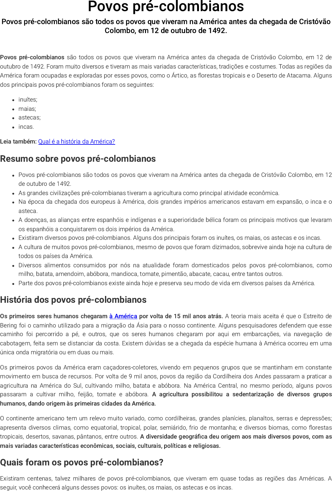 Povos pré-colombianos Povos pré-colombianos são todos os povos que viveram na América antes da chegada de Cristóvão Colombo, em 12 de outubro de 1492. Povos pré-colombianos são todos os povos que viveram na América antes da chegada de Cristóvão Colombo, em 12 de outubro de 1492. Foram muito diversos e tiveram as mais variadas características, tradições e costumes. Todas as regiões da América foram ocupadas e exploradas por esses povos, como o Ártico, as florestas tropicais e o Deserto de Atacama. Alguns dos principais povos pré-colombianos foram os seguintes: inuítes; maias; astecas; incas. Leia também: Qual é a história da América? Resumo sobre povos pré-colombianos Povos pré-colombianos são todos os povos que viveram na América antes da chegada de Cristóvão Colombo, em 12 de outubro de 1492. As grandes civilizações pré-colombianas tiveram a agricultura como principal atividade econômica. Na época da chegada dos europeus à América, dois grandes impérios americanos estavam em expansão, o inca e o asteca. A doenças, as alianças entre espanhóis e indígenas e a superioridade bélica foram os principais motivos que levaram os espanhóis a conquistarem os dois impérios da América. Existiram diversos povos pré-colombianos. Alguns dos principais foram os inuítes, os maias, os astecas e os incas. A cultura de muitos povos pré-colombianos, mesmo de povos que foram dizimados, sobrevive ainda hoje na cultura de todos os países da América. Diversos alimentos consumidos por nós na atualidade foram domesticados pelos povos pré-colombianos, como milho, batata, amendoim, abóbora, mandioca, tomate, pimentão, abacate, cacau, entre tantos outros. Parte dos povos pré-colombianos existe ainda hoje e preserva seu modo de vida em diversos países da América. História dos povos pré-colombianos Os primeiros seres humanos chegaram à América por volta de 15 mil anos atrás. A teoria mais aceita é que o Estreito de Bering foi o caminho utilizado para a migração da Ásia para o nosso continente. Alguns pesquisadores defendem que esse caminho foi percorrido a pé, e outros, que os seres humanos chegaram por aqui em embarcações, via navegação de cabotagem, feita sem se distanciar da costa. Existem dúvidas se a chegada da espécie humana à América ocorreu em uma única onda migratória ou em duas ou mais. Os primeiros povos da América eram caçadores-coletores, vivendo em pequenos grupos que se mantinham em constante movimento em busca de recursos. Por volta de 9 mil anos, povos da região da Cordilheira dos Andes passaram a praticar a agricultura na América do Sul, cultivando milho, batata e abóbora. Na América Central, no mesmo período, alguns povos passaram a cultivar milho, feijão, tomate e abóbora. A agricultura possibilitou a sedentarização de diversos grupos humanos, dando origem às primeiras cidades da América. O continente americano tem um relevo muito variado, como cordilheiras, grandes planícies, planaltos, serras e depressões; apresenta diversos climas, como equatorial, tropical, polar, semiárido, frio de montanha; e diversos biomas, como florestas tropicais, desertos, savanas, pântanos, entre outros. A diversidade geográfica deu origem aos mais diversos povos, com as mais variadas características econômicas, sociais, culturais, políticas e religiosas. Quais foram os povos pré-colombianos? Existiram centenas, talvez milhares de povos pré-colombianos, que viveram em quase todas as regiões das Américas. A seguir, você conhecerá alguns desses povos: os inuítes, os maias, os astecas e os incas. https://brasilescola.uol.com.br/historia-da-america https://brasilescola.uol.com.br/geografia/america-3.htm → Inuítes Mulher do povo inuíte, um dos povos pré-colombianos que ainda existem. Muito conhecidos como esquimós, os povos inuítes vivem há mais de 10 mil anos no Ártico, na região dos atuais Canadá, Rússia, Alaska e Groenlândia. O clima extremamente frio da região não possibilita a agricultura, levando os inuítes a encontrarem soluções criativas para viverem na região mais fria do planeta. A pesca e a caça de mamíferos e aves são as principais fontes de alimentos deles, entre os principais animais caçados estão: baleias, focas, narvais e caribus. Nas águas geladas do Ártico, os povos inuítes utilizam como meio de transporte seus caiaques e umiaques. Pelo gelo, o principal meio de transporte são os trenós puxados por cachorros. Antigamente os povos inuítes construíam suas casas com ossos de baleia e com couro de foca. Os iglus, construídos com gelo, eram utilizados principalmente nos acampamentos de caça. Alguns povos ainda hoje fabricam iglus no Ártico. → Maias Os maias formaram uma grande civilização nas florestas tropicais da América Central, com suas principais cidades localizadas na região da Península de Iucatã e atuais Belize e Guatemala. Os maias cultivavam milho, tomate, abacate, feijões, abóbora, diversos tipos de pimentas e cacau. Também criavam uma espécie de cachorro para o abate e perus. Uma complexa rede de estradas foi criada pelos maias, conectando as diversas cidades de sua civilização. Por essa rede eram transportados os produtos cultivados, assim como jade, obsidiana, peles de animais, penas de diversas aves, madeira e diversos outros produtos. Entre as principais cidades maias, estavam Palenque, Tulum, Chichen Itzá e Tikal, esta última cidade teve, em seu auge, cerca de 50 mil habitantes.|1| Assim como a civilização egípcia, os maias ficaram conhecidos por causa da construção de pirâmides, estas eram utilizadas como templo e local de sacrifício humano. Em algumas delas, monarcas foram sepultados, como Pakal no Templo das Inscrições, em Palenque. https://brasilescola.uol.com.br/historiag/egipcio.htm Pirâmide de Chichen Itzá, dedicada ao deus Kukulcán. A mais famosa das pirâmides maias foi a construída em Chichen Itzá, hoje ela é considera