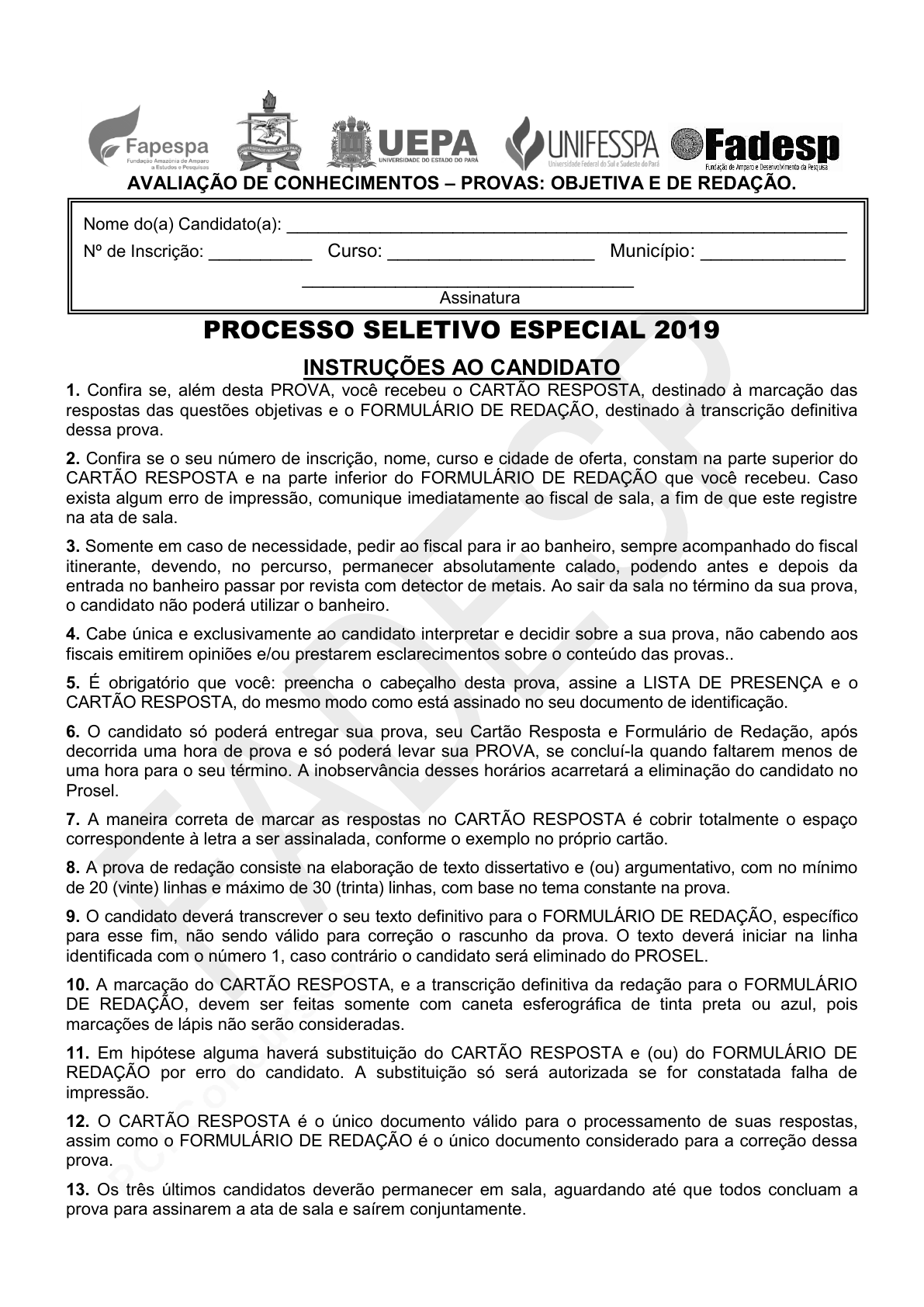 pcimarkpci MDAwMDowMDAwOjAwMDA6MDAwMDowMDAwOmZmZmY6YmQxMToyZjM1:RnJpLCAyNSBKdWwgMjAyNSAxMDoxMTo1NSAtMDMwMA== www.pciconcursos.com.br AVALIAÇÃO DE CONHECIMENTOS – PROVAS: OBJETIVA E DE REDAÇÃO. PROCESSO SELETIVO ESPECIAL 2019 INSTRUÇÕES AO CANDIDATO 1. Confira se, além desta PROVA, você recebeu o CARTÃO RESPOSTA, destinado à marcação das respostas das questões objetivas e o FORMULÁRIO DE REDAÇÃO, destinado à transcrição definitiva dessa prova. 2. Confira se o seu número de inscrição, nome, curso e cidade de oferta, constam na parte superior do CARTÃO RESPOSTA e na parte inferior do FORMULÁRIO DE REDAÇÃO que você recebeu. Caso exista algum erro de impressão, comunique imediatamente ao fiscal de sala, a fim de que este registre na ata de sala. 3. Somente em caso de necessidade, pedir ao fiscal para ir ao banheiro, sempre acompanhado do fiscal itinerante, devendo, no percurso, permanecer absolutamente calado, podendo antes e depois da entrada no banheiro passar por revista com detector de metais. Ao sair da sala no término da sua prova, o candidato não poderá utilizar o banheiro. 4. Cabe única e exclusivamente ao candidato interpretar e decidir sobre a sua prova, não cabendo aos fiscais emitirem opiniões e/ou prestarem esclarecimentos sobre o conteúdo das provas.. 5. É obrigatório que você: preencha o cabeçalho desta prova, assine a LISTA DE PRESENÇA e o CARTÃO RESPOSTA, do mesmo modo como está assinado no seu documento de identificação. 6. O candidato só poderá entregar sua prova, seu Cartão Resposta e Formulário de Redação, após decorrida uma hora de prova e só poderá levar sua PROVA, se concluí-la quando faltarem menos de uma hora para o seu término. A inobservância desses horários acarretará a eliminação do candidato no Prosel. 7. A maneira correta de marcar as respostas no CARTÃO RESPOSTA é cobrir totalmente o espaço correspondente à letra a ser assinalada, conforme o exemplo no próprio cartão. 8. A prova de redação consiste na elaboração de texto dissertativo e (ou) argumentativo, com no mínimo de 20 (vinte) linhas e máximo de 30 (trinta) linhas, com base no tema constante na prova. 9. O candidato deverá transcrever o seu texto definitivo para o FORMULÁRIO DE REDAÇÃO, específico para esse fim, não sendo válido para correção o rascunho da prova. O texto deverá iniciar na linha identificada com o número 1, caso contrário o candidato será eliminado do PROSEL. 10. A marcação do CARTÃO RESPOSTA, e a transcrição definitiva da redação para o FORMULÁRIO DE REDAÇÃO, devem ser feitas somente com caneta esferográfica de tinta preta ou azul, pois marcações de lápis não serão consideradas. 11. Em hipótese alguma haverá substituição do CARTÃO RESPOSTA e (ou) do FORMULÁRIO DE REDAÇÃO por erro do candidato. A substituição só será autorizada se for constatada falha de impressão. 12. O CARTÃO RESPOSTA é o único documento válido para o processamento de suas respostas, assim como o FORMULÁRIO DE REDAÇÃO é o único documento considerado para a correção dessa prova. 13. Os três últimos candidatos deverão permanecer em sala, aguardando até que todos concluam a prova para assinarem a ata de sala e saírem conjuntamente. Nome do(a) Candidato(a): ______________________________________________________ Nº de Inscrição: __________ Curso: ____________________ Município: ______________ ________________________________ Assinatura pcimarkpci MDAwMDowMDAwOjAwMDA6MDAwMDowMDAwOmZmZmY6YmQxMToyZjM1:RnJpLCAyNSBKdWwgMjAyNSAxMDoxMTo1NSAtMDMwMA== www.pciconcursos.com.br 2 REDAÇÃO Para a autora do texto Escola x Violência, exposto na página seguinte, em vez de agir de forma autoritária, a escola deve proporcionar a seus alunos a reflexão e a discussão sobre a violência com o objetivo de reduzir os casos que ocorrem em suas dependências. Em um texto em prosa, aponte Outra(S) Medida(S) Que A Escola Pode Implementar Para Evitar Os Diferentes Tipos De Violência Dentro Do Ambiente Escolar. * Sua redação deverá ter, no mínimo, 20 linhas e, no máximo, 30; * Textos em versos, rasurados, escritos a lápis ou com letra ilegível NÃO serão aceitos; * O espaço abaixo é para rascunho, porém, o texto definitivo deverá ser, obrigatoriamente, transcrito no FORMULÁRIO DE REDAÇÃO fornecido especificamente para esse fim; * Em nenhuma hipótese, o rascunho será considerado. 1 2 3 4 5 6 7 8 9 10 11 12 13 14 15 16 17 18 19 20 21 22 23 24 25 26 27 28 29 30 pcimarkpci MDAwMDowMDAwOjAwMDA6MDAwMDowMDAwOmZmZmY6YmQxMToyZjM1:RnJpLCAyNSBKdWwgMjAyNSAxMDoxMTo1NSAtMDMwMA== www.pciconcursos.com.br 3 Leia atentamente o texto a seguir, para subsidiar sua redação e para responder às questões de 1 a 5. ESCOLA x VIOLÊNCIA A escola é lugar de formação da ética e da moral dos alunos, professores ou demais funcionários 01 A violência é um problema social que está presente nas ações dentro das escolas, e se manifesta de diversas formas entre todos os envolvidos no processo educativo. Isso não deveria acontecer, pois escola é lugar de formação da ética e da moral dos sujeitos ali inseridos, sejam eles alunos, professores ou demais funcionários. Porém, o que vemos são ações coercitivas, representadas pelo poder e autoritarismo dos professores, coordenação e direção, numa escala hierárquica, estando os alunos no meio dos conflitos profissionais que acabam por refletir dentro da sala de aula. Além disso, a violência estampada nas ruas das cidades, a violência doméstica, os latrocínios, os contrabandos, os crimes de colarinho branco têm levado jovens a perder a credibilidade quanto a uma sociedade justa e igualitária, capaz de promover o desenvolvimento social em iguais condições para todos, tornando-os violentos, conforme esses modelos sociais. Nas escolas, as relações do dia a dia deveriam traduzir respeito ao próximo, através de atitudes que levassem à amizade, harmonia e 