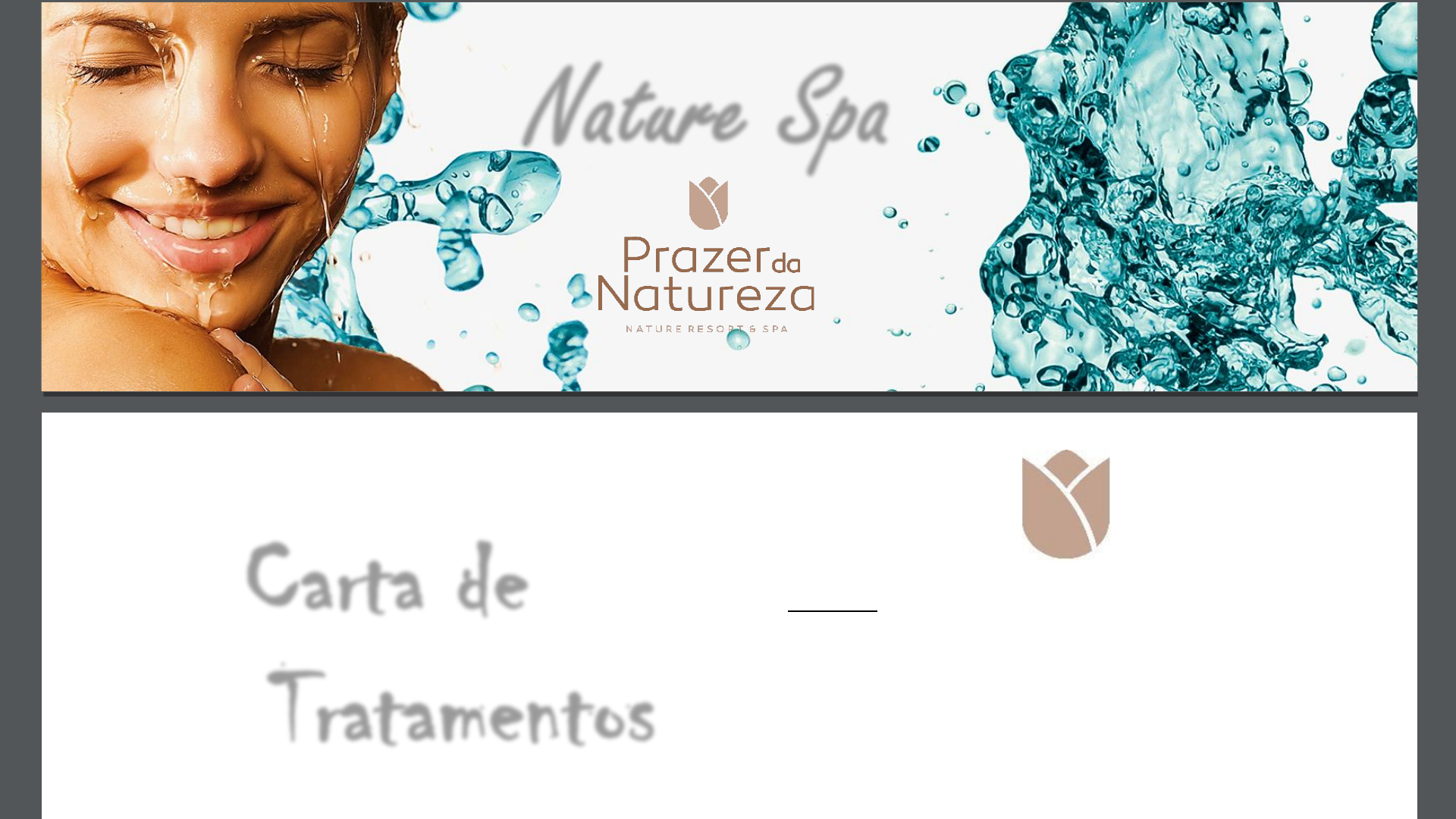 Carta de Tratamentos O Nature Spa é um espaço de Saúde e Bem-Estar dedicado a toda a família. Localizado e inspirado nos jardins envolventes , contempla uma Piscina Interior Climatizada com Jatos Cervicais, Jacuzzi, Sauna, Ginásio, Banho turco e Salas de Tratamento. Para tornar a sua visita mais completa, propomos um vasto leque de experiências relaxantes e aromáticas para que possa revitalizar-se e encontrar o equilíbrio entre o corpo e a mente. Nature Spa Romantic Moment ✓ 2 Massagens de Velas Aromáticas (50 min) ✓ Jacuzzi (20 mim) ✓ Sala de Relaxamento Preço por Programa (2pax) = 135.00€ Programas a Dois Vip Amor ✓ 2 massagens com aromaterapia (50 min) ✓ Sala de Relaxamento ✓ Momento a dois no jacuzzi com espumante e bombons Preço do Programa (2pax) = 145.00€ Zen Moment ✓ 2 Massagens Pleno Relaxamento (50 min) ✓ Jacuzzi ( 15 min) ✓ Sala de Relaxamento Preço por Programa (2pax) = 120.00€ ✓ Piscina ✓ Sauna ✓ Banho Turco Preço por Pessoa (90min) = 12.50€ Circuito Nature Spa Massagens Corpo Inteiro Massagem para Crianças 20 min 35.00€ Estimula, proporcionando energia, reduzindo a fadiga em caso de exaustão, estimula a elasticidade muscular, trata a desidratação cutânea, recuperando a pele após a piscina. Potencia o bem-estar e a síntese de endorfinas. Massagem Pedras Quentes Massagem Sabores da Natureza 50 min 60.00€ ou 30 min A massagem Sabores da Natureza combina a massagem de relaxamento tradicional com aromaterapia. Nesta massagem é utilizado óleo de grainha de uva com uma combinação específica de óleos essenciais. Tratamento que combina o poder equilibrante das pedras quentes com uma massagem de relaxamento. As pedras quentes potenciam os pontos energéticos do organismo e trabalham ao nível da limpeza, harmonia e proteção do corpo físico, mental e emocional. 80 min 75.00€ 35.00€ Shiatsu 50 min 55.00€ Massagem com Pindas 80 min 90.00€ Massagem com efeito relaxante, realizada com pindas. Estes objetos são sacos de algodão ou de linho, que contêm ervas medicinais aromáticas. É uma técnica de origem oriental, que combina massagem com pressão nos pontos de acupunctura. Visa o equilíbrio entre o corpo e a mente, pressionando os dedos e/ou palma da mão. Massagem Pré-mamãs 40 min 45.00€ Massagem de Velas Aromáticas 50 min 60.00€ Exclusiva para grávidas, esta massagem proporciona um alívio rápido das dores musculares e uma sensação de bem-estar generalizado. Assegurando sempre o seu máximo conforto, promovendo o bem-estar e ajudando a futura mãe a sentir-se mais leve. Uma mistura inesperada de texturas e aromas com a delicadeza de uma vela que cai em gotas mornas sob o corpo numa massagem envolvente, acolhedora e tranquila. Massagens ✓ Massagem Terapêutica (25/40min) 35.00/55.00€ ✓ Massagem Express Costas (25 min) 30.00€ ✓ Revitalizante De Pernas (25 min) 30.00€ ✓ Massagem Crânio facial (25 min) 30.00€ Preço por pessoa Localizadas Rituais Canela & Laranja 50min 55.00€ Massagem com aromaterapia, de efeito relaxante e ao mesmo tempo estimulante, devido ao benefícios dos óleos nela utilizados. Chá Verde 90 min 135.00€ Massagem de relaxamento profundo, com aromaterapia, seguido de um envolvimento de chá verde e sala de relaxamento. Massagem crânio-facial com envolvimento corporal de chocolate e sala de relaxamento. O doce aroma de chocolate leva ao aumento da secreção de endorfinas, responsáveis pelo bem-estar, apoiando a eliminição de gorduras. Venha deixar-se levar pelos benefícios do chocolate! Chocolate 60min 120.00€ Hidratação com Parafina 30min 25.00€ Este tratamento consiste num envolvimento com parafina que tem uma atuação bastante completa e eficaz na pele, hidratando e suavizando a mesma. Tratamentos de Rosto e Corpo Envolvimento Corporal 80 min 60.00€ É um tratamento corporal que tal como o seu nome indica, envolve o corpo com diferentes substâncias terapêuticas, que variam conforme o resultado final que se pretende. Esfoliação realizada em todo o corpo, com movimentos circulares vigorosos, resultando assim na total remoção das células mortas da pele. Este tratamento termina com uma hidratação corporal para deixar a sua pele suave e aveludada. Esfoliação Corporal 40min 50.00€ A Limpeza de Pele Profunda tem como propósito limpar profundamente a pele e estimular a regeneração celular. Este tratamento assegura uma tez limpa, nutrida e protegida contra as agressões do dia-a-dia. Limpeza de Pele Profunda 90min 65.00€ Mini Facial 40 min 50.00€ Este tratamento é essencial para que possa resistir às mudanças que ocorrem na pele do rosto. Dê a hidratação necessária à sua pele, num curto espaço de tempo. Electro-Beauty SCULPT Pressoterapia 30 min 25.00€ Avançado e eficaz dispositivo Estético (3 em 1) de perda de peso e volume. Combina funções como a drenagem linfática com a pressão do ar, a estimulação de baixa frequência e a termoterapia por infravermelhos Alivia a dor, o cansaço, inchaço e proporciona uma sensação de conforto e bem-estar. A Pressoterapia consiste num sistema de compressão mecânica que promove o processo natural de drenagem. Esta massagem mecânica elimina as toxinas existentes entre os tecidos, que causam diversos problemas, como a retenção de líquidos, problemas circulatórios, celulite e inchaço. Eu e as minhas Amigas 50.00€ Preço por pessoa ✓ 1 Jantar No Restaurante Pausa (bebidas não incluídas) ✓ Acesso ao Circuito de SPA (Sauna, Banho Turco e Piscina interior) Despedida de Solteira 55.00€ Preço por pessoa ✓ Acesso ao Circuito de SPA (Sauna, Banho Turco e Piscina interior e piscina exterior (sazonal) ✓ 1 massagem de 60 minutos para a noiva ✓ 1 jantar sem bebidas incluídas Política do Spa Horários e regras de funcionamentoHorário de abertura - 09h30 --- 20h Horário de Tratamentos - 10h -- 12h30 --- 14h30 --- 19h30 Horário com crianças - 09h30 --- 19h O acesso