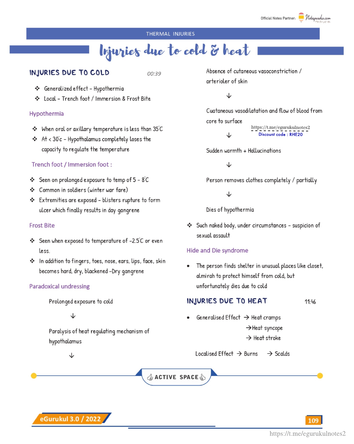 INJURIES DUE TO COLD * Generalized effect - Hypothernia Hypothermia ljunies de te celd & heat Local - Trench foot / Immersion & Frost Bite Trench foot / Immersion foot : When oral oraxillary temperature is less than 35C * At loss of fluid + Salts Sudden and painful paroxysmal cramps of limbs & abdomen Rapid relief on Rehydration In heat cranmps, pupils are dilated Heat Syncope ALso called as → Heat syncope → Heat exhaustion THERMAL INJURIES > Heat prostration Prolonged exposure to high temperature + increased M/S activity Sudden peripherd vascular collapse Person suddenly feels weak, giddy and falls eGurukul 3.0 / 2022 GACTIVE SPACE https:/t.me/egurukulnotes2 Discount code : RHE20 Usually recovers by rest, rarely death many occur due to cardiac failure. Pupils dilated Heat stroke Also called sun stroke Prolonged exposure to high temperature + high humidity + increased M/S activity Failure of heat regulating mech. of Hypothalamus Failure of cutaneous vasodilatation & failure of blood flow Complete absence of sweating Increase body temp → Rectal temp>4c Sudden onset and sudden collapse with loss of consciousness Treatment: lce water bath Pupils are constricted 110 https://t.me/egurukulnotes2
