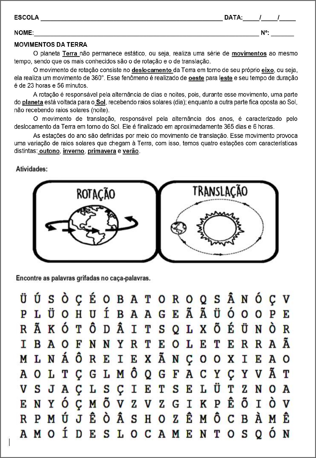 ESCOLA DATA: / / NOME: MOVIMENTOS DA TERRA planeta Terra não permanece estático, ou seja, realiza uma série de movimentos ao mesmo tempo, sendo que os mais conhecidos são o de rotação e o de translação. movimento de rotação consiste no deslocamento da Terra em torno de seu próprio eixo, ou seja, ela realiza um movimento de 360°. Esse fenômeno é realizado de oeste para leste e seu tempo de duração é de 23 horas e 56 minutos. A rotação é responsável pela alternância de dias e noites, pois, durante esse movimento, uma parte do planeta está voltada para o Sol, recebendo raios solares (dia); enquanto a outra parte fica oposta ao Sol, não recebendo raios solares (noite). movimento de translação, responsável pela alternância dos anos, é caracterizado pelo deslocamento da Terra em torno do Sol. Ele é finalizado em aproximadamente 365 dias e 6 horas. As estações do ano são definidas por meio do movimento de translação. Esse movimento provoca uma variação de raios solares que chegam à Terra, com isso, temos quatro estações com características distintas: outono, inverno, primavera e verão. Atividades: ROTAÇÃO TRANSLAÇÃO Encontre as palavras grifadas no caça-palavras. IBAOFNNYRTEOLETERRAÃESCOLA DATA: / / NOME: MOVIMENTOS DA TERRA planeta Terra não permanece estático, ou seja, realiza uma série de movimentos ao mesmo tempo, sendo que os mais conhecidos são o de rotação e o de translação. movimento de rotação consiste no deslocamento da Terra em torno de seu próprio eixo, ou seja, ela realiza um movimento de 360°. Esse fenômeno é realizado de oeste para leste e seu tempo de duração é de 23 horas e 56 minutos. A rotação é responsável pela alternância de dias e noites, pois, durante esse movimento, uma parte do planeta está voltada para o Sol, recebendo raios solares (dia); enquanto a outra parte fica oposta ao Sol, não recebendo raios solares (noite). movimento de translação, responsável pela alternância dos anos, é caracterizado pelo deslocamento da Terra em torno do Sol. Ele é finalizado em aproximadamente 365 dias e 6 horas. As estações do ano são definidas por meio do movimento de translação. Esse movimento provoca uma variação de raios solares que chegam à Terra, com isso, temos quatro estações com características distintas: outono, inverno, primavera e verão. Atividades: ROTAÇÃO TRANSLAÇÃO Encontre as palavras grifadas no caça-palavras. IBAOFNNYRTEOLETERRAÃ