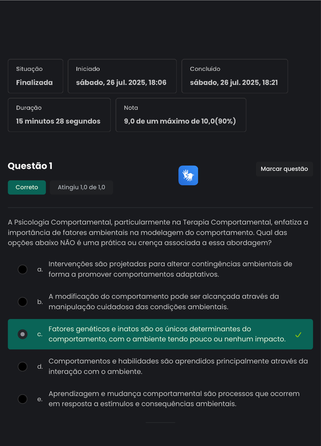 Questão 1 Correto Atingiu 1,0 de 1,0 A Psicologia Comportamental, particularmente na Terapia Comportamental, enfatiza a importância de fatores ambientais na modelagem do comportamento. Qual das opções abaixo NÃO é uma prática ou crença associada a essa abordagem? a. Intervenções são projetadas para alterar contingências ambientais de forma a promover comportamentos adaptativos. b. A modificação do comportamento pode ser alcançada através da manipulação cuidadosa das condições ambientais. c. Fatores genéticos e inatos são os únicos determinantes do comportamento, com o ambiente tendo pouco ou nenhum impacto. d. Comportamentos e habilidades são aprendidos principalmente através da interação com o ambiente. e. Aprendizagem e mudança comportamental são processos que ocorrem em resposta a estímulos e consequências ambientais. Marcar questão 26/07/2025, 17:21 Página 1 de 11 Questão 2 Incorreto Atingiu 0,0 de 1,0 A Terapia Comportamental enfatiza a modificação de contingências ambientais para alterar comportamentos. Qual das seguintes estratégias NÃO é uma prática comum nesta abordagem? a. Utilização de economia de fichas para reforçar comportamentos positivos em ambientes controlados. b. Emprego de desensibilização sistemática para reduzir a ansiedade associada a estímulos específicos. c. Implementação de treinamento em assertividade para melhorar as habilidades sociais do cliente. d. Uso indiscriminado de punições físicas como forma primária de alterar todos os tipos de comportamentos disfuncionais. e. Modificação de contingências ambientais para promover comportamentos adaptativos através de reforço positivo. Marcar questão 26/07/2025, 17:21 Página 2 de 11 Questão 3 Correto Atingiu 1,0 de 1,0 No contexto da Terapia Comportamental, a análise funcional desempenha um papel crucial. Qual das seguintes afirmações melhor descreve sua importância? a. Limita-se ao estudo dos aspectos biológicos dos comportamentos, excluindo fatores ambientais e sociais. b. Foca na análise de traços de personalidade estáticos, ignorando o comportamento dinâmico e a interação com o ambiente. c. A análise funcional é utilizada para identificar variáveis relacionadas aos comportamentos desejáveis e indesejáveis do cliente, permitindo a proposição de estratégias eficazes. d. Serve exclusivamente para determinar o perfil psicológico do cliente, sem influenciar o plano de intervenção terapêutica. e. É um procedimento utilizado apenas no início da terapia, sem necessidade de revisão ao longo do processo terapêutico. Marcar questão 26/07/2025, 17:21 Página 3 de 11 Questão 4 Correto Atingiu 1,0 de 1,0 Na Terapia Comportamental, a atenção é voltada para a análise de comportamentos observáveis e suas relações com o ambiente. Qual das seguintes afirmações melhor exemplifica essa abordagem em relação aos pensamentos e sentimentos? a. Pensamentos e sentimentos são apenas considerados em terapia se forem expressos verbalmente, ignorando seu impacto no comportamento. b. A terapia desconsidera totalmente pensamentos e sentimentos, focando apenas em ações físicas observáveis. c. A abordagem comportamental vê pensamentos e sentimentos como inalteráveis, pois são inerentemente internos e subjetivos. d. Sentimentos e pensamentos são vistos como completamente separados do comportamento, sem influência sobre este. e. Pensamentos e sentimentos são considerados formas de comportamento sujeitos a análise e modificação, refletindo a interação com o ambiente. Marcar questão 26/07/2025, 17:21 Página 4 de 11 Questão 5 Correto Atingiu 1,0 de 1,0 Dentro do contexto da Terapia Comportamental, como a "economia de fichas" é utilizada para modificar o comportamento? a. Uma técnica que utiliza fichas como símbolos sem valor, para demonstrar que reforços externos não são importantes na modificação do comportamento. b. Uma abordagem que envolve dar ao cliente um número fixo de fichas no início da terapia, que são gradualmente retiradas até que nenhum comportamento indesejado reste. c. Um método onde fichas são usadas como uma forma de punição, sendo retiradas do cliente sempre que um comportamento indesejado é exibido. d. É um sistema de reforço no qual "fichas" ou tokens são ganhos por comportamentos específicos e podem ser trocados por reforços desejáveis, encorajando a repetição desses comportamentos. e. Um sistema em que as fichas são distribuídas aleatoriamente, independentemente do comportamento, para estudar os efeitos do acaso no comportamento. Marcar questão 26/07/2025, 17:21 Página 5 de 11 Questão 6 Correto Atingiu 1,0 de 1,0 Em Terapia Comportamental, a generalização de estímulos desempenha um papel importante. Qual das seguintes afirmações melhor explica esse conceito? a. Um processo pelo qual um comportamento se torna menos frequente quando exposto a estímulos que variam drasticamente do estímulo condicionado original. b. A tendência de responder de maneira diferente a estímulos que são perceptivelmente idênticos, enfatizando a distinção entre estímulos. c. A capacidade de um comportamento aprendido em resposta a um estímulo específico ser exibido em resposta a estímulos similares, não exatamente idênticos ao original. d. Um fenômeno pelo qual o comportamento aprendido desaparece completamente quando apresentado em contextos ligeiramente diferentes do contexto de aprendizagem original. e. A prática de limitar as respostas comportamentais a um único estímulo altamente específico, evitando qualquer forma de resposta a estímulos similares. Marcar questão 26/07/2025, 17:21 Página 6 de 11 Questão 7 Correto Atingiu 1,0 de 1,0 Na análise comportamental, a diferenciação entre comportamento respondente e operante é crucial. Qual das seguintes descrições melhor caracteriza o comportamento respondente? a. Descreve uma categoria de comportamento que só pode ser modifica