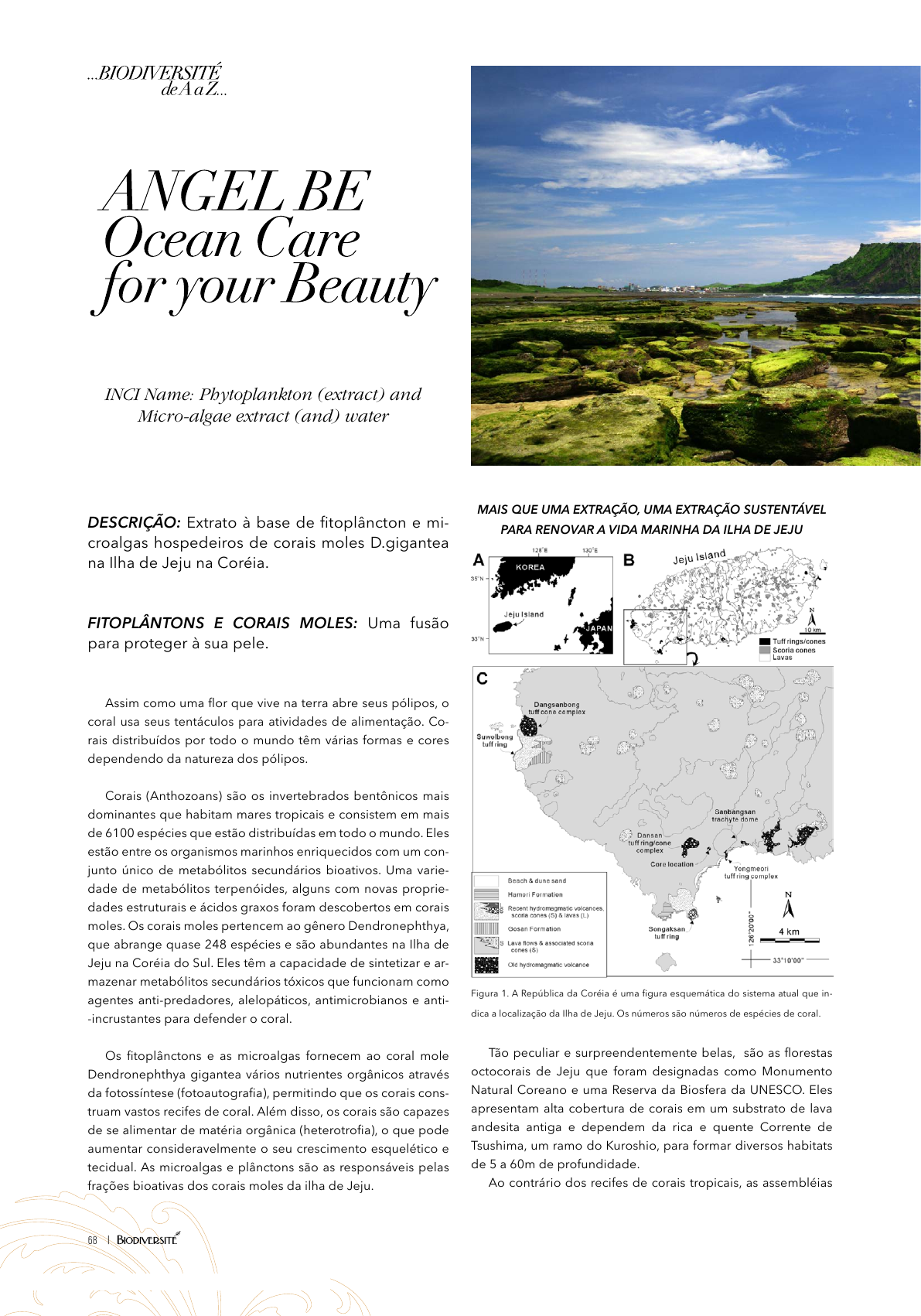 68 INCI Name: Phytoplankton (extract) and Micro-algae extract (and) water DESCRIÇÃO: Extrato à base de fitoplâncton e mi- croalgas hospedeiros de corais moles D.gigantea na Ilha de Jeju na Coréia. FITOPLÂNTONS E CORAIS MOLES: Uma fusão para proteger à sua pele. Assim como uma flor que vive na terra abre seus pólipos, o coral usa seus tentáculos para atividades de alimentação. Co- rais distribuídos por todo o mundo têm várias formas e cores dependendo da natureza dos pólipos. Corais (Anthozoans) são os invertebrados bentônicos mais dominantes que habitam mares tropicais e consistem em mais de 6100 espécies que estão distribuídas em todo o mundo. Eles estão entre os organismos marinhos enriquecidos com um con- junto único de metabólitos secundários bioativos. Uma varie- dade de metabólitos terpenóides, alguns com novas proprie- dades estruturais e ácidos graxos foram descobertos em corais moles. Os corais moles pertencem ao gênero Dendronephthya, que abrange quase 248 espécies e são abundantes na Ilha de Jeju na Coréia do Sul. Eles têm a capacidade de sintetizar e ar- mazenar metabólitos secundários tóxicos que funcionam como agentes anti-predadores, alelopáticos, antimicrobianos e anti- -incrustantes para defender o coral. Os fitoplânctons e as microalgas fornecem ao coral mole Dendronephthya gigantea vários nutrientes orgânicos através da fotossíntese (fotoautografia), permitindo que os corais cons- truam vastos recifes de coral. Além disso, os corais são capazes de se alimentar de matéria orgânica (heterotrofia), o que pode aumentar consideravelmente o seu crescimento esquelético e tecidual. As microalgas e plânctons são as responsáveis pelas frações bioativas dos corais moles da ilha de Jeju. MAIS QUE UMA EXTRAÇÃO, UMA EXTRAÇÃO SUSTENTÁVEL PARA RENOVAR A VIDA MARINHA DA ILHA DE JEJU Figura 1. A República da Coréia é uma figura esquemática do sistema atual que in- dica a localização da Ilha de Jeju. Os números são números de espécies de coral. Tão peculiar e surpreendentemente belas, são as florestas octocorais de Jeju que foram designadas como Monumento Natural Coreano e uma Reserva da Biosfera da UNESCO. Eles apresentam alta cobertura de corais em um substrato de lava andesita antiga e dependem da rica e quente Corrente de Tsushima, um ramo do Kuroshio, para formar diversos habitats de 5 a 60m de profundidade. Ao contrário dos recifes de corais tropicais, as assembléias Conteúdo licenciado para Cristiane Caetana - 69 octocormais temperadas de Jeju são incomuns por serem do- minadas por espécies sem zooxantelas (algas simbióticas) em seus tecidos. Eles são alimentadores de suspensão sésseis, o que significa que cada coral é fixado em uma posição para sua vida útil, e seus pólipos capturam plânctons e matéria orgânica dissolvida à medida que ele passa nas correntes oceânicas. D. gigantea é uma espécie dominante na mais meridional parte costeira da Coréia, em regiões temperadas e subtropicais onde anualmente a temperatura varia de 14 a 26 °C. Em geral, colô- nias dessa espécie habitam a água de 10 a 20 m de profundi- dade. O genoma mitocondrial de D. gigantea foi de 18.842 pb em comprimento, compreendendo 14 genes codificadores de pro- teínas, dois rRNAs, e apenas um ARNt. O tamanho do genoma de D. gigantea é 276 Mb. Cerca de 12% do seu genoma é com- posto por elementos repetitivos e 28,879 genes codificadores de proteínas. Este conjunto de genes é composto de 94% dos genes avaliados completos, o que é o segundo maior valor en- tre os nidíndios, indicando alta qualidade. Na análise molecu- lar do ácido nucleico-molecular, octocoral e hexorresistencial, foram estimados em 544MYA. O que pode justificar o fato dos corais moles apresentarem maior resistência ao aquecimento global, acidificação oceânica e mudanças ambientais. A figura abaixo mostra um coral Dendronephthya gigantea e seus com- postos bioativos. Figura 2. Dendronephthya gigantea Jeju é uma ilha. Ao redor desta ilha existem algumas áre- as de proteção que são monitoradas pelo governo. Os corais moles apresentam alta capacidade de multiplicação e devido a essa propriedade muitas áreas ao redor da ilha de Jeju ficam cobertas por corais moles o que dificulta a vida marinha e so- brevivência de outras espécies. Então uma forma de controlar o seu crescimento e garantir a sobrevivência e harmônia das espécies marinhas é a utilização de fitoplânctons e microalgas utilizados pelos corais moles. ANGEL BE é obtido por processo extração controlada e sus- tentável de fitoplâctons e microalgas que atuam como “hospe- deiros”de corais moles na ilha de Jeju. Como os corais moles não sofrem branqueamento, são resistentes e se multiplicam rápido demais, a utilização de compostos bioativos que auxi- liam na sua sobrevivência é de vital importância para que sua presença nos oceanos seja para equilibrio da vida marinha. A figura abaixo mostra um coral mole D.gigantea. Figura 3. (A) colônias adultas totalmente expandidas. (B) uma larva livre. Barra de escala vermelha indica 200 μm. Os fitoplânctons compreendem diversas linhagens de vida que sustentam as cadeias alimentares e pesqueiras marinhas, e contribuiem para o ciclo global do carbono. Geograficamente, a ilha de Jeju, na Coréia, está localizada na zona temperada. No entanto, com base na temperatura do ar e presença de pei- xes tropicais, invertebrados e dinoflagelados oceânicos, acre- dita-se ser uma região de transição sobreposta entre as zonas temperadas e subtropicais. Esses organismos são importantes para a monitorar as alterações ambientais nas águas costeiras ao redor da ilha de Jeju. ANGEL BE – O GUARDIÃO DOS OCEANOS PROTEGE A SUA E A PELE DOS GOLFINHOS Os golfinhos da Ilha de Jeju, “golfinhos-nariz-de-garrafa”, se automedicam com ANGEL BE esfregando a sua barriguinha nos corais moles complexados com fitoplânctons que forne