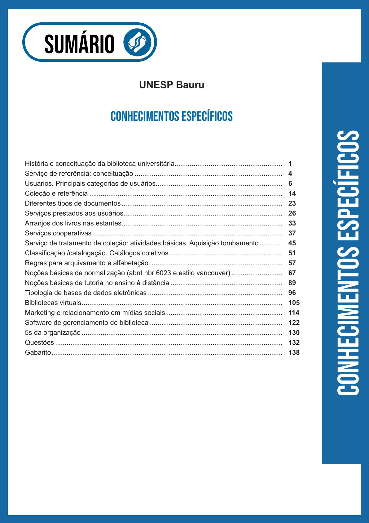 sumário História e conceituação da biblioteca universitária......................................................... 1 Serviço de referência: conceituação .............................................................................. 4 Usuários. Principais categorias de usuários................................................................... 6 Coleção e referência ...................................................................................................... 14 Diferentes tipos de documentos ..................................................................................... 23 Serviços prestados aos usuários.................................................................................... 26 Arranjos dos livros nas estantes..................................................................................... 33 Serviços cooperativas .................................................................................................... 37 Serviço de tratamento de coleção: atividades básicas. Aquisição tombamento ............ 45 Classificação /catalogação. Catálogos coletivos ............................................................ 51 Regras para arquivamento e alfabetação ...................................................................... 57 Noções básicas de normalização (abnt nbr 6023 e estilo vancouver) ........................... 67 Noções básicas de tutoria no ensino à distância ........................................................... 89 Tipologia de bases de dados eletrônicas ....................................................................... 96 Bibliotecas virtuais .......................................................................................................... 105 Marketing e relacionamento em mídias sociais.............................................................. 114 Software de gerenciamento de biblioteca ...................................................................... 122 5s da organização .......................................................................................................... 130 Questões ........................................................................................................................ 132 Gabarito .......................................................................................................................... 138 Co nh ec im en to s E sp ec ífi co s UNESP Bauru Conhecimentos Específicos O conteúdo deste livro eletrônico é licenciado para LIVIA FERREIRA SOARES MESSIAS - 311.995.018-16, vedada, por quaisquer meios e a qualquer título, a sua reprodução, cópia, divulgação ou distribuição, sujeitando-se aos infratores à responsabilização civil e criminal. 1 História e conceituação da Biblioteca Universitária — História do livro1 O que conhecemos como livro chegou ao seu aspecto atual após intensas e constantes modificações, que alteraram, inclusive, o seu significado. Hoje o vemos como algo corriqueiro, mas no passado foi um símbolo de poder e status, acessível apenas a uma pequena parcela da população. Seu papel como veículo de conheci- mento e informação, contudo, permanece o mesmo, ainda que esse processo também tenha assumido diferen- tes formas, de acordo com a época e o local. As primeiras representações gráficas que conhecemos são as chamadas pinturas rupestres – existentes há aproximadamente 32.000 anos – e os petroglifos, desenhos gravados em pedra. No Egito antigo, os “escribas” ou escrivães eram pessoas responsáveis pela leitura e produção dos textos nos papiros, espécies de plantas usadas desde 2500 a.C., as quais, por sua vez, constituíam um grande rolo de folhas pregadas umas às outras. Assim surgiram os pergaminhos, suportes de peles de animais (carneiro, cabra, ovelha, etc.), muito utilizados pelos “monges copistas” da Idade Média. Na Idade Média os livros eram considerados objetos de imenso valor e por isso, acessível somente para uma pequena parte da população (nobreza e o clero). Além disso, muitos livros eram considerados impróprios pela Igreja Católica, que dominava o cenário do medievo. Essas obras foram reunidas num livro denominado “Index Librorum Prohibitorum” ou “Índice dos Li- vros Proibidos”. A maioria dos livros eram de religião, enquanto outros de história, astronomia, literatura e filosofia, ficavam restrito a um número menor ainda. Nesse contexto, importante destacar que a maioria das pessoas, não sabiam ler ou escrever, o que dificul- tava ainda mais a disseminação desse conhecimento, guardado nas bibliotecas a “sete chaves”. Um fato muito importante que ocorreu em fins da Idade Média, ou ainda, da passagem da Idade Média para a Idade Moderna, foi o surgimento da Imprensa, em meados do século XV. Na Europa, fatores como o declínio do sistema feudal, o surgimento da burguesia, a Reforma Protestante, foram afastando as imposições da Igreja e abrindo um leque de possibilidades para as pessoas, que ao mesmo tempo, se sentiam impossibilitadas de expressarem suas opiniões. Esses acontecimentos impulsionaram a elaboração de métodos de impressão tal qual a prensa móvel, (já descoberta na China por Pi Sheng) pelo alemão Johannes Gutenberg (1398-1468). A partir de sua técnica, aperfeiçoada dos asiáticos, Gutenberg produziu o primeiro “livro” na Europa deno- minado “Bíblia de Gutemberg”, (entre 1400 e 1456), com tiragem de 180 exemplares. Esse sistema de impressão, jamais antes visto pela população europeia, foi o fulcro necessário para permitir o acesso aos livros ao restante da população. A partir daí, a popularização do livro ganhou força no mundo inteiro, considerado atualmente um dos obje- tos mais importantes de acesso ao conhecimento. Com o tempo, foram surgindo livros de didáticos, livros de estórias infantis, livros de poesias, dentre outros. O livro, um produto intelectual, surgiu da necessi