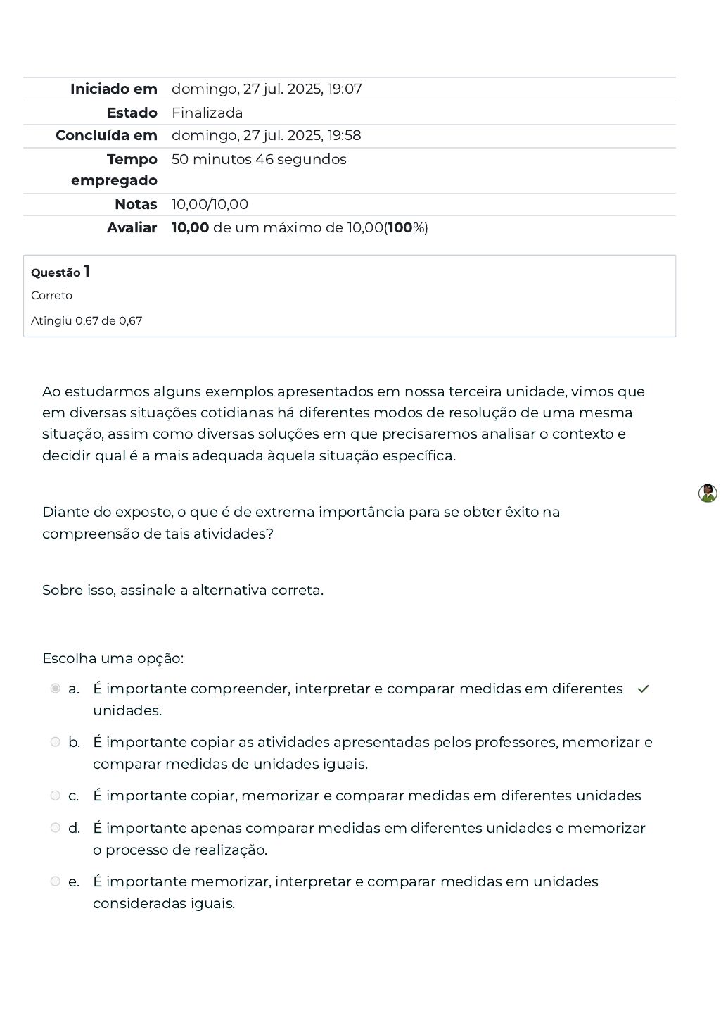 Iniciado em domingo, 27 jul. 2025, 19:07 Estado Finalizada Concluída em domingo, 27 jul. 2025, 19:58 Tempo empregado 50 minutos 46 segundos Notas 10,00/10,00 Avaliar 10,00 de um máximo de 10,00(100%) Questão 1 Correto Atingiu 0,67 de 0,67 Ao estudarmos alguns exemplos apresentados em nossa terceira unidade, vimos que em diversas situações cotidianas há diferentes modos de resolução de uma mesma situação, assim como diversas soluções em que precisaremos analisar o contexto e decidir qual é a mais adequada àquela situação específica. Diante do exposto, o que é de extrema importância para se obter êxito na compreensão de tais atividades? Sobre isso, assinale a alternativa correta. Escolha uma opção: a. É importante compreender, interpretar e comparar medidas em diferentes unidades. ✓ b. É importante copiar as atividades apresentadas pelos professores, memorizar e comparar medidas de unidades iguais. c. É importante copiar, memorizar e comparar medidas em diferentes unidades d. É importante apenas comparar medidas em diferentes unidades e memorizar o processo de realização. e. É importante memorizar, interpretar e comparar medidas em unidades consideradas iguais. Questão 2 Correto Atingiu 0,67 de 0,67 Observe a imagem abaixo contendo atividade relacionada a área: Diante do exposto, qual o propósito em trabalharmos esse tipo de atividade? Assinale a alternativa correta. Escolha uma opção: a. Fazer com que os alunos ampliem seus conhecimentos sobre medidas de superfície, explorando o cálculo de volume de uma figura não regular desconsiderando estimativas. b. Fazer com que os alunos ampliem seus conhecimentos sobre medidas de superfície, explorando o cálculo de área de uma figura não regular por meio de estimativas. ✓ c. Fazer com que os alunos reduzam seus conhecimentos sobre medidas de superfície e cálculo de área de uma figura não regular por meio de estimativas. d. Fazer com que os alunos ampliem seus conhecimentos sobre medidas de volume, explorando o cálculo de área de uma figura não regular desconsiderando estimativas. e. Fazer com que os alunos ampliem seus conhecimentos sobre medidas de superfície, explorando o cálculo de volume de uma figura regular por meio de estimativas. Questão 3 Correto Atingiu 0,67 de 0,67 Políticas públicas são ações governamentais com a missão de atender a certas demandas da sociedade, tendo como objetivo satisfazer determinados interesses econômicos, políticos, sociais e culturais. Os responsáveis legais por elaborar e aplicar as políticas públicas são aqueles que detêm o poder público, no entanto, estes podem aceitar propostas de movimentos sociais e organizações da sociedade civil, e também fechar parcerias para colocar as medidas em prática. De acordo com o nosso material de estudos, qual das alternativas abaixo não é uma parceira para essas medidas? Escolha uma opção: a. Sindicatos. b. Prefeituras. ✓ c. Entidades profissionais. d. Empresas. e. Organizações não governamentais. Questão 4 Correto Atingiu 0,67 de 0,67 Com base na leitura das horas em relógios, julgue verdadeiro (V) ou falso (F) as asserções abaixo: (___) Os relógios analógicos, dependendo da configuração, podem mostrar as horas no padrão 24 horas ou no padrão 12 horas. (___) Os relógios analógicos têm dois ponteiros, sendo um mostrando a hora e outro marcando os minutos. (___) Em alguns modelos de relógios analógicos podemos observar um ponteiro mais fino que os outros dois, que demonstra a passagem dos segundos. (___) Os relógios digitais mostram as horas no formato "horas: minutos”. (___) A sigla AM encontrada em relógios digitais, significa antes do meio-dia. Escolha uma opção: a. V - V - V -V - F. b. F - V - V - V - V. ✓ c. V - V - V - F - V. d. V - V - F - V - V. e. V - F - V - V - V. Questão 5 Correto Atingiu 0,67 de 0,67 Ao trabalharmos em sala de aula problemas envolvendo capacidade, os alunos podem apresentar algumas dificuldades na realização das atividades, por exemplo, dificuldade em organizar e interpretar o problema. Diante de tal dificuldade, analise as afirmativas abaixo referente às intervenções que podem ser realizadas pelo professor, julgue Verdadeiro (V) ou Falso (F). ( ) O professor pode escrever no quadro como realizar a atividade e pedir aos alunos que copiem as informações fornecidas em seus cadernos; ( ) O professor pode questionar ao aluno sobre situações do seu cotidiano como também a atividade realizada no aquecimento e relacionar com a atividade principal; ( ) O professor deve permitir ao aluno anotar as informações fornecidas de maneira desorganizada e ir calculando as medidas de áreas solicitadas; ( ) O professor pode pedir para o aluno ler a questão e ir anotando as informações fornecidas de maneira organizada e ir calculando as medidas de áreas solicitadas; ( ) O professor deve deixar que o aluno decida quais atividades preferem fazer. Assinale a alternativa correta: Escolha uma opção: a. F-V-F-V-F ✓ b. F-F-V-V-V c. V-F-F-F-F d. V-V-V-V-V e. F-V-V-V-F Questão 6 Correto Atingiu 0,67 de 0,67 Assinale a alternativa que apresenta os objetivos encontrados na unidade temática “Grandezas e Medidas” no 9º ano do ensino fundamental. I- Área do círculo e comprimento de sua circunferência. II- Unidades de medida para medir distâncias muito grandes e muito pequenas. III- Volume de prismas e cilindros. IV- Unidades de medida utilizadas na informática. Escolha uma opção: a. Apenas I, III e IV estão corretos. b. Apenas I, II e IV estão corretos. c. Apenas II, III e IV estão corretos. ✓ d. Apenas I, II e III estão corretos. e. I, II, III e IV estão corretos. Questão 7 Correto Atingiu 0,67 de 0,67 O Vovô Pedro gosta muito de beber sucos prontos e refrigerantes. Olhando as informações nutricionais, vi que em cada garrafa de 280 ml de refrigerante que ele bebe tem uma grande quantidade de açúcar. São em torno de 31 g de açú