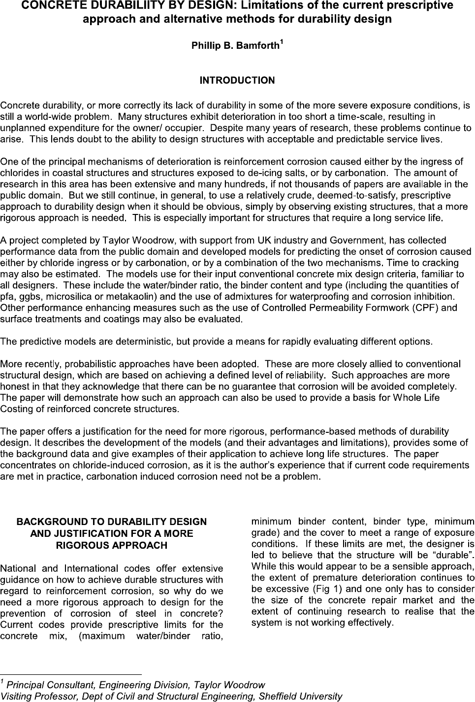 CONCRETE DURABILIITY BY DESIGN: Limitations of the current prescriptive approach and alternative methods for durability design Phillip B. Bamforth¹ INTRODUCTION Concrete durability, or more correctly its lack of durability in some of the more severe exposure conditions, is still a world-wide problem. Many structures exhibit deterioration in too short a time-scale, resulting in unplanned expenditure for the owner/ occupier. Despite many years of research, these problems continue to arise. This lends doubt to the ability to design structures with acceptable and predictable service lives. One of the principal mechanisms of deterioration is reinforcement corrosion caused either by the ingress of chlorides in coastal structures and structures exposed to de-icing salts, or by carbonation. The amount of research in this area has been extensive and many hundreds, if not thousands of papers are available in the public domain. But we still continue, in general, to use a relatively crude, deemed-to-satisfy, prescriptive approach to durability design when it should be obvious, simply by observing existing structures, that a more rigorous approach is needed. This is especially important for structures that require a long service life. A project completed by Taylor Woodrow, with support from UK industry and Government, has collected performance data from the public domain and developed models for predicting the onset of corrosion caused either by chloride ingress or by carbonation, or by a combination of the two mechanisms. Time to cracking may also be estimated. The models use for their input conventional concrete mix design criteria, familiar to all designers. These include the water/binder ratio, the binder content and type (including the quantities of pfa, ggbs, microsilica or metakaolin) and the use of admixtures for waterproofing and corrosion inhibition. Other performance enhancing measures such as the use of Controlled Permeability Formwork (CPF) and surface treatments and coatings may also be evaluated. The predictive models are deterministic, but provide a means for rapidly evaluating different options. More recently, probabilistic approaches have been adopted. These are more closely allied to conventional structural design, which are based on achieving a defined level of reliability. Such approaches are more honest in that they acknowledge that there can be no guarantee that corrosion will be avoided completely. The paper will demonstrate how such an approach can also be used to provide a basis for Whole Life Costing of reinforced concrete structures. The paper offers a justification for the need for more rigorous, performance-based methods of durability design. It describes the development of the models (and their advantages and limitations), provides some of the background data and give examples of their application to achieve long life structures. The paper concentrates on chloride-induced corrosion, as it is the author's experience that if current code requirements are met in practice, carbonation induced corrosion need not be a problem. BACKGROUND TO DURABILITY DESIGN minimum binder content, binder type, minimum AND JUSTIFICATION FOR A MORE grade) and the cover to meet a range of exposure RIGOROUS APPROACH conditions. If these limits are met, the designer is led to believe that the structure will be "durable". National and International codes offer extensive While this would appear to be a sensible approach, guidance on how to achieve durable structures with the extent of premature deterioration continues to regard to reinforcement corrosion, so why do we be excessive (Fig 1) and one only has to consider need a more rigorous approach to design for the the size of the concrete repair market and the prevention of corrosion of steel in concrete? extent of continuing research to realise that the Current codes provide prescriptive limits for the system is not working effectively. concrete mix, (maximum water/binder ratio, 1 Principal Consultant, Engineering Division, Taylor Woodrow Visiting Professor, Dept of Civil and Structural Engineering, Sheffield UniversityA review of the current 'deemed-to-satisfy' In accordance with the above definitions adequate approach to durability design leads very quickly to design for durability demands the ability to be able an understanding of why a more rigorous method to predict performance. An obvious approach for durability design is needed if we are, as an would be as follows; industry, to avoid continuing problems and costly repairs. a) Define the actions (environmental loads) on the structure. b) Define what constitutes the end of the design life, i.e. the condition limit state that defines the end of serviceability. c) Define the required performance of the cover concrete to achieve a low risk of the defined condition limit-state being reached. d) Establish models (scientific or empirical or pseudo-empirical) that define how the actions cause changes in the condition of the structure and use these models to estimate Fig 1 Corrosion of reinforcement causing cracking, the time until the structure ceases to be spalling and delamination of concrete cover serviceable in accordance with the defined condition limit state. The codes adopt one of two approaches to durability design, prevention or retardation. In this respect, current codes and standards Prevention of a deterioration process is achieved generally fall a long way short. by the selection of appropriate mix constituents, such that one of the elements required for the The (environmental) loading on the structure is deleterious reaction is eliminated and the reaction not quantified. cannot, therefore, take place. Examples of this approach include, Codes currently define whether or not a particular action must be considered, e.g. the presence of a) The use of sulfate resisting cement, which has salt, but do not quantify the extent. Consider, for a a low content of tricalcium aluminate, C3A, the mo