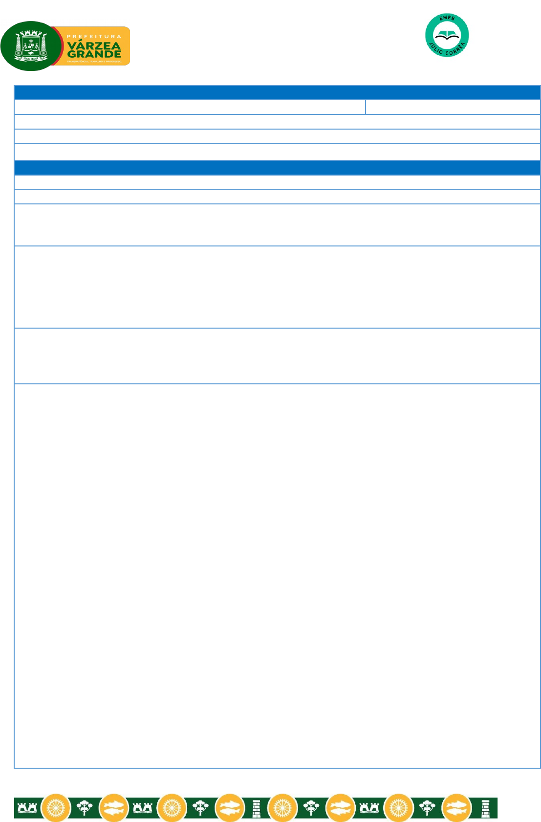 Secretaria Municipal de Educação, Cultura, Esporte e Lazer - SMECEL Dados de Identificação Escola Municipal de Educação Básica – Júlio Corrêa Professor(a): Ano/turma: 2º anos Data: 03/06/2025 Terça-feira Coordenador (a): Valdiele Gonçalina de Campos e Vanessa Gabriely da Silva. Plano de Aula 1. Área de Conhecimento: Linguagens /Ciências Humanas 2. Componente Curricular: Língua Portuguesa/ História. 3. Campo de Atuação e Prática de Linguagem/ Unidade temática: Análise linguística/semiótica (Alfabetização) A comunidade e seus registros. 4.Habilidades: (EF02LP07) Escrever palavras, frases, textos curtos nas formas imprensa e cursiva. (EF12LP19) Reconhecer, em textos versificados, rimas, sonoridades, jogos de palavras, palavras, expressões, comparações, relacionando-as com sensações e associações. (EF02HI07) Identificar e utilizar diferentes marcadores do tempo presentes na comunidade, como relógio e calendário. 5. Objetos de Conhecimento: Conhecimento das diversas grafias do alfabeto/Acentuação. Formas de composição de textos poéticos. O tempo como medida. 6. Desenvolvimento 1º Momento: Atividades permanente: · Acolhida na quadra. (Músicas infantis, poemas e entre outros.)10min · Café da manhã. 10min · Acolhida em sala música: A escolha de cada professor10min · Leitura dos cartazes: Calendário/ dias da semana/alfabeto /vogais/numerais/famílias silábicas simples e complexas, palavras.15min · Leitura deleite: Meu amigo Dow – Autora e revisora: Claudia Werneck · Perguntas para serem realizadas após a leitura: Qual o titulo do texto? Quais os personagens da história? Qual o assunto principal do texto?20min 2° Momento: Apresentar o cabeçalho no quadro fazendo as orientações para cada aluno copiar no caderno, não esquecendo de escrever o seu nome completo e data de nascimento, fazer a contagem dos alunos e registrar junto ao cabeçalho (Quantos alunos somos hoje? Quantas meninas? Quantos meninos?), em seguida, fazer as intervenções necessárias. 20min 3° momento: Livro alfabetiza – MT – Unidade 3: Capitulo 15: Revisando a escrita de poemas. No livro do aluno na página 113 e 114, seguindo as orientações descritas no livro do professor páginas 53 e 54 da unidade 03.50min 4° Momento: Aula de Língua Portuguesa: Vamos trabalhar a parlenda da casinha da vovó. Nesta atividade os estudantes irão transcrever a parlenda em letra cursiva .60min Atividade será copiada no caderno. 5° Momento: Intervalo (lanche) 15min 6° Momento: Aula de História: Vamos falar sobre o tempo e história mudam de tempo Livro de História Aprender Juntos página 41. Tarefa de casa: Livro de História Aprender Juntos página 54 e 55.40min 7º Momento: Organização da sala e do material e aguardar a saída. 10min 7. Recursos: Apagador. Caneta para quadro, caderno, lápis, borracha, lápis de core livro alfabetiza. 8. Avaliação: A avaliação priorizará o processo pelo qual o aluno desenvolve sua prática educacional, com registros escritos e observações feitas pelo professor, sendo este um processo contínuo. 9 Referencia:DRC –MT, BNCC, Matriz curricular de referência – Para Anos Iniciais: Secretaria Municipal de Educação, Cultura, Esporte e Lazer– Smecel/Várzea Grande/MT/2022.Livro de História Aprender Juntos.Livro ALFABETIZA MT – 2º Ano / Volume 1 Transcreva a parlenda em letra cursiva. Dados de Identificação Escola Municipal de Educação Básica – Júlio Corrêa Professor(a): Ano/turma: 2º anos Data:04/06/2025 Quarta-feira Coordenador (a): Valdiele Gonçalina de Campos e Vanessa Gabriely da Silva. Plano de Aula 1. Área de Conhecimento: Linguagens / Ciências da Natureza / Ensino Religioso. 2. Componente Curricular: Língua Portuguesa/ Ciências/Ensino Religioso/ Artes. 3. Campo de Atuação e Prática de Linguagem/Unidade Temática: Análise linguística/semiótica (Alfabetização) Vida e evolução Identidades e alteridades Dança 4. Habilidades: (EF02LP07) Escrever palavras, frases, textos curtos nas formas imprensa e cursiva. (EF12LP19) Reconhecer, em textos versificados, rimas, sonoridades, jogos de palavras, palavras, expressões, comparações, relacionando-as com sensações e associações. (EF02CI06) Identificar as principais partes de uma planta (raiz, caule, folhas, flores e frutos) e a função desempenhada por cada uma delas, e analisar as relações entre as plantas, o ambiente e os demais seres vivos. (EF01ER03) Reconhecer e respeitar as características físicas e subjetivas de cada um. (EF15AR10) Experimentar diferentes formas de orientação no espaço (deslocamentos, planos, direções, caminhos etc.) e ritmos de movimento (lento, moderado e rápido) na construção do movimento dançado. 5. Objetos de Conhecimento: Conhecimento das diversas grafias do alfabeto/Acentuação. Formas de composição de textos poéticos. Seres vivos no ambiente Plantas Imanência e transcendência. Elementos da linguagem. 6. Desenvolvimento 1º Momento: Atividades permanente: · Acolhida no patio. (Músicas infantis, poemas e entre outros.)10min · Café da manhã. 10min · Acolhida em sala música: A escolha de cada professor10min · Leitura dos cartazes: Calendário/ dias da semana/alfabeto /vogais/numerais/famílias silábicas simples e complexas, palavras.15min · Leitura deleite: A familia do Marcelo Autora e revisora: Ruth Rocha Perguntas para serem realizadas após a leitura: Qual é o título do texto? Quais os personagens da história? Qual o assunto principal do texto? O que essa história pode nos ensinar para o nosso dia a dia?20min 2° Momento: Apresentar o cabeçalho no quadro fazendo as orientações para cada aluno copiar no caderno, não esquecendo de escrever o seu nome completo e data de nascimento, fazer a contagem dos alunos e registrar junto ao cabeçalho (Quantos alunos somos hoje? Quantas meninas? Quantos meninos?), em seguida, fazer as intervenções necessárias. 20min 3° momento: Livro alfabeti