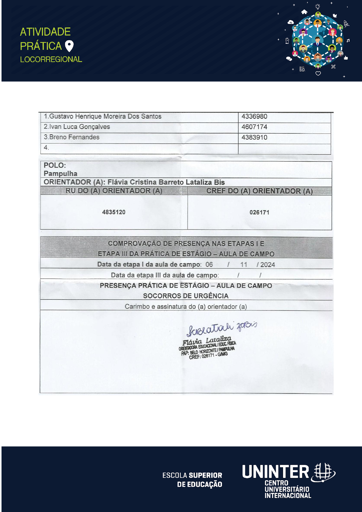 FICHA-RESPOSTA EDUCAÇÃO FÍSICA DISCIPLINA: SOCORROS DE URGÊNCIA 1 PROCEDIMENTO 1 TEMA 2 procedimentos básicos que devem ser adotados em caso de obstrução de vias aéreas. NOME DO PROCEDIMENTO manobra de heimlich MATERIAIS UTILIZADOS Conhecimento DESCRIÇÃO DO PROCEDIMENTO 1 Posicionar-se por detrás da vítima, envolvendo a com os braços; Fechar uma das mãos com o polegar para baixo, posicionando -a na região superior do abdômen, entre o umbigo e caixa torácica; Colocar a mão livre sobre o punho fechado, agarrando firmemente; Puxar com força ambas as mãos para dentro e para cima, como se desenhasse um "j"ou uma vírgula com o punho ; Repetir a manobra até que a respiração melhore. FOTO DA APLICAÇÃO PRÁTICA DO PROCEDIMENTO 1 2 PROCEDIMENTO 2 TEMA 2 procedimentos básicos que devem ser adotados em caso de obstrução de vias aéreas. NOME DO PROCEDIMENTO Percussão nas costas ou golpes dorsais MATERIAIS UTILIZADOS Conhecimento DESCRIÇÃO DO PROCEDIMENTO 2 Posicionar-se lateralmente por detrás da vítima, envolvendo a com um braço por baixo de uma axila e firmando o antebraço à frente do tronco e segurando no ombro; Com a outra mão serão realizados 5 golpes com a palma da mão e pulso (manter dedos estendidos); Os golpes devem ser realizados na região interescapular (região superior central das costas) FOTO DA APLICAÇÃO PRÁTICA DO PROCEDIMENTO 2 3 APLICAÇÃO LOCORREGIONAL A Rede de Urgência e emergência em Belo Horizonte é compostas: Pelas UPAs, dispostas em toda cidade, e pelos Hospitais de pronto atendimento da rede SUS-BH: Hospital João XXIII, Hospital das Clínicas, Hospital Odilon Behrens, Hospital Júlia Kubitscheck, Hospital Risoleta Tolentino Neves e Hospital Infantil João Paulo II. Supondo que fosse necessário prestar primeiros socorros a uma pessoa que tenha as vias aéreas obstruídas, dentro do polo Uninter Pampulha, a primeira coisa a se fazer seria tentar Percussão nas costas ou a manobra de Heimlich, e após o procedimento encaminhar a pessoa Para UPA Santa Terezinha, pois seria o serviço de urgência mais próximo. UPA Pampulha - Av. Santa Terezinha, 515 - Santa Terezinha, Belo Horizonte - MG, 31360-000 Telefone: (31) 3277-8435 4 https://www.google.com/search?sca_esv=fb0328165e44674a&sxsrf=ADLYWIL3L16CAF6e5MkjNiNSzOshjd-jYg:1732215801451&q=upa+pampulha+telefone&ludocid=27772920045254730&sa=X&sqi=2&ved=2ahUKEwi6gpTcju6JAxVhF7kGHRXfAKYQ6BN6BAg9EAI https://www.google.com/search?q=upa+santa+terezinha&oq=upa+Santa+Ter&gs_lcrp=EgZjaHJvbWUqDQgAEAAY4wIYyQMYgAQyDQgAEAAY4wIYyQMYgAQyFggBEC4YrwEYxwEYkgMYyQMYgAQYjgUyBwgCEAAYgAQyBwgDEAAYgAQyBwgEEAAYgAQyBggFEEUYOTINCAYQLhivARjHARiABDIHCAcQABiABDINCAgQLhivARjHARiABDINCAkQLhivARjHARiABNIBCDI5NTNqMGo5qAIAsAIB&sourceid=chrome&ie=UTF-8#