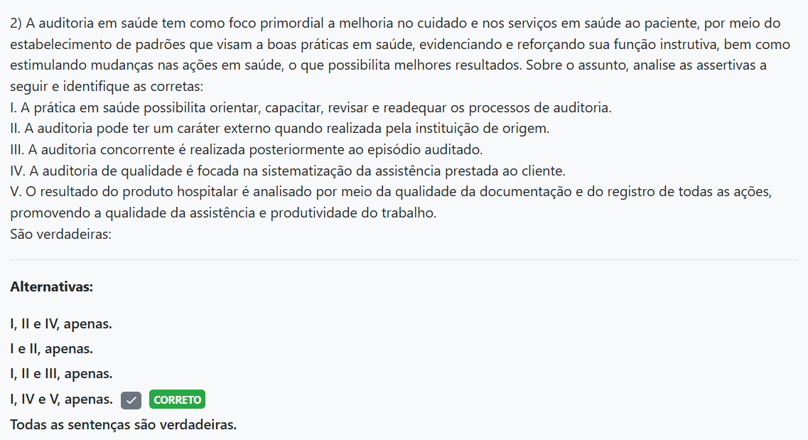 2) A auditoria em saúde tem como foco primordial a melhoria no cuidado e nos serviços em saúde ao paciente, por meio do estabelecimento de padrões que visam a boas práticas em saúde, evidenciando e reforçando sua função instrutiva, bem como estimulando mudanças nas ações em saúde, O que possibilita melhores resultados. Sobre O assunto, analise as assertivas a seguir e identifique as corretas: I. A prática em saúde possibilita orientar, capacitar, revisar e readequar processos de auditoria. II. A auditoria pode ter um caráter externo quando realizada pela instituição de origem. III. A auditoria concorrente é realizada posteriormente ao episódio auditado. IV. A auditoria de qualidade é focada na sistematização da assistência prestada ao cliente. V.O resultado do produto hospitalar é analisado por meio da qualidade da documentação e do registro de todas as ações, promovendo a qualidade da assistência e produtividade do trabalho. São verdadeiras: Alternativas: I, II e IV, apenas. I e II, apenas. I, II e III, apenas. I, IV e V, apenas. CORRETO Todas as sentenças são verdadeiras.