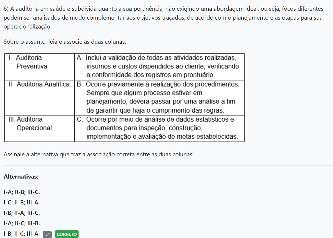 6) A auditoria em saúde é subdivida quanto a sua pertinência, não exigindo uma abordagem ideal, ou seja, focos diferentes podem ser analisados de modo complementar aos objetivos traçados, de acordo com planejamento e as etapas para sua operacionalização. Sobre assunto, leia e associe as duas colunas: I. Auditoria A. Inclui a validação de todas as atividades realizadas, Preventiva insumos e custos dispendidos ao cliente, verificando a conformidade dos registros em prontuário. II. Auditoria Analítica B. Ocorre previamente à realização dos procedimentos. Sempre que algum processo estiver em planejamento, deverá passar por uma análise a fim de garantir que haja cumprimento das regras. III. Auditoria C. Ocorre por meio de análise de dados estatísticos e Operacional documentos para inspeção, construção, implementação e avaliação de metas estabelecidas. Assinale a alternativa que traz a associação correta entre as duas colunas: Alternativas: I-A; II-B; III-C. I-C; II-B; III-A. I-B; II-A; III-C. I-A; II-C; III-B. I-B; II-C; III-A. CORRETO