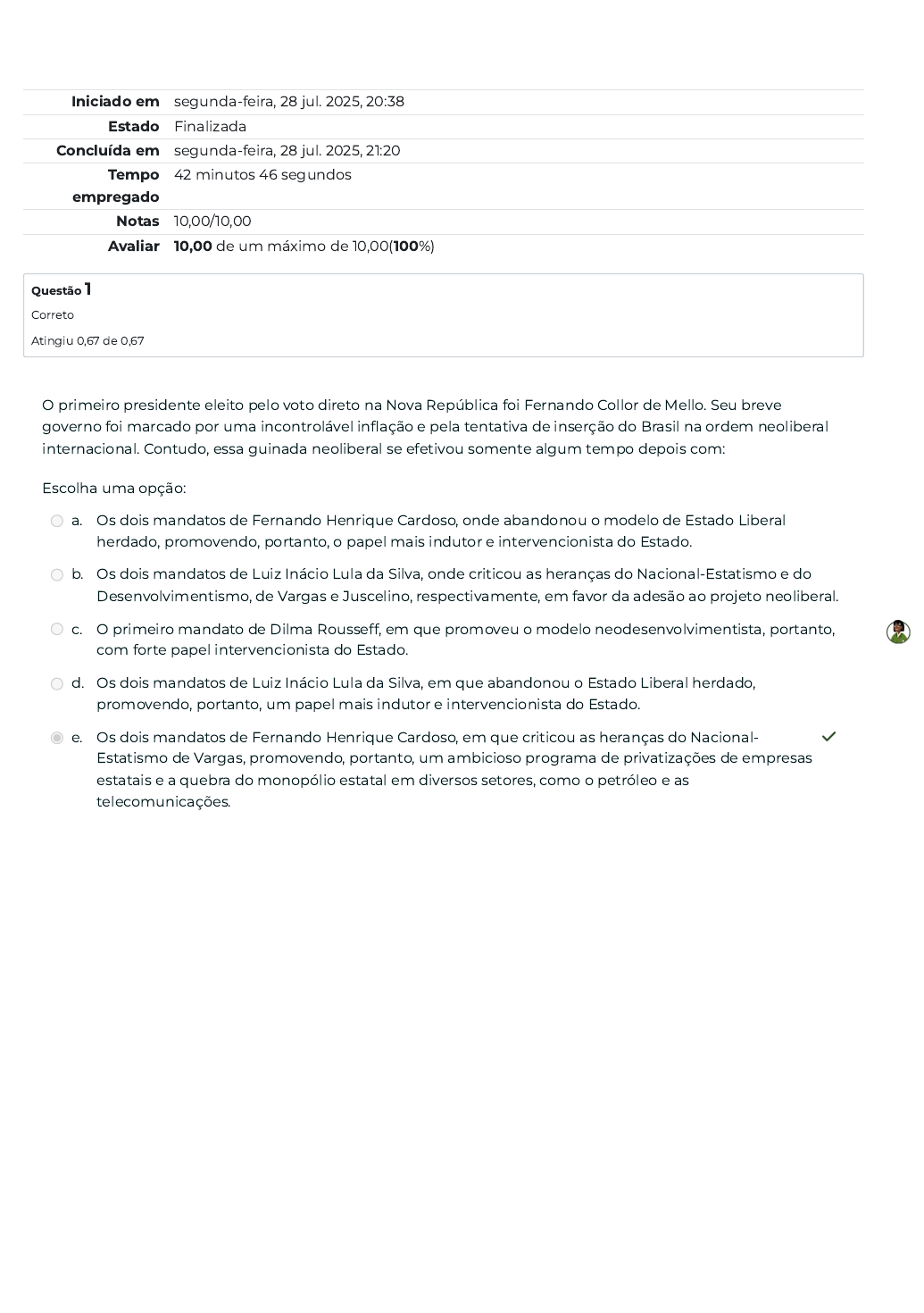 Iniciado em segunda-feira, 28 jul. 2025, 20:38 Estado Finalizada Concluída em segunda-feira, 28 jul. 2025, 21:20 Tempo empregado 42 minutos 46 segundos Notas 10,00/10,00 Avaliar 10,00 de um máximo de 10,00(100%) Questão 1 Correto Atingiu 0,67 de 0,67 O primeiro presidente eleito pelo voto direto na Nova República foi Fernando Collor de Mello. Seu breve governo foi marcado por uma incontrolável inflação e pela tentativa de inserção do Brasil na ordem neoliberal internacional. Contudo, essa guinada neoliberal se efetivou somente algum tempo depois com: Escolha uma opção: a. Os dois mandatos de Fernando Henrique Cardoso, onde abandonou o modelo de Estado Liberal herdado, promovendo, portanto, o papel mais indutor e intervencionista do Estado. b. Os dois mandatos de Luiz Inácio Lula da Silva, onde criticou as heranças do Nacional-Estatismo e do Desenvolvimentismo, de Vargas e Juscelino, respectivamente, em favor da adesão ao projeto neoliberal. c. O primeiro mandato de Dilma Rousseff, em que promoveu o modelo neodesenvolvimentista, portanto, com forte papel intervencionista do Estado. d. Os dois mandatos de Luiz Inácio Lula da Silva, em que abandonou o Estado Liberal herdado, promovendo, portanto, um papel mais indutor e intervencionista do Estado. e. Os dois mandatos de Fernando Henrique Cardoso, em que criticou as heranças do Nacional- Estatismo de Vargas, promovendo, portanto, um ambicioso programa de privatizações de empresas estatais e a quebra do monopólio estatal em diversos setores, como o petróleo e as telecomunicações. ✓ Questão 2 Correto Atingiu 0,67 de 0,67 Questão 3 Correto Atingiu 0,68 de 0,68 No contexto das reformas urbanas no Rio de Janeiro de 1904, eclodiu o que pode ser visto com uma das maiores revoltas urbanas na Primeira República (1889-1930), a Revolta da Vacina. Esse movimento foi uma resposta: Escolha uma opção: a. Extremada da população que, não só duvidava da eficácia da vacina, mas também tinha medo de que ela provocasse reações adversas e a morte. b. Pacífica, a favor da vacinação imediata dos moradores das áreas de risco da cidade, para evitar que os crescentes casos de varíola se alastrassem e se transformassem em uma epidemia. c. Irracional das camadas populares a uma necessária campanha de vacinação do governo federal contra a febre amarela e a varíola. d. Desesperada de uma parcela da população contra a prefeitura da cidade do Rio de Janeiro pelo desperdício de dinheiro nas reformas urbanas e o atraso na vacinação da população periférica, que acabava sendo a mais vitimada pela epidemia de varíola. e. Racional, diante da crescente opressão e desrespeito que os setores populares eram submetidos pelos agentes do governo, a desinformação e a truculência na aplicação da vacina foram apenas o estopim para a revolta. ✓ O suicídio de Vargas evitou o que parecia inevitável: a queda do projeto nacional-estatista, que ele encarnava, diante do programa liberal defendido pela UDN e setores militares. Esse ato estava relacionado ao contexto: Escolha uma opção: a. Da oposição geral a campanha “o petróleo é nosso”. b. Da campanha empreendida por setores do Exército contra a legalização do Partido Comunista Brasileiro empreendido por Vargas. c. Da mobilização geral contra o endividamento do governo junto ao Fundo Monetário Internacional. d. Da oposição dos liberais da UDN e da campanha contra o varguismo conduzida na imprensa por Carlos Lacerda. ✓ e. Da pressão dos sindicalistas e operários em greve pela ampliação da Consolidação das Leis do Trabalho (CLT) aos trabalhadores rurais. Questão 4 Correto Atingiu 0,67 de 0,67 Questão 5 Correto Atingiu 0,67 de 0,67 Em 1950, a disputa pela presidência trouxe Getúlio novamente a arena pública, agora, como candidato pelo PTB e, pela primeira vez, eleito diretamente para assumir a presidência. Podemos caracterizar esse novo governo Vargas como: Escolha uma opção: a. Oligárquico, obrigado a ceder às pressões da UDN e de parte do PSD que o abandonara pelo controle efetivo dos estados. b. Autoritário e centralizador, seguindo as mesmas práticas utilizadas para se manter no poder, entre 1930 e 1945. c. Desenvolvimentista, voltado para o incremento da industrialização brasileira pela abertura da economia ao capital estrangeiro e às multinacionais de todo tipo. d. Democrático e liberal, manteve-se dentro das regras democráticas e conduziu o governo a diminuir a influência do estado na economia, privilegiando a livre entrada e saída de capitais do país. e. Democrático e Nacionalista, dando grande ênfase ao papel do Estado na condução da economia, privilegiando o avanço da industrialização nacional. A síntese era a campanha “o petróleo é nosso” que resultaria na criação da Petrobras. ✓ A passagem do império à república, no Brasil, não foi meramente um levante militar. Os ideais republicanos contavam com uma longa trajetória no país, que, na década de 1870, encontraram o contexto propício para se tornar um movimento social e político forte e organizado, embora nunca homogêneo. Além da convergência momentânea com os Abolicionistas e Militares, qual dos fatores abaixo também contribuiu para criar as condições suficientes para derrubar a monarquia de D. Pedro II? Escolha uma opção: a. A aceleração da urbanização que, desde a década de 1860, vinha estimulando o surgimento de um espaço público para a atuação de associações e movimentos sociais com ideias e debates que se espraiavam fora dos círculos da política institucionalizada. ✓ b. O atentado a tiros contra o imperador, ocorrido na noite de 16 de julho de 1889, quando, em seguida, o próprio D. Pedro II passou a culpar, perseguir e prender os republicanos pela tentativa de assassinato. c. As ações dos militares positivistas, presentes nos setores mais altos do exército, defensores de uma ditadura republicana. d. A conciliação entr