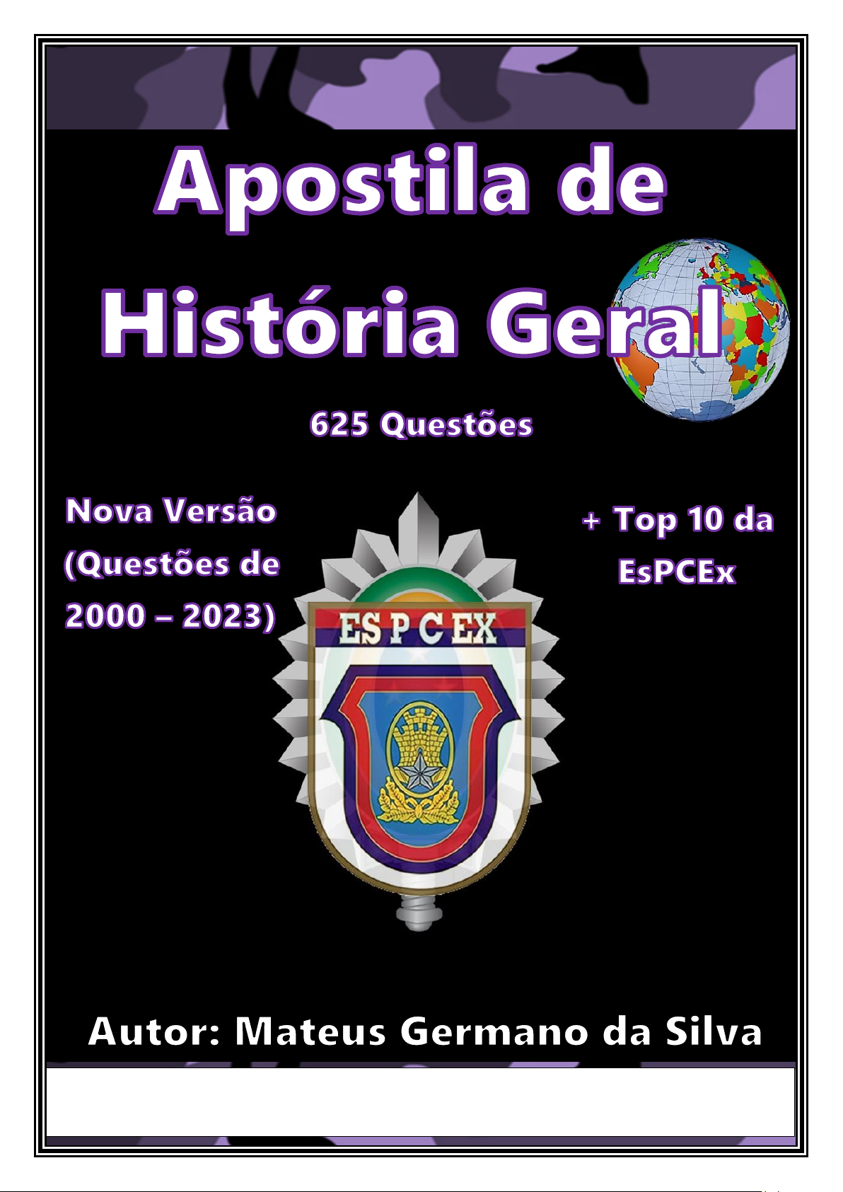 Aluno: . + Top 10 da (Questões de Autor: Mateus Germano da Silva Instagram: @mateus.germano.2001 Concursos Militares abordados: EsPCEx Sumário • Conteúdo Programático da EsPCEx--------------------------------------------------------- 4 • Relação de questões da EsPCEx em cada assunto ---------------------------------------- 5 • Top 10 de História da EsPCEx ---------------------------------------------------------------- 5 Idade Média ------------------------------------------------------------------------ 6 • Alta Idade Média – A Sociedade Feudal ---------------------------------------------------- 6 ➢ Gabarito --------------------------------------------------------------------------------------- 12 • Baixa Idade Média e a Crise do Feudalismo ---------------------------------------------- 13 ➢ Gabarito --------------------------------------------------------------------------------------- 22 Idade Moderna ------------------------------------------------------------------- 23 • Renascimento Cultural e Humanismo ----------------------------------------------------- 23 ➢ Gabarito --------------------------------------------------------------------------------------- 27 • Reforma Protestante e a Contrarreforma ------------------------------------------------- 28 ➢ Gabarito --------------------------------------------------------------------------------------- 34 • Absolutismo e Mercantilismo ---------------------------------------------------------------- 35 ➢ Estados Nacionais Europeus e Absolutismo --------------------------------------------- 35 ➢ Mercantilismo -------------------------------------------------------------------------------- 41 ➢ Gabarito --------------------------------------------------------------------------------------- 44 • Colonização Europeia na América --------------------------------------------------------- 45 ➢ Gabarito --------------------------------------------------------------------------------------- 53 • As Revoluções Inglesas e a Revolução Industrial ---------------------------------------- 54 ➢ Revoluções Inglesas (Século XVII) ------------------------------------------------------- 54 ➢ Revolução Industrial (Século XVIII) ----------------------------------------------------- 61 ➢ Gabarito --------------------------------------------------------------------------------------- 65 • Iluminismo e Despotismo Esclarecido ----------------------------------------------------- 66 ➢ Iluminismo ----------------------------------------------------------------------------------- 66 ➢ Despotismo Esclarecido -------------------------------------------------------------------- 71 ➢ Gabarito --------------------------------------------------------------------------------------- 72 • A Independência das 13 Colônias (EUA) -------------------------------------------------- 73 ➢ Gabarito --------------------------------------------------------------------------------------- 80 Idade Contemporânea ---------------------------------------------------------- 81 • A Revolução Francesa e a Restauração ---------------------------------------------------- 81 ➢ Revolução Francesa ------------------------------------------------------------------------- 81 ➢ Era Napoleônica ----------------------------------------------------------------------------- 86 ➢ A Restauração -------------------------------------------------------------------------------- 89 ➢ Gabarito --------------------------------------------------------------------------------------- 91 • O Pensamento e a Ideologia no Século XIX ----------------------------------------------- 92 ➢ Gabarito --------------------------------------------------------------------------------------- 95 • O Mundo na Época da Primeira Guerra Mundial -------------------------------------- 96 ➢ Imperialismo e a Partilha da África e da Ásia ------------------------------------------- 96 ➢ Primeira Guerra Mundial ----------------------------------------------------------------- 100 ➢ Gabarito ------------------------------------------------------------------------------------- 105 • Período entre Guerras ----------------------------------------------------------------------- 106 ➢ A Grande de Depressão (Crise de 29) --------------------------------------------------- 106 ➢ Ascensão do Nazifascismo Alemão e Italiano ----------------------------------------- 109 ➢ Gabarito ------------------------------------------------------------------------------------- 113 • Segunda Guerra Mundial ------------------------------------------------------------------- 114 ➢ Gabarito ------------------------------------------------------------------------------------- 121 • O Mundo na Guerra Fria ------------------------------------------------------------------- 122 ➢ Bloco Capitalista × Bloco Socialista ---------------------------------------------------- 122 ➢ Revoluções Socialistas -------------------------------------------------------------------- 127 ➢ Os Principais Conflitos da Guerra Fria ------------------------------------------------- 131 ➢ A Descolonização da África e da Ásia -------------------------------------------------- 134 ➢ Gabarito ------------------------------------------------------------------------------------- 139 • O Mundo no Final do Século XX e Início do Século XXI ----------------------------- 140 ➢ Fragmentação da URSS e a Queda do Socialismo ------------------------------------ 140 ➢ Conflitos do Final do Século XX e Início do Século XXI --------------------------- 144 ➢ Gabarito ------------------------------------------------------------------------------------- 146 Conteúdo Programático da EsPCEx • A Sociedade Feudal (séculos V a XV). • O Renascimento Comercial e Urbano. • Os Estados Nacionais Europeus da Idade Moderna, o Absolutismo e o Mercantilismo. 