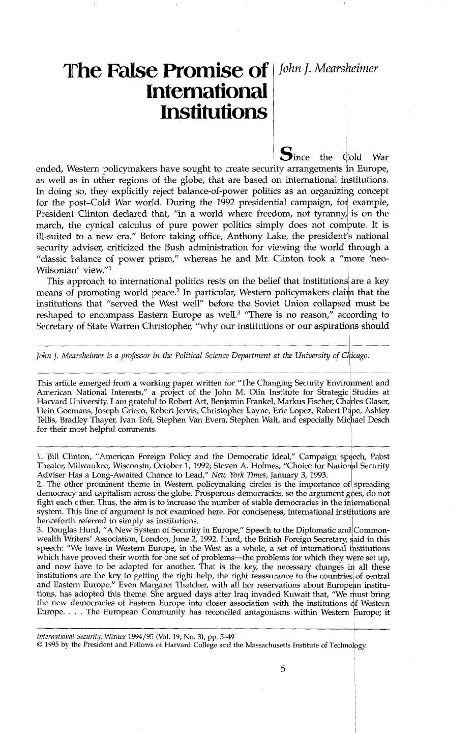 The False Promise of John J. Mearsheimer International Institutions S ince the Cold War ended, Western policymakers have sought to create security arrangements in Europe, as well as in other regions of the globe, that are based on international institutions. In doing so, they explicitly reject balance-of-power politics as an organizing concept for the post-Cold War world. During the 1992 presidential campaign, for example, President Clinton declared that, "in a world where freedom, not tyranny, is on the march, the cynical calculus of pure power politics simply does not compute. It is ill-suited to a new era." Before taking office, Anthony Lake, the president's national security adviser, criticized the Bush administration for viewing the world through a "classic balance of power prism," whereas he and Mr. Clinton took a "more 'neo- Wilsonian' view."¹ This approach to international politics rests on the belief that institutions are a key means of promoting world peace.² In particular, Western policymakers claim that the institutions that "served the West well" before the Soviet Union collapsed must be reshaped to encompass Eastern Europe as well.³ "There is no reason," according to Secretary of State Warren Christopher, "why our institutions or our aspirations should John J. Mearsheimer is a professor in the Political Science Department at the University of Chicago. This article emerged from a working paper written for "The Changing Security Environment and American National Interests," a project of the John M. Olin Institute for Strategic Studies at Harvard University. I am grateful to Robert Art, Benjamin Frankel, Markus Fischer, Charles Glaser, Hein Goemans, Joseph Grieco, Robert Jervis, Christopher Layne, Eric Lopez, Robert Pape, Ashley Tellis, Bradley Thayer, Ivan Toft, Stephen Van Evera, Stephen Walt, and especially Michael Desch for their most helpful comments. 1. Bill Clinton, "American Foreign Policy and the Democratic Ideal," Campaign speech, Pabst Theater, Milwaukee, Wisconsin, October 1, 1992; Steven A. Holmes, "Choice for National Security Adviser Has a Long-Awaited Chance to Lead," New York Times, January 3, 1993. 2. The other prominent theme in Western policymaking circles is the importance of spreading democracy and capitalism across the globe. Prosperous democracies, the argument goes, do not fight each other. Thus, the aim is to increase the number of stable democracies in the international system. This line of argument is not examined here. For conciseness, international institutions are henceforth referred to simply as institutions. 3. Douglas Hurd, "A New System of Security in Europe," Speech to the Diplomatic and Common- wealth Writers' Association, London, June 2, 1992. Hurd, the British Foreign Secretary, said in this speech: "We have in Western Europe, in the West as a whole, a set of international institutions which have proved their worth for one set of problems-the problems for which they were set up, and now have to be adapted for another. That is the key, the necessary changes in all these institutions are the key to getting the right help, the right reassurance to the countries of central and Eastern Europe." Even Margaret Thatcher, with all her reservations about European institu- tions, has adopted this theme. She argued days after Iraq invaded Kuwait that, "We must bring the new democracies of Eastern Europe into closer association with the institutions of Western Europe. The European Community has reconciled antagonisms within Western Europe; it International Security, Winter 1994/95 (Vol. 19, No. 3), pp. 5-49 © 1995 by the President and Fellows of Harvard College and the Massachusetts Institute of Technology. 5International Security 19:3 6 stop at [the] old frontiers of the Cold The institutions he has in mind include the European Community (EC), the North Atlantic Treaty Organization (NATO), the Conference on Security and Cooperation in Europe (CSCE), and the Western European Union (WEU). No single institution is expected to play a dominating role in Europe, however; instead, the aim is to create "a framework of complementary, mutually reinforcing" institutions. "We can promote more durable European security," Christo- pher claims, "through interlocking structures, each with complementary roles and No other region of the world has institutions as extensive and as well-developed as those in Europe. Consequently, Western policymakers trumpet the importance of creat- ing webs of overlapping institutions outside of Europe. Special emphasis is placed on Asia, where there are only a few weak institutions, and where fear of Japan, coupled with the rise of China and the prospect of a further reduction in the American presence, has observers worried about future stability in the region.⁷ There has also been a recent wave of academic interest in institutions. Academic institutionalists, not surprisingly, consider institutions to be a powerful force for stabil- ity.⁸ Robert Keohane, for example, declares that, "avoiding military conflict in Europe after the Cold War depends greatly on whether the next decade is characterized by a continuous pattern of institutionalized cooperation."⁹ Commenting on the aftermath of the Soviet collapse and the end of the Cold War, John Ruggie maintains that "there seems little doubt that multilateral norms and institutions have helped stabilize their international consequences. Indeed, such norms and institutions appear to be playing should now help to overcome divisions between East and West in Europe." Margaret Thatcher, "Shaping A New Global Community," Speech to the Aspen Institute, Aspen, Colorado, August 5, 1990. 4. Warren Christopher, "Toward a More Integrated World," Statement at the Organization for Economic Cooperation and Development (OECD) Ministerial Meeting, Paris, June 8, 1994. Presi- dent Clinton and German Chancellor Helmut Kohl share the same view, as Clinton made clear when describing his private talks 