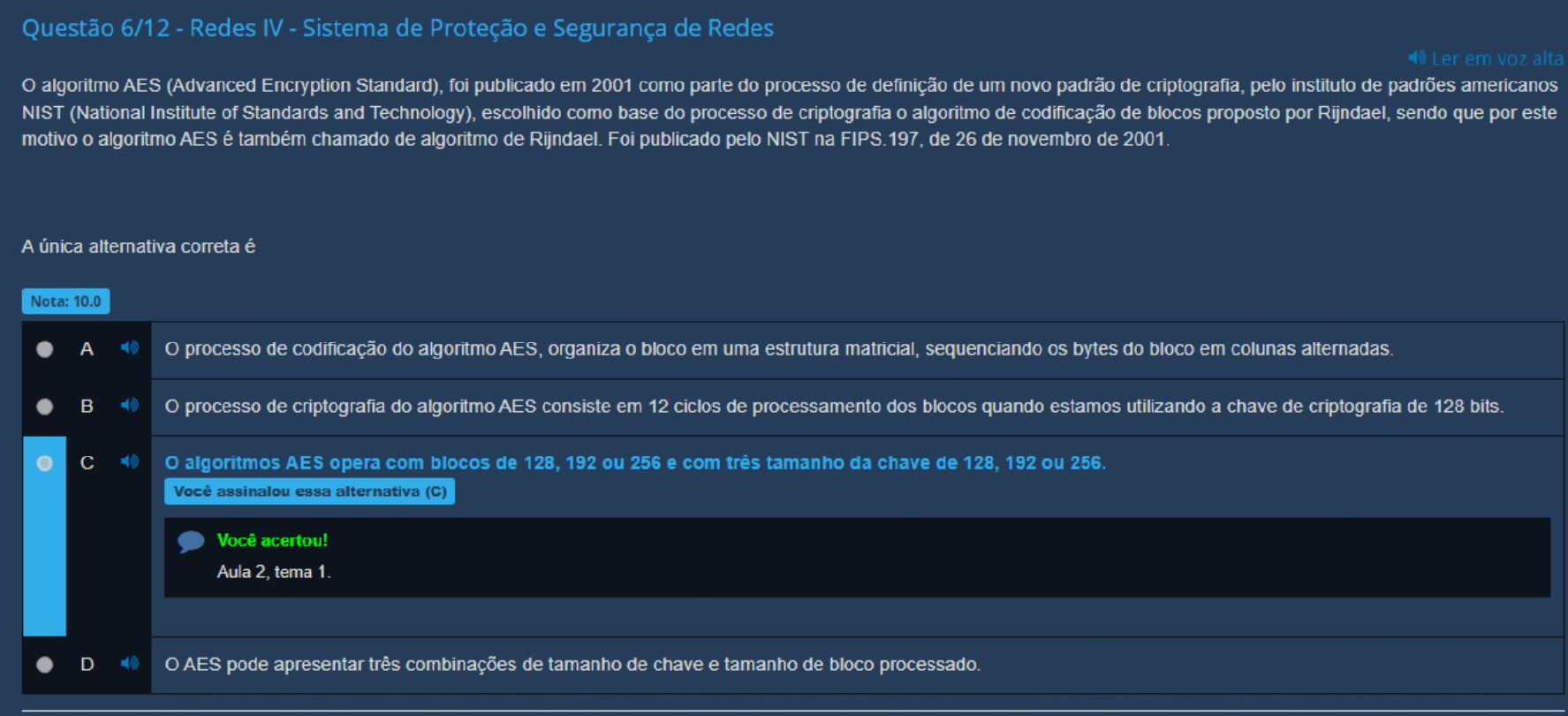Questão 6/12 - Redes IV - Sistema de Proteção e Segurança de Redes * Ler em voz alta O algoritmo AES (Advanced Encryption Standard), foi publicado em 2001 como parte do processo de definição de um novo padrão de criptografia, pelo instituto de padrões americanos NIST (National Institute of Standards and Technology), escolhido como base do processo de criptografia o algoritmo de codificação de blocos proposto por Rijndael, sendo que por este motivo o algoritmo AES é também chamado de algoritmo de Rijndael. Foi publicado pelo NIST na FIPS.197, de 26 de novembro de 2001. A única alternativa correta é O A “ Oprocessode codificaçãodo algoritmo AES, organiza o bloco em uma estrutura matricial, sequenciando os bytes do bloco em colunas alternadas. O B “ O processo de criptografia do algoritmo AES consiste em 12 ciclos de processamento dos blocos quando estamos utilizando a chave de criptografia de 128 bits. C * O algoritmos AES opera com blocos de 128, 192 ou 256 e com trés tamanho da chave de 128, 192 ou 256. Vocé assinalou essa alternativa (C) @ Vocé acertou! Aula 2, tema 1. O D “ OAES pode apresentar trés combinacdes de tamanho de chave e tamanho de bloco processado. Questão 6/12 - Redes IV - Sistema de Proteção e Segurança de Redes * Ler em voz alta O processo de descriptografia do algoritmo AES ocorre pela execução de quatro etapas distintas, realizando o processo inverso da criptografia. O processo de adição de chaves, realizado na terceira etapa da descriptografia, consiste na execução da funcdo OU Exclusivo da saida resultante das duas etapas anteriores com as quatro palavras da tabela de chave. Considerando as informacdes acima, avalie as assercdes a seguir e a relacdo proposta entre elas. | - A aplicação da chave de descriptografia, € a mesma que foi utilizada no processo de criptografia PORQUE 11 - o algoritmo AES é um processo que emprega chaves simétricas. A respeito dessas asserções, assinale a opção correta. A ' Asassergdes | e Il sio proposigdes verdadeiras, e a |l é uma justificativa correta da |. Vocé assinalou essa alternativa (A) @ Vocé acertou! Aula 3, tema 2. ® B