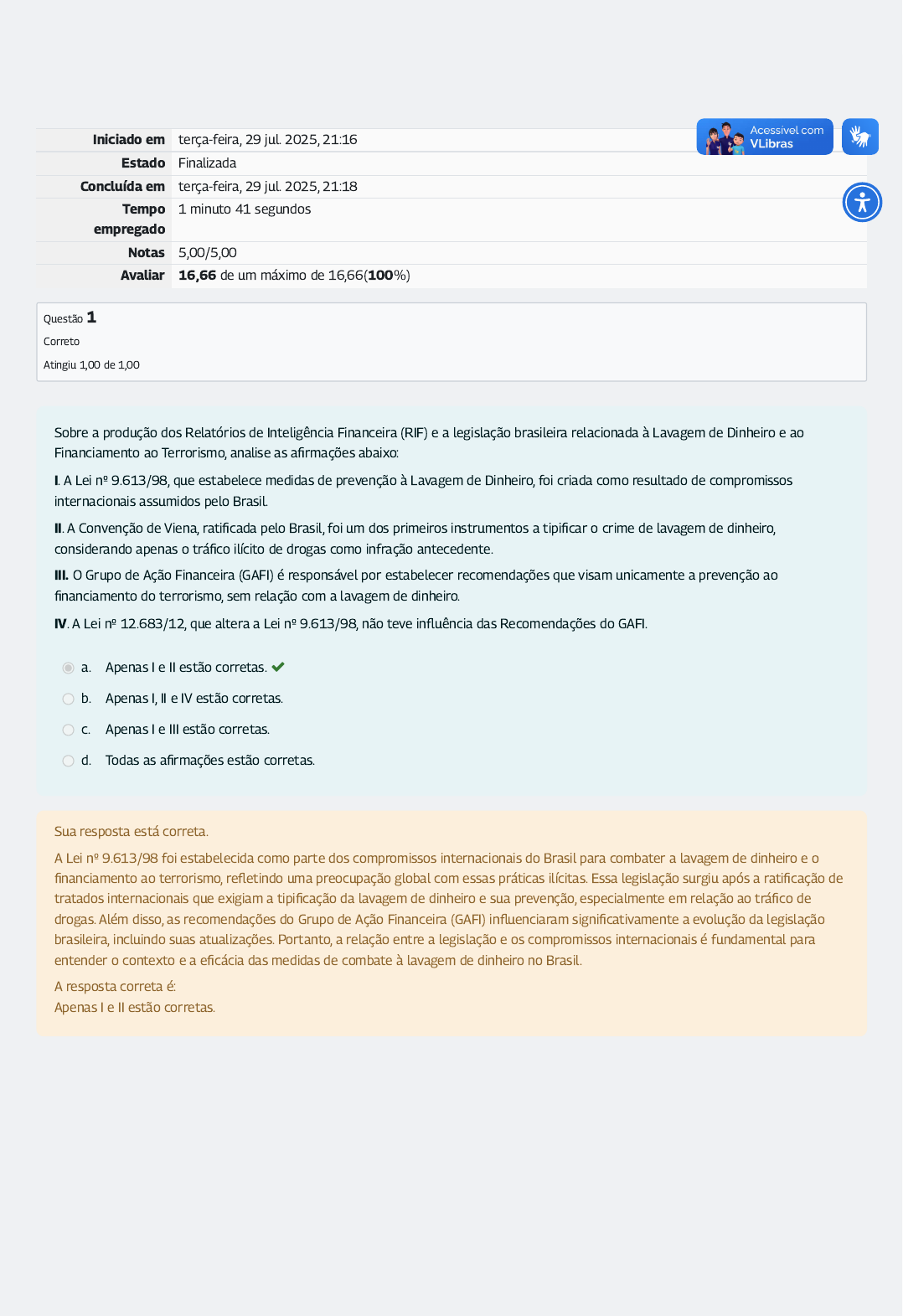 Iniciado em terça-feira, 29 jul. 2025, 21:16 Estado Finalizada Concluída em terça-feira, 29 jul. 2025, 21:18 Tempo empregado 1 minuto 41 segundos Notas 5,00/5,00 Avaliar 16,66 de um máximo de 16,66(100%) Questão 1 Correto Atingiu 1,00 de 1,00 Sobre a produção dos Relatórios de Inteligência Financeira (RIF) e a legislação brasileira relacionada à Lavagem de Dinheiro e ao Financiamento ao Terrorismo, analise as afirmações abaixo: I. A Lei nº 9.613/98, que estabelece medidas de prevenção à Lavagem de Dinheiro, foi criada como resultado de compromissos internacionais assumidos pelo Brasil. II. A Convenção de Viena, ratificada pelo Brasil, foi um dos primeiros instrumentos a tipificar o crime de lavagem de dinheiro, considerando apenas o tráfico ilícito de drogas como infração antecedente. III. O Grupo de Ação Financeira (GAFI) é responsável por estabelecer recomendações que visam unicamente a prevenção ao financiamento do terrorismo, sem relação com a lavagem de dinheiro. IV. A Lei nº 12.683/12, que altera a Lei nº 9.613/98, não teve influência das Recomendações do GAFI. a. Apenas I e II estão corretas. b. Apenas I, II e IV estão corretas. c. Apenas I e III estão corretas. d. Todas as afirmações estão corretas. Sua resposta está correta. A Lei nº 9.613/98 foi estabelecida como parte dos compromissos internacionais do Brasil para combater a lavagem de dinheiro e o financiamento ao terrorismo, refletindo uma preocupação global com essas práticas ilícitas. Essa legislação surgiu após a ratificação de tratados internacionais que exigiam a tipificação da lavagem de dinheiro e sua prevenção, especialmente em relação ao tráfico de drogas. Além disso, as recomendações do Grupo de Ação Financeira (GAFI) influenciaram significativamente a evolução da legislação brasileira, incluindo suas atualizações. Portanto, a relação entre a legislação e os compromissos internacionais é fundamental para entender o contexto e a eficácia das medidas de combate à lavagem de dinheiro no Brasil. A resposta correta é: Apenas I e II estão corretas. Questão 2 Correto Atingiu 1,00 de 1,00 Na Abordagem Baseada em Risco (ABR), os recursos limitados devem ser empregados da maneira mais eficiente possível, de maneira a distribuir: a. Para as fontes de maiores riscos, a menor atenção. b. Para as fontes de maiores riscos, a maior atenção. c. Atenção equilibrada para todas as fontes de risco, independentemente do tamanho de risco que representam. d. Para as fontes de menor risco, maior atenção. Sua resposta está correta. Na Abordagem Baseada em Risco (ABR), a alocação de recursos deve ser feita de forma a concentrar esforços e atenção nas áreas que apresentam maior risco. Isso significa que atividades, setores ou fontes identificadas como mais propensas a riscos devem receber mais atenção e monitoramento, garantindo assim uma utilização mais eficiente e eficaz dos recursos disponíveis. Essa estratégia visa maximizar a prevenção e a detecção de atividades ilícitas, como a lavagem de dinheiro e o financiamento do terrorismo. A resposta correta é: Para as fontes de maiores riscos, a maior atenção. Questão 3 Correto Atingiu 1,00 de 1,00 As medidas de Prevenção à Lavagem de Dinheiro e Financiamento ao Terrorismo estão estruturadas em quais ações? a. Prevenção de compra e venda de moeda estrangeira ou ouro como ativo financeiro ou instrumento cambial. b. Captação, intermediação e comunicação de operações suspeitas de recursos financeiros de terceiros, em moeda nacional ou estrangeira. c. Manutenção de registros e monitoração de empresas de transporte e guarda de valores. d. Identificação dos clientes, manutenção de registros e comunicação de operações suspeitas. Sua resposta está correta. As medidas de prevenção à lavagem de dinheiro e ao financiamento do terrorismo são fundamentadas em ações que incluem a identificação adequada dos clientes (Know Your Customer - KYC), a manutenção de registros das transações e operações realizadas, e a comunicação de quaisquer operações suspeitas às autoridades competentes. Essas ações são essenciais para monitorar e detectar atividades financeiras ilegais, assegurando a conformidade com as legislações pertinentes e as recomendações internacionais. A resposta correta é: Identificação dos clientes, manutenção de registros e comunicação de operações suspeitas. Questão 4 Correto Atingiu 1,00 de 1,00 Nas alternativas abaixo, assinale aquela que apresenta respectivamente: Órgão com competência para processar e julgar o crime de lavagem de dinheiro; Órgãos com atribuição de realizar investigações sobre o crime de lavagem de dinheiro. a. Ministério Público Federal, Banco Central do Brasil e Polícia Federal. b. Justiça Federal, Polícia Federal e Ministério Público Federal. c. COAF, Justiça Federal e Polícia Federal. d. Polícia Federal e Ministério Público. Sua resposta está correta. O processamento e julgamento do crime de lavagem geralmente ocorrem na Justiça Federal, especialmente em casos envolvendo infrações penais relacionadas ao sistema financeiro nacional. Já as investigações são realizadas por órgãos competentes, como a Polícia Federal e o Ministério Público, que têm a atribuição de reunir evidências e promover a ação penal. A compreensão das funções de cada órgão é essencial para entender a estrutura de combate à lavagem de dinheiro no Brasil. A resposta correta é: Justiça Federal, Polícia Federal e Ministério Público Federal. Questão 5 Correto Atingiu 1,00 de 1,00 Assinale a alternativa que apresenta alguns dos critérios objetivos que permitem as pessoas obrigadas comunicarem ao COAF transações suspeitas, de acordo com a Lei 9.613/98: I- Transações possíveis de serem convertidas em dinheiro. II- Transações que possuem indícios de crimes financeiros. III- Valore