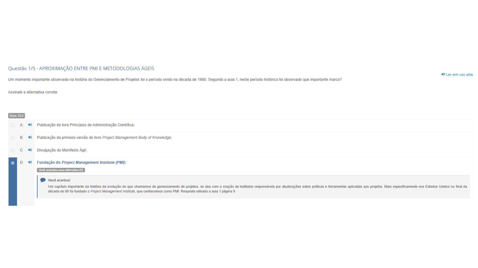 Questão 1/5 APROXIMAÇÃO ENTRE PMI E METODOLOGIAS ÁGEIS Ler em voz alta Um momento importante observado na história do Gerenciamento de Projetos foi 0 período vivido na década de 1960. Segundo a aula 1, neste período histórico foi observado que importante marco? Assinale a alternativa correta: Nota: 20.0 A Publicação do livro Princípios de Administração Científica; Publicação da primeira versão do livro Project Management Body of Knowledge; C Divulgação do Manifesto Ágil; D Fundação do Project Management Institute (PMI); Você assinalou essa alternativa (D) Você acertou! Um capítulo importante da história da evolução do que chamamos de gerenciamento de projetos, se deu com a criação de institutos responsáveis por atualizações sobre práticas e ferramentas aplicadas aos projetos. Mais especificamente nos Estados Unidos no final da década de 60 foi fundado 0 Project Management Institute, que conhecemos como PMI. Resposta retirada a aula 1 página 9.Questão 2/5 APROXIMAÇÃO ENTRE PMI E METODOLOGIAS ÁGEIS Ler em voz alta 0 framework Scrum é composto por rituais e papéis que se relacionam ao longo do andamento do projeto. Um papel importante é desempenho pela figura do Product Owner. Conforme abordado na aula 5, analise as assertivas que seguem e marque V para as asserções verdadeiras, e F para as asserções falsas. Product Owner responde pelo gerenciamento total do backlog do produto. Assim, para que 0 backlog seja completamente gerenciado, é necessário que ele informe de maneira clara, itens que compõem 0 backlog do produto; Ao Product Owner não cabe a missão de ordenar por prioridade itens que compõem 0 backlog. Esta tarefa é de responsabilidade do Scrum Master; Product Owner não possui hierarquia para com 0 resultado do projeto; 0 Product Owner não é um comitê ou uma junção de pessoas, mas sim, um indivíduo que opera no projeto com estas responsabilidades. Ele deve representar as intenções e 0 desejo dos interessados com 0 resultado do projeto; Assinale a alternativa correta: Nota: 20.0 A V-V-V-V V-F-F-V Você assinalou essa alternativa (B) Você acertou! Ao Product Owner cabe a missão de ordenar por prioridade itens que compõem 0 backlog e também auxiliar na garantia do valor do trabalho que está sendo construído pelo time de desenvolvimento. Para isso, é importante garantir que 0 backlog seja visível, acessível a todos de forma clara, e também apresentar para 0 time Scrum que conduzirá trabalhos do projeto. Product Owner também possui certa hierarquia para com 0 resultado do projeto, e para que a instituição em que 0 projeto está sendo realizado obtenha sucesso na experiência com 0 Scrum, deve respeitar as indicações do Product Resposta retirada da aula 5 página 8. C V-V-F-V D V-V-V-FQuestão 3/5 APROXIMAÇÃO ENTRE PMI E METODOLOGIAS ÁGEIS Ler em voz alta 0 gerenciamento de projetos é uma prática humana utilizada a milhares de ano. É possível perceber utilização de projetos nas mais distintas civilizações por todo mundo. Conforme 0 conteúdo trabalhado na aula 1, assinale a alternativa que apresenta a perspectiva histórica do gerenciamento de projetos: Nota: 20.0 A gerenciamento de projetos é uma prática que não evoluiu ao longo do tempo; Existe grande evolução nas práticas e na aplicação do gerenciamento de projetos ao longo do tempo; Você assinalou essa alternativa (B) Você acertou! Resposta Esperada: Existe grande evolução nas práticas e na aplicação do gerenciamento de projetos ao longo do tempo; Comentário: gerenciamento de projetos passa por mutações e evoluções ao longo do tempo. Assim como qualquer outra atividade humana desempenhada a séculos, é possível perceber uma evolução consistente na prática e no ferramental disponível para a execução de um projeto, independentemente de sua área de aplicação. Texto base aula 1 página 3. C Como técnica, 0 gerenciamento de projetos é utilizado somente pela área de construção civil ao longo dos séculos; D A evolução do gerenciamento de projetos não possui relação gerenciamento ágil de projetos;Questão 4/5 APROXIMAÇÃO ENTRE PMI E METODOLOGIAS ÁGEIS Ler em voz alta 0 entendimento dos eventos pertencentes ao Scrum, bem como a sua intenção reduz a necessidade de realização de reuniões não planejadas e torna trabalhos mais organizados. Os eventos necessários para que 0 projeto aconteça de forma correta são importantes para 0 Scrum. Com base na aula 5, assinale a alternativa que indica 0 evento que é limitado a aproximadamente um mês, pois nesse período, podem ser realizadas todas as verificações e a construção de parte significativa de um projeto. Sobre este evento, também é correto afirmar que, após este período de aproximadamente um mês, é necessária a sua revisão, pois, se alguma parte do projeto não está de acordo com 0 planejamento, é importante revisar e também corrigir pacotes de trabalho. Este evento é conhecido como: Nota: 20.0 A Reunião Diária; Revisão do Sprint; C Retrospectiva do Sprint; D Sprint; Você assinalou essa alternativa (D) Você acertou! É importante enfatizar a necessidade do Sprint ser limitado a aproximadamente um mês. Isso porque neste período, podem ser realizadas todas as verificações e a construção de parte significativa de um projeto. Depois é importante a realização da revisão, pois, se alguma parte do projeto não está de acordo com 0 planejamento, é importante revisar e também corrigir pacotes de trabalho. Resposta retirada da aula 5 página 11.Questão 5/5 APROXIMAÇÃO ENTRE PMI E METODOLOGIAS ÁGEIS Ler em voz alta Em seu cerne, 0 Scrum é embasado em teorias empíricas, ou seja, ele se baseia no empirismo, pois idealiza que 0 conhecimento provém da experimentação realizada em cada ambiente. Assim, 0 conhecimento sobre determinada área é a justificativa para uma determinada tomada de decisão. Neste sentido, 0 framework se ba