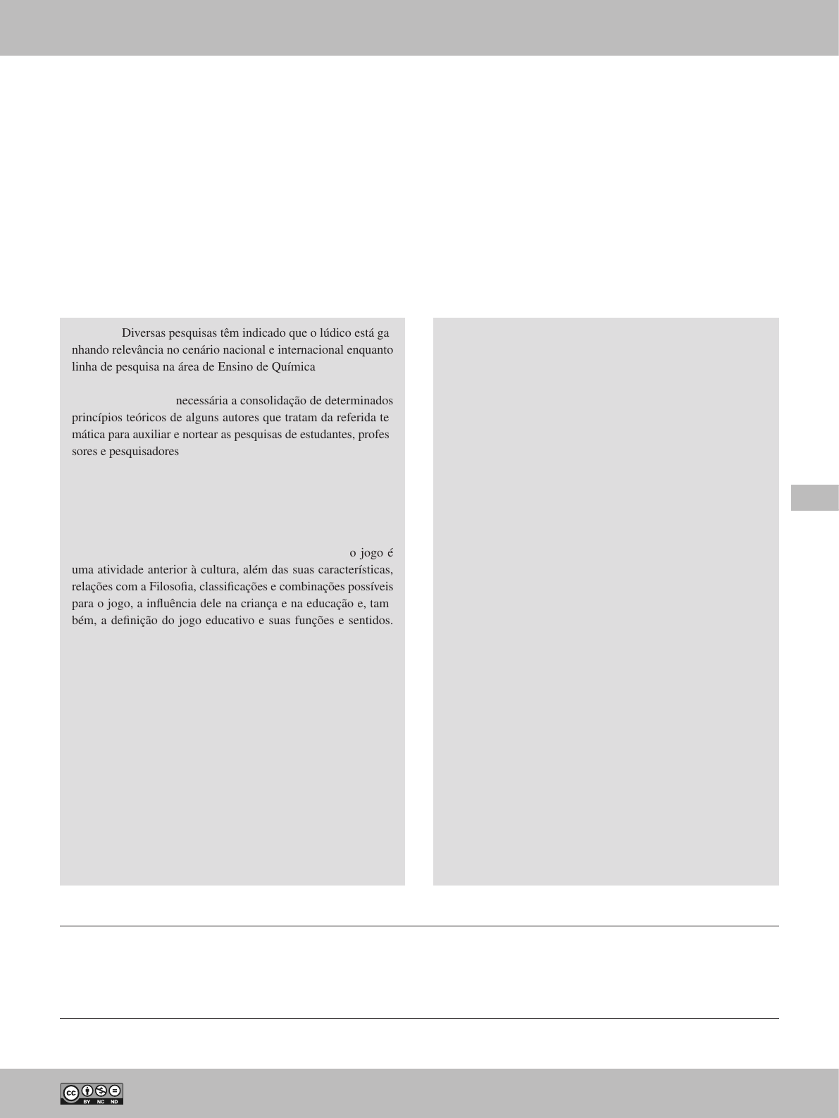 Cadernos de Pesquisa 41 Quím. Nova Esc. – São Paulo-SP, BR Vol. 46, N° 1, p. 41-59, FEVEREIRO 2024 Este é um artigo de acesso aberto distribuído sob os termos da Licença de Atribuição Creative Commons Cleberson Souza da Silva (cleberson@ufpi.edu.br), licenciado em Química pelo Instituto Federal do Goiás, mestre em Química pela Universidade Federal de Goiás e doutorando em Educação em Ciências pela Universidade de Brasília. Atualmente é professor assistente da Universidade Federal do Piauí. Teresina, PI - BR. Eduardo Luiz Dias Cavalcanti (eldcavalcanti@unb.br), licenciado em Química pela Universidade Federal de Goiás, mestre e doutor em Química pela Universidade Federal de Goiás. Atualmente é professor associado da Universidade de Brasília. Brasília, DF - BR. Recebido em 30/01/2023, aceito em 01/04/2023 Autores clássicos e contemporâneos do lúdico: aspectos teóricos e epistemológicos e suas contribuições para o Ensino de Química Classic and contemporary authors on ludic: theoretical and epistemological aspects and their contributions to Chemistry Teaching Cleberson S. Silva e Eduardo Luiz D. Cavalcanti Resumo: Diversas pesquisas têm indicado que o lúdico está ga- nhando relevância no cenário nacional e internacional enquanto linha de pesquisa na área de Ensino de Química. Nesse contex- to, entendemos, devido à emergência da mencionada linha de pesquisa, que se faz necessária a consolidação de determinados princípios teóricos de alguns autores que tratam da referida te- mática para auxiliar e nortear as pesquisas de estudantes, profes- sores e pesquisadores. A fim de sanar tal necessidade, este artigo de caráter teórico visa apresentar e desvelar alguns dos principais aspectos teóricos e epistemológicos propostos por autores clás- sicos e contemporâneos, além de apontar algumas das principais contribuições destes últimos para o lúdico na área de Ensino de Química. Para cumprir tal objetivo, dividimos este texto em três partes.Na primeira, abordamos o pressuposto de que o jogo é uma atividade anterior à cultura, além das suas características, relações com a Filosofia, classificações e combinações possíveis para o jogo, a influência dele na criança e na educação e, tam- bém, a definição do jogo educativo e suas funções e sentidos. Na segunda parte, apresentamos as considerações históricas em relação à utilização do jogo no contexto do Ensino de Química, os termos necessários para a utilização do mencionado material didático nas aulas de Química, os entrelaçamentos entre lúdico e processo de ensino e aprendizagem e o ato avaliativo da já men- cionada disciplina, do jogo educativo, perpassando suas subdivi- sões em didático e pedagógico, e, por fim, novas possibilidades de utilização do jogo educativo por meio de ambientes virtuais de aprendizagem. Por último, na terceira parte deste texto, evi- denciamos as principais contribuições e implicações que este artigo pode apresentar para o Ensino de Química, sobretudo na linha de pesquisa do lúdico, além de apontar as suas limitações. Palavras-chave: jogos, teóricos do lúdico, lúdico no ensino de química. Abstract: Several researches have indicated that the ludic is gaining relevance in the national and international scene as a line of research within the area of Chemistry Teaching. Due to the emergence of the aforementioned line of research, it is necessary to consolidate certain theoretical principles of authors who deal with the aforementioned theme to help and guide the research of students, teachers and researchers. This theoretical article aims to present and unveil some of the main theoretical and epistemo- logical aspects proposed by classic and contemporary authors, in addition to pointing out some of the main contributions of the latter to the ludic in the area of Chemistry Teaching. In order to fulfill this objective, this text is organized in three parts. The first addresses the assumption that the game is an activity prior to cul- ture; its characteristics; relations with Philosophy; classifications and possible combinations for the game; its influence on children and education; and also the definition of educational games, their functions and meanings. In the second part, we show the historical considerations regarding the use of the game in the context of Chemistry Teaching; some terms necessary for the use of the aforementioned didactic material in Chemistry classes; the interweaving between the ludic and the teaching and learning process and the evaluative act of the aforementioned discipline; the educational game and its subdivisions into didactic and pe- dagogical; and new possibilities of using the educational game through virtual learning environments. Finally, in the third part, we point out the main contributions and implications that this ar- ticle can present for Chemistry Teaching, especially in the ludic research line, in addition to showing its limitations. Key words: games, ludic theorists, ludic in chemistry teaching. http://dx.doi.org/10.21577/0104-8899.20160347 A seção “Cadernos de Pesquisa” é um espaço dedicado exclusivamente para artigos inéditos (empíricos, de revisão ou teóricos) que apresentem profundidade teórico-metodológica, gerem conhecimentos novos para a área e contribuições para o avanço da pesquisa em Ensino de Química. Silva e Cavalcanti 42 Autores clássicos e contemporâneos do lúdico Vol. 46, N° 1, p. 41-59, FEVEREIRO 2024Quím. Nova Esc. – São Paulo-SP, BR Conforme Huizinga (2019), jogo consiste em uma ação livre, fictícia e situada fora da vida comum, desprovida de qualquer interesse material e de qualquer utilidade, que se realiza em um tempo e espaço expressamente circunscritos, desenrolando-se com ordem de acordo com regras estabelecidas e produzindo, na vida e nas relações de grupo que voluntaria- mente se cercam de mistério ou acentuam pelo disf