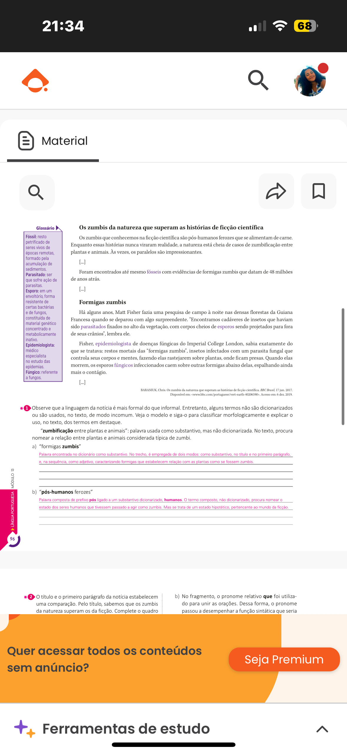 21:34 68 Material Glossário Os zumbis da natureza que superam as histórias de ficção científica Fóssil: resto Os zumbis que conhecemos na ficção científica são pós-humanos ferozes que se alimentam de carne. petrificado de seres vivos de Enquanto essas histórias nunca viraram realidade, a natureza está cheia de casos de zumbificação entre épocas remotas, plantas e animais. vezes, os paralelos são impressionantes. formado pela acumulação de [...] sedimentos. Parasitado: ser Foram encontrados até mesmo fósseis com evidências de formigas zumbis que datam de 48 milhões que sofre ação de de anos atrás. parasitas. Esporo: em um [...] forma resistente de Formigas zumbis certas bactérias e de fungos, Há alguns Matt Fisher fazia uma pesquisa de campo à noite nas densas florestas da Guiana constituída de Francesa quando se deparou com algo surpreendente. "Encontramos cadáveres de insetos que haviam material genético concentrado sido parasitados fixados no alto da vegetação, com corpos cheios de esporos sendo projetados para fora metabolicamente de seus crânios", lembra ele. Epidemiologista: epidemiologista de doenças fúngicas do Imperial College London. sabia exatamente do médico que se tratava: restos mortais das "formigas zumbis", insetos infectados com um parasita fungal que especialista controla seus corpos e mentes, fazendo elas rastejarem sobre plantas, onde ficam presas. Quando elas no estudo das epidemias. morrem. os esporos fúngicos infeccionados caem sobre outras formigas abaixo delas, espalhando ainda Fúngico: referente mais contágio. fungos. [...] Chris Os zumbis da natureza que superam as histórias de BBC Brasil, 17 2017. Disponível em dez 2019 Observe que a linguagem da notícia é mais formal do que informal. Entretanto, alguns termos não são dicionarizados ou são usados, no texto, de modo incomum. Veja modelo e siga-o para classificar morfologicamente e explicar uso, no texto, dos termos em destaque. "zumbificação entre plantas e animais": palavra usada como substantivo, mas não dicionarizada. No texto, procura nomear a relação entre plantas e animais considerada típica de zumbi. a) "formigas zumbis" Palavra encontrada no dicionário como No trecho, é empregada de dois modos: como substantivo, no título e no primeiro parágrafo, e, na sequência, como adjetivo, caracterizando formigas que estabelecem relação com as plantas como se fossem zumbis. 13 b) ferozes" Palavra composta de prefixo pós ligado a um substantivo humanos termo composto, não dicionarizado, procura nomear estado dos seres humanos que tivessem passado a agir como zumbis. Mas se trata de um estado hipotético, pertencente ao mundo da 96 2 título e primeiro parágrafo da notícia estabelecem b) No fragmento, pronome relativo que foi utiliza- uma comparação. Pelo título, sabemos que os zumbis do para unir as orações. Dessa forma, pronome da natureza superam os da ficção. Complete quadro passou a desempenhar a função sintática que seria Quer acessar todos os conteúdos Seja Premium sem anúncio? Ferramentas de estudo