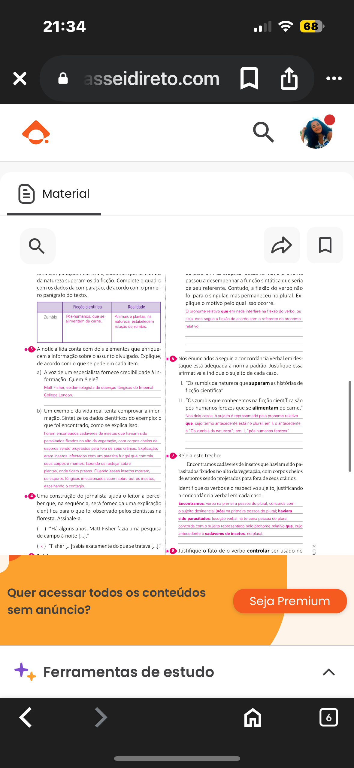 21:34 68 X asseidireto.com Material da natureza superam da ficção. Complete quadro passou a desempenhar a função sintática que seria com dados da comparação, de acordo com primei- de seu referente. Contudo, a flexão do verbo não ro parágrafo do foi para singular, mas permaneceu no plural. Ex- plique motivo pelo qual isso ocorre. Ficção Realidade pronome relativo que em nada interfere na flexão do ou Zumbis Pós-humanos, que se Animais plantas, na seja, este segue flexão de acordo com referente do pronome alimentam de natureza, estabelecem relação de zumbis. A notícia lida conta com dois elementos que enrique- cem a informação sobre assunto divulgado. Explique, Nos enunciados a seguir, a concordância verbal em des- de acordo com que se pede em cada item. taque está adequada à norma-padrão. Justifique essa a) A de um especialista fornece credibilidade à in- afirmativa e indique sujeito de cada caso. formação. Quem é ele? "Os zumbis da natureza que superam as histórias de Matt Fisher, epidemiologista de doenças fúngicas do Imperial ficção científica" College II. "Os zumbis que conhecemos na ficção científica são b) Um exemplo da vida real tenta comprovar a infor- pós-humanos ferozes que se alimentam de carne." mação. Sintetize os dados científicos do exemplo: Nos dois casos, sujeito é representado pelo pronome relativo que foi encontrado, como se explica isso. que, cujo termo antecedente está no plural: em antecedente é "Os zumbis da em "pós-humanos ferozes". Foram encontrados cadáveres de insetos que haviam sido parasitados fixados no alto da vegetação, com corpos cheios de esporos sendo projetados para fora de seus crânios. Explicação: eram insetos infectados com um parasita fungal que controla Releia este trecho: seus corpos e mentes, fazendo-os rastejar sobre Encontramos cadáveres de insetos que haviam sido pa- plantas, onde ficam presos. Quando esses insetos morrem, rasitados fixados no alto da vegetação, com corpos cheios os esporos fúngicos infeccionados caem sobre outros insetos, de esporos sendo projetados para fora de seus crânios. espalhando contágio. Identifique os verbos e respectivo sujeito, justificando Uma construção do jornalista ajuda leitor a perce- a concordância verbal em cada caso. ber que, na sequência, será fornecida uma explicação Encontramos: verbo na primeira pessoa do plural, concorda com científica para que foi observado pelos cientistas na sujeito desinencial (nós) na primeira pessoa do plural; haviam floresta. Assinale-a. sido parasitados: locução verbal na terceira pessoa do plural, ( ) alguns anos, Matt Fisher fazia uma pesquisa concorda com sujeito representado pelo pronome relativo que, cujo de campo à noite [...]." antecedente é cadáveres de insetos, no (x) "Fisher [...] sabia exatamente do que se tratava [...]." 8 Justifique fato de verbo controlar ser usado no LO Quer acessar todos os conteúdos Seja Premium sem anúncio? Ferramentas de estudo 6