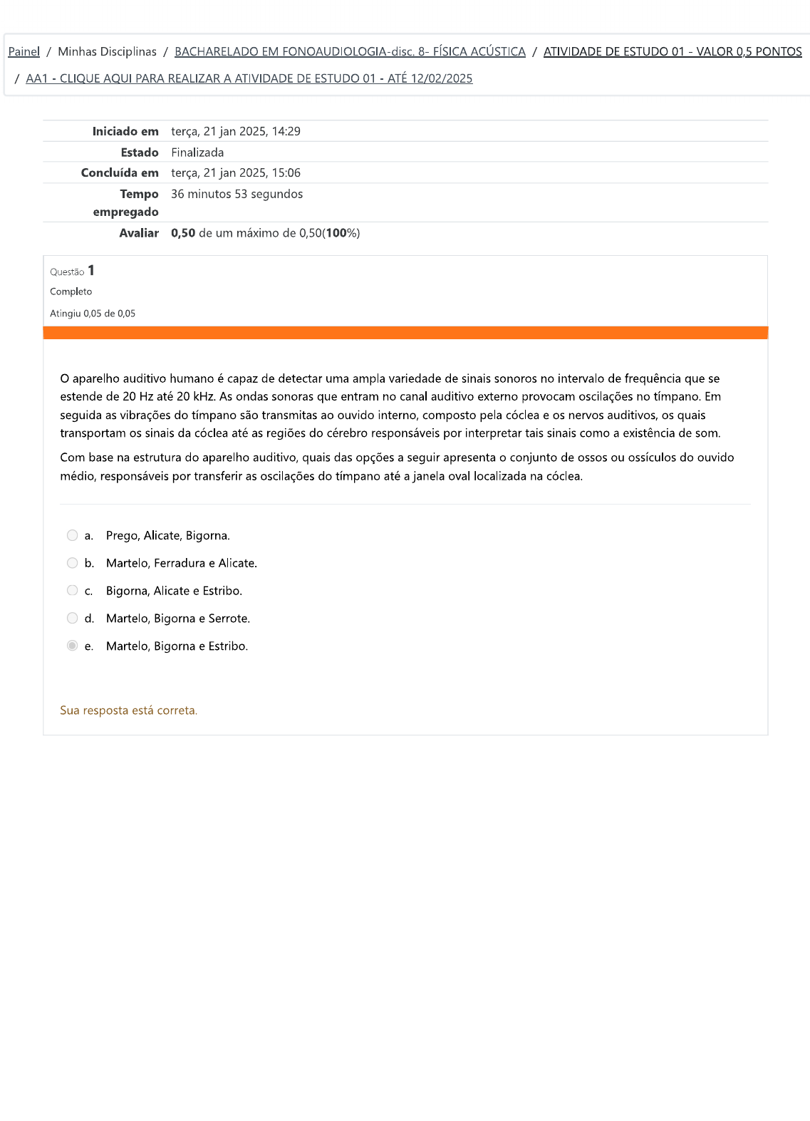 Painel / Minhas Disciplinas / BACHARELADO EM 8- FÍSICA ACÚSTICA / ATIVIDADE DE ESTUDO 01 VALOR 0,5 PONTOS / AA1 CLIQUE AQUI PARA REALIZAR A ATIVIDADE DE ESTUDO 01 ATÉ 12/02/2025 Iniciado em terça, 21 jan 2025, 14:29 Estado Finalizada Concluída em terça, 21 jan 2025, 15:06 Tempo 36 minutos 53 segundos empregado Avaliar 0,50 de um máximo de 0,50(100%) Questão 1 Completo Atingiu 0,05 de 0,05 O aparelho auditivo humano é capaz de detectar uma ampla variedade de sinais sonoros no intervalo de frequência que se estende de 20 Hz até 20 kHz. As ondas sonoras que entram no canal auditivo externo provocam oscilações no tímpano. Em seguida as vibrações do tímpano são transmitas ao ouvido interno, composto pela cóclea e os nervos auditivos, os quais transportam os sinais da cóclea até as regiões do cérebro responsáveis por interpretar tais sinais como a existência de som. Com base na estrutura do aparelho auditivo, quais das opções a seguir apresenta o conjunto de ossos ou ossículos do ouvido médio, responsáveis por transferir as oscilações do tímpano até a janela oval localizada na cóclea. a. Prego, Alicate, Bigorna. b. Martelo, Ferradura e Alicate. C. Bigorna, Alicate e Estribo. d. Martelo, Bigorna e Serrote. e. Martelo, Bigorna e Estribo. Sua resposta está correta.Questão 2 Completo Atingiu 0,05 de 0,05 Uma fonte sonora emite ondas que se propagam no ar com amplitude de pressão igual a e amplitude de deslocamento igual a A = Considere o módulo de compressibilidade do ar igual a 1,4 X 10⁵ Pa e a velocidade do som no ar a temperatura de 25 °C igual a v = 346 m/s. Determine qual das alternativas abaixo corresponde aos valores corretos para o comprimento de onda e a frequências das ondas produzidas pela fonte de som. a. f 1660 Hz b. f 1639 Hz C. f 1639 Hz d. 0,25 f 1000 Hz e. m 2639 Hz Sua resposta está correta. Questão 3 Completo Atingiu 0,05 de 0,05 Em certas situações é possível simplificar o trato vocal humano por um tubo com uma extremidade fechada e outra aberta, com comprimento médio L = 17 cm No caso, a extremidade aberta do tubo é a boca ao se abrir emitindo o som para o ambiente externo, enquanto que, a extremidade fechada está localizada nas pregas (cordas) vocais, que vibram com a passagem do ar produzindo som. Na verdade, o sistema vocal (sistema fonador) humano é mais complexo, sendo formado por várias partes que atuam em conjunto. pulmão e o músculo do diafragma atuam como geradores de pressão, forçando dos pulmões através da traqueia. Músculos específicos fazem as pregas vocais contraírem e relaxarem, provocando uma aproximação entre as mesmas e estreitando a passagem de an vinda dos pulmões e consequentemente gerando som que saí pela laringe. A cavidade oral e nasal, junto com a língua e os lábios atua em conjunto para articular a produção de diversos sons característicos da fala humana em diferentes culturas. Considerando a velocidade do som v 344 m/s, determine a frequência fundamental e as frequências dos 3 primeiros harmônicos (sobretons) possíveis para o comprimento do trato vocal informado no enunciado. a. 506 Hz, 1012 ≈ 1518 Hz 2024 Hz b. ≈ 1012 Hz, 2024 Hz, ≈ 3036 Hz 4048 Hz C. 1012 Hz, ≈ 3036 Hz, 5060 Hz f7 7084 Hz d. 506 Hz, ≈ 1518 Hz, ≈ 2530 Hz e f7 ≈ 3542 Hz e. f₁ 500 Hz, 1500 Hz, 2500 Hz e ≈ 3500 Hz Sua resposta está correta.Questão 4 Completo Atingiu 0,05 de 0,05 Dois funcionários de uma fábrica de estruturas metálicas transportam uma barra maciça de alumínio com comprimento L = 30 m (cujo módulo de Young é Y = 70 GPa e densidade = 2700 Devido ao barulho elevado da fábrica, os funcionários não conseguem conversar normalmente. Para garantir o posicionamento correto em que a barra de alumínio deve ser guinchada e transportada, os funcionários desenvolveram uma técnica de comunicação engenhosa, a qual consiste em bater levemente com um martelo na extremidade da barra. Quando um dos funcionários bate numa extremidade da barra, o outro funcionário escuta dois sons, um que se propaga pela barra e um segundo som que se propaga pelo ar. A temperatura da fábrica é T = Considerando que a massa molar do ar é M = 29 g/mol, determine de maneira aproximada a velocidade de propagação do som no ar da fábrica, na barra de alumínio bem como o intervalo At entre os dois sons. a. b. VAr 5000 m/s = 80 ms. C. VAr d. VAr = = 3249 m/s = 6 ms. e. = 5055 m/s e = 6 ms. Sua resposta está correta.Questão 5 Completo Atingiu 0,05 de 0,05 Um músico e artesão está tentando fabricar um instrumento usando canos de PVC com as duas extremidades abertas. instrumento deve produzir aproximadamente as frequências fundamentais das 7 notas músicais, ou seja: Dó ou C4 ≈ 262 Hz, Ré ou D4 ≈ 294 Hz, Mi ou E4 ≈ 330 Hz, Fá ou 349 Hz, Sol ou G4 = 392 Hz, Lá ou A4 440 Hz e Si ou B4 ≈ 494 Hz. O músico pretende usar 7 canos agrupados paralelamente, os quais serão cortados em comprimentos específicos para cada nota musical, ou seja: LA4 e Determine os comprimentos aproximados (em metros) de cada tubo, de modo que o instrumento possa produzir as notas desejadas pelo músico-artesão. Considere a velocidade do som v = 344 a. ≈ 0,60 m ≈ 0,59 ≈ 0,52 m, LF4 ≈ 0,49 m, 0,44 LA4 ≈ 0,39 m e LB4 ≈ b. ≈ 0,70 m ≈ 0,60 LE4 ≈ 0,50 m, LF4 ≈ 0,50 m, ≈ 0,44 m, ≈ 0,40 m e ≈ 0,35 m. C. ≈ 0,66 m ≈ 0,60 m, LE4 0,52 0,50 m, 0,44 m, LA4 ≈ 0,40 m e ≈ 0,35 m. d. ≈ 0,66 m ≈ 0,59 m, LE4 ≈ 0,52 m, ≈ 0,49 m, 0,44 m, LA4 ≈ 0,39 m e LB4 ≈ 0,35 m. e. ≈ 0,65 m ≈ 0,59 m, ≈ 0,52 ≈ 0,48 ≈ 0,43 m, LA4 ≈ 0,39 m e ≈ 0,30 m. Sua resposta está correta.Questão 6 Completo Atingiu 0,05 de 0,05 Numa competição de som automotivo um dos participantes está testando seus equipamentos antes de começar a batalha de som. Ele escolhe algumas frequências para testar cada tipo de fonte sonora que integra o sistema de som do seu veículo. Para os alto-falantes de baixa fre